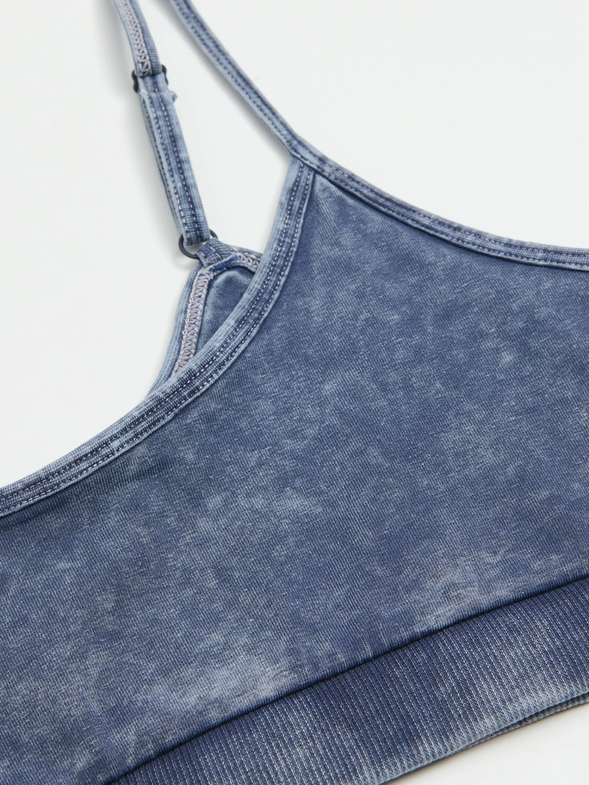 Damski sportowy biustonosz uszyty z elastycznej, bawełnianej dzianiny. Deseń powstał przy użyciu efektu oil wash, dając wrażenie spranego denimu. Nowość, której nie możesz przegapić! stanik o sportowym kroju bawełna z domieszką elastycznych włókien wąskie ramiączka z regulacją długości dół wykończony elastyczną gumą, która zapewnia komfort noszenia efekt sprania na całości gładkie wykończenie brzegów Tworzy zestaw z modelem 806AU-59X .