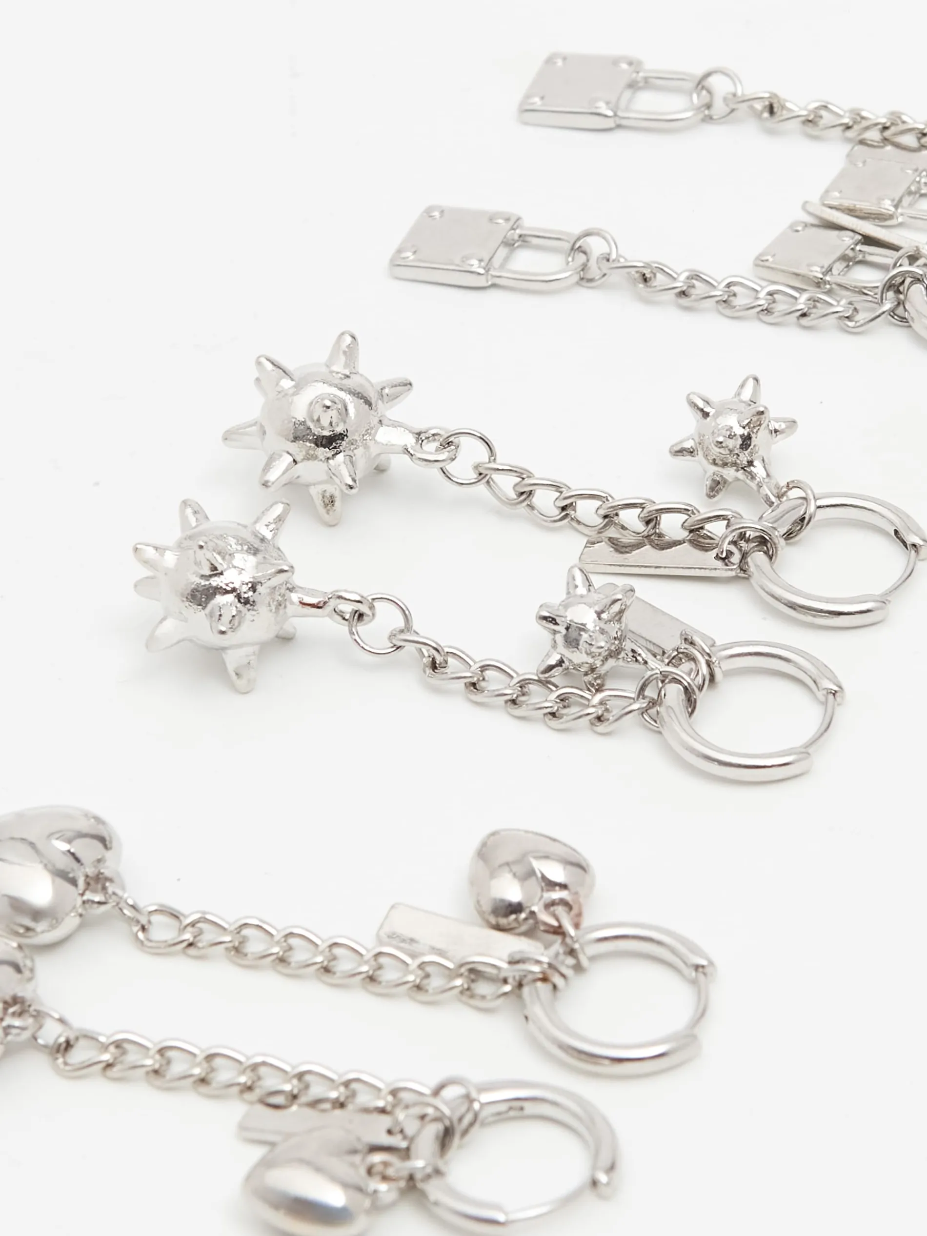 Zestaw 3 par damskich kolczyków, wykonanych ze srebrnego tworzywa. Każda para z innymi zawieszkami.