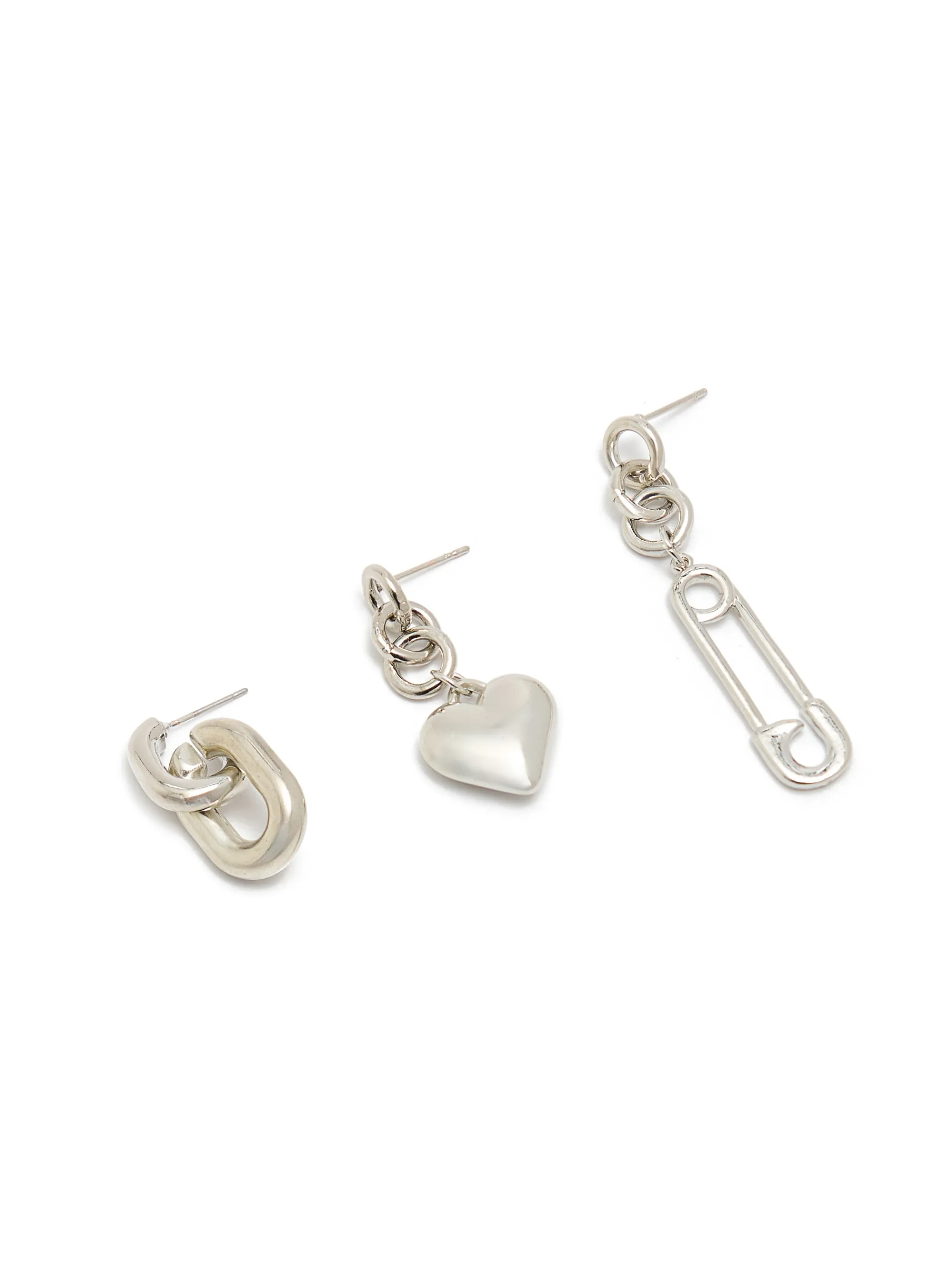Trójpak damskich kolczyków z zawieszkami w różnych kształtach – m. in. serca i agrafki. Wykonane z tworzywa w kolorze srebrnym.