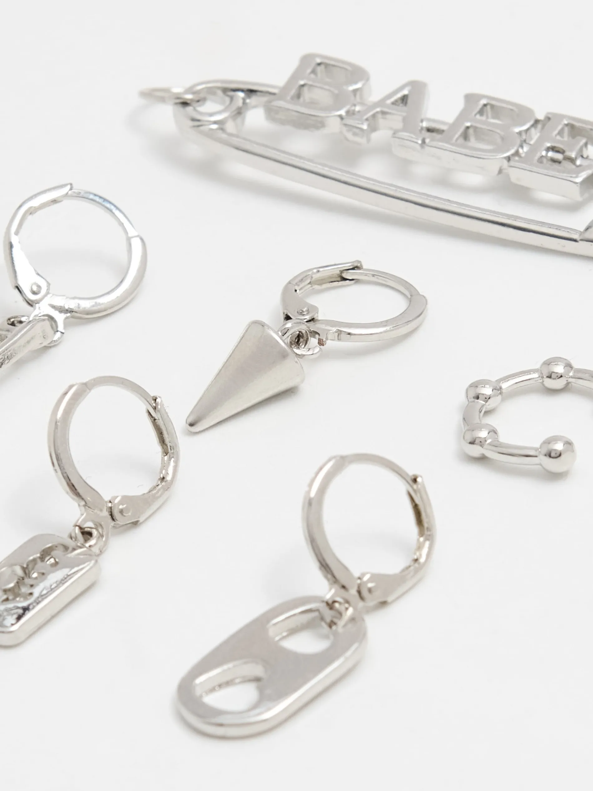 Zestaw 6 par damskich kolczyków wykonanych z tworzywa w kolorze srebrnym. Modele z różnymi zapięciami na sztyft, zatrzask lub typu kreol, które możesz mieszać dowolnie.