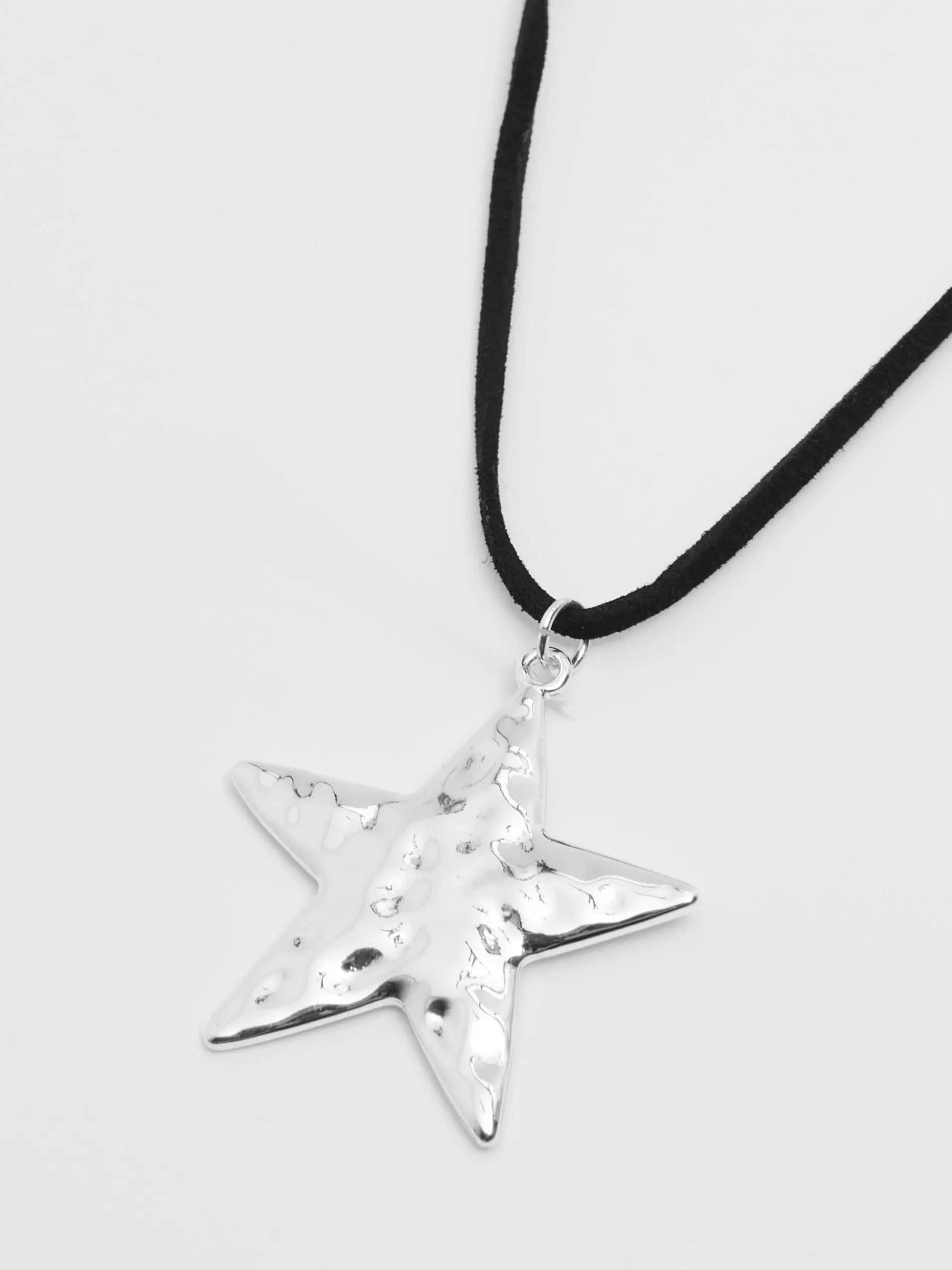 Dodatek do stylizacji dla miłośniczek astralnych symboli. Damski naszyjnik złożony z rzemykowego łańcuszka zawiązywanego na szyi. Zestaw uzupełniono o zawieszkę z motywem gwiazdy.