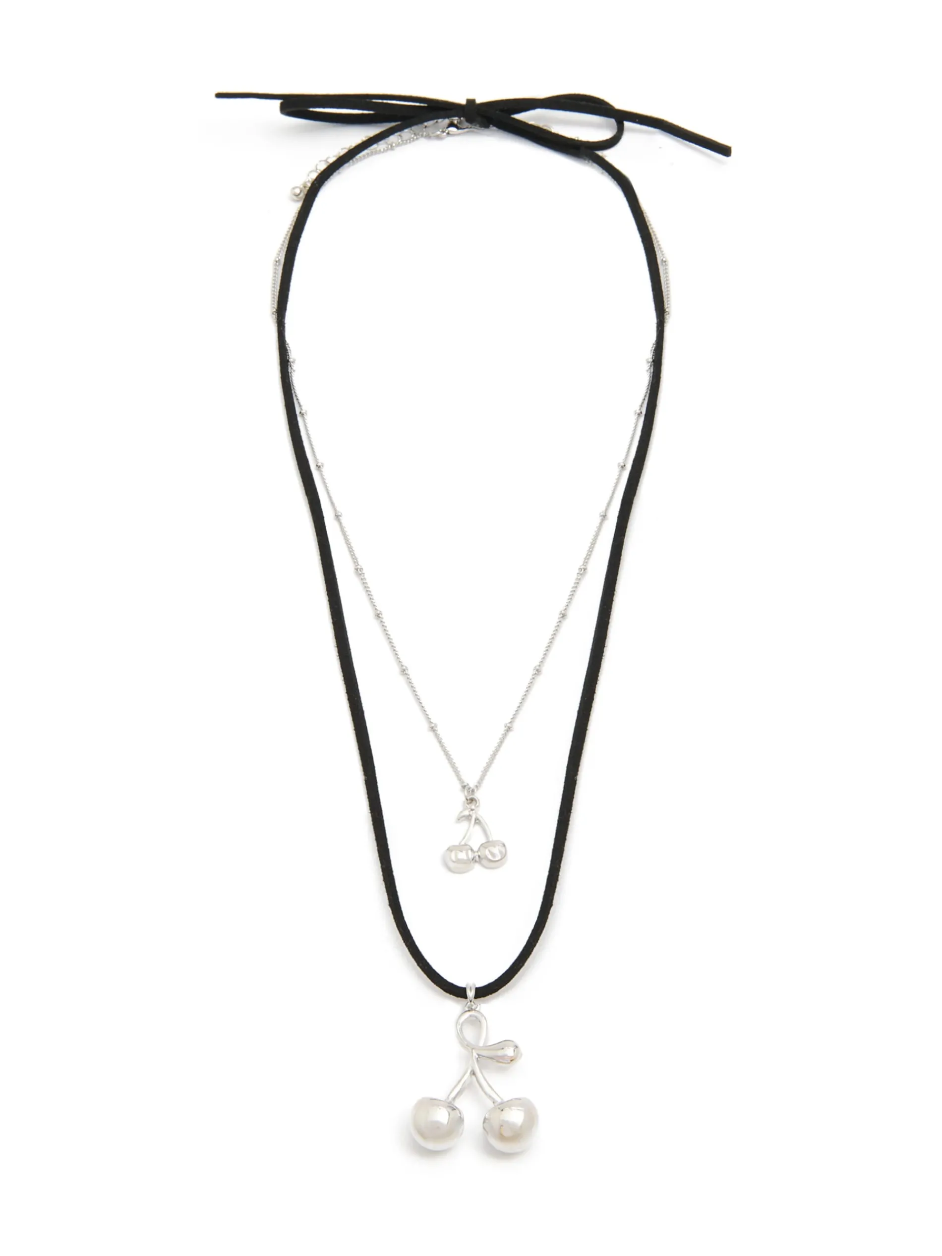 Damski naszyjnik złożony z rzemykowego i srebrnego łańcuszka. Zestaw uzupełniono o dwie zawieszki z wiśniowym motywem.