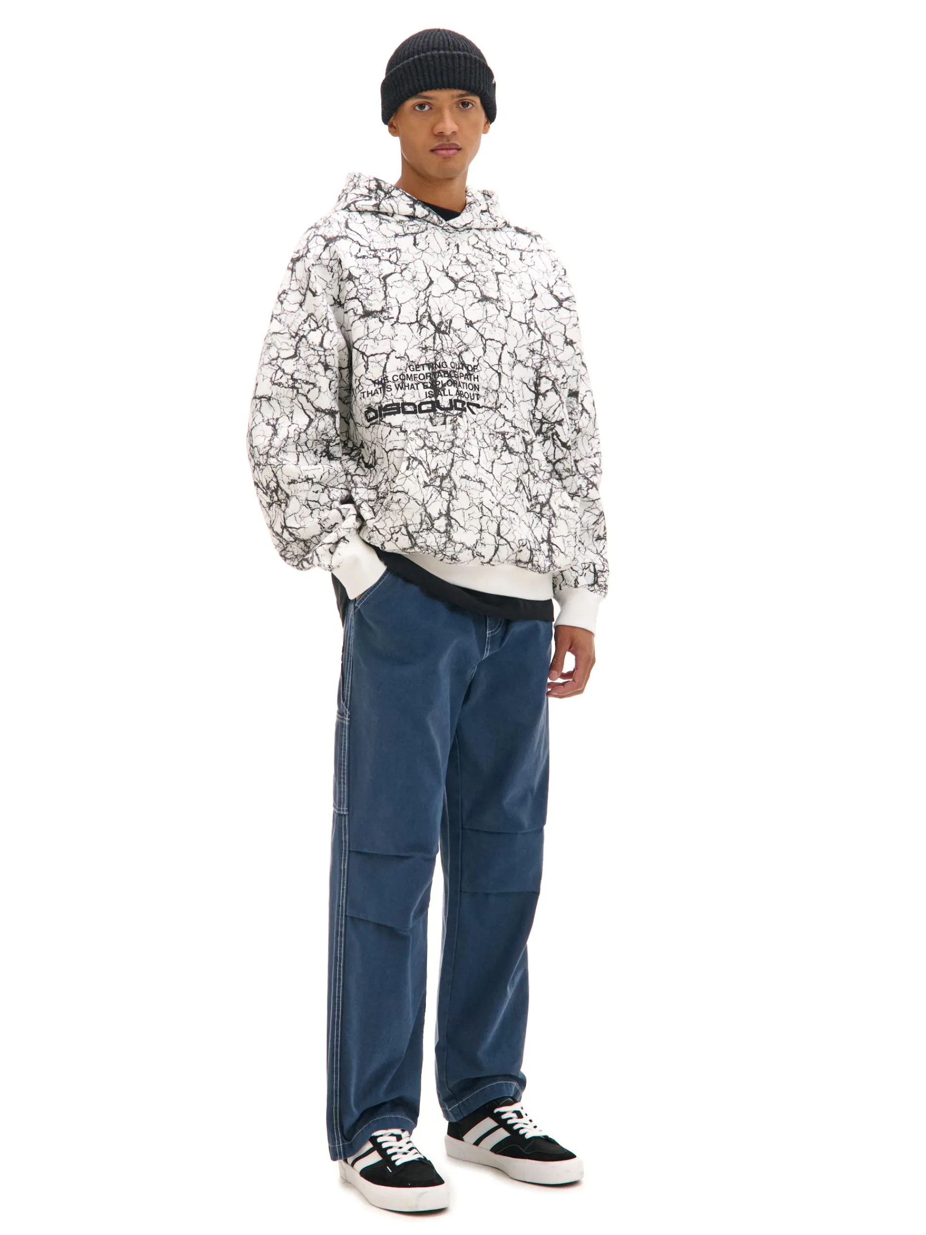 Bluza męska z kapturem zakładana przez głowę. Ściągacze na dole i przy mankietach zapobiegają unoszeniu się materiału. Na całej powierzchni unikatowy, kontrastowy nadruk w streetowym stylu. uszyta z miękkiej dzianiny z bawełną swobodny, luźny krój miękki kaptur długie rękawy z obniżoną linią ramion dół i mankiety wykończone ściągaczami oryginalny print