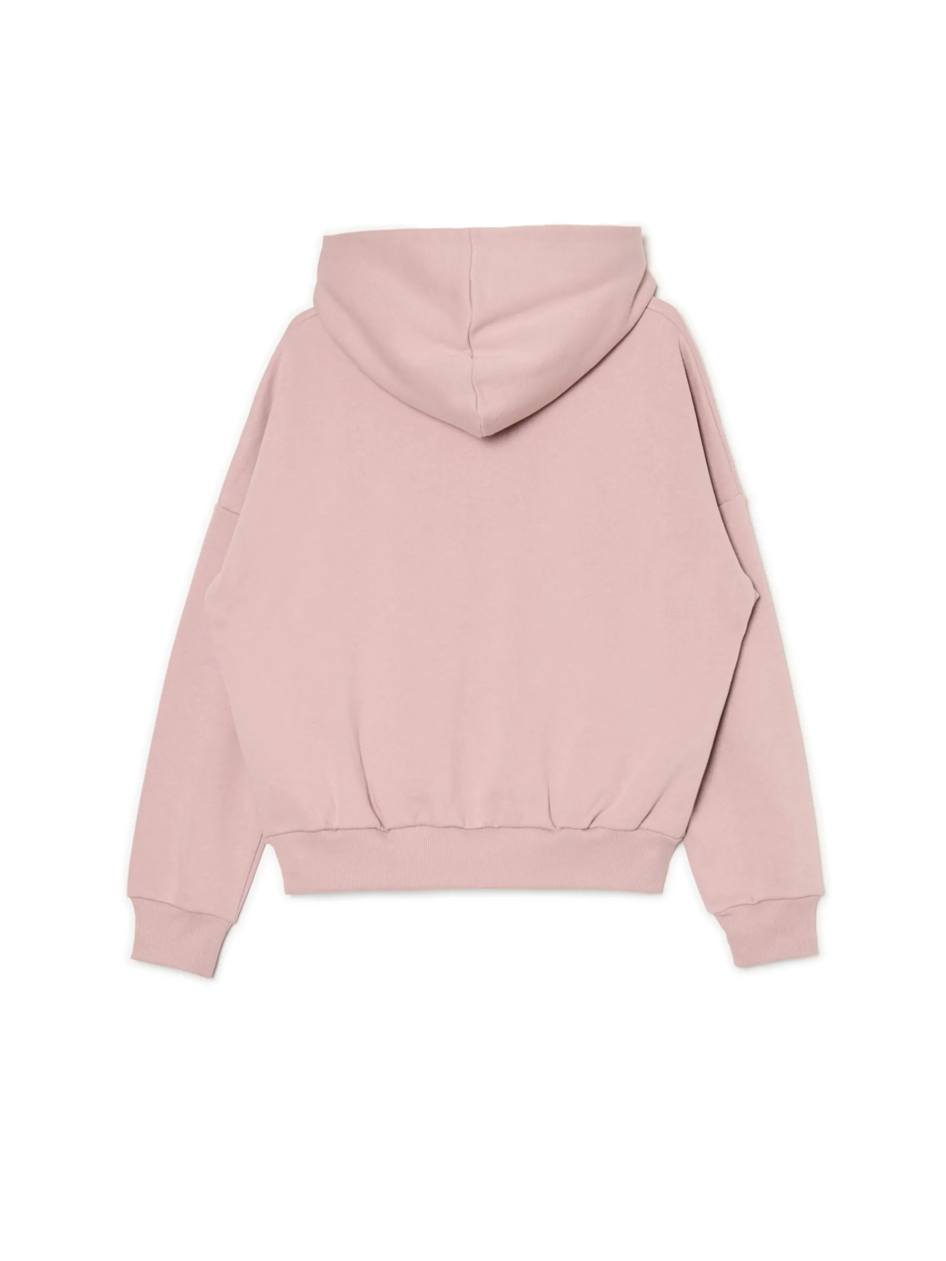 Damska bluza z kapturem uszyta z mieszanki dzianin z dodatkiem miękkiej i trwałej bawełny fleecy. Na przodzie delikatnie sprany kwiatowy nadruk z napisem. dzianinowy materiał z bawełną krótki krój dół i mankiety wykończone ściągaczami miękki kaptur duży nadruk z przodu