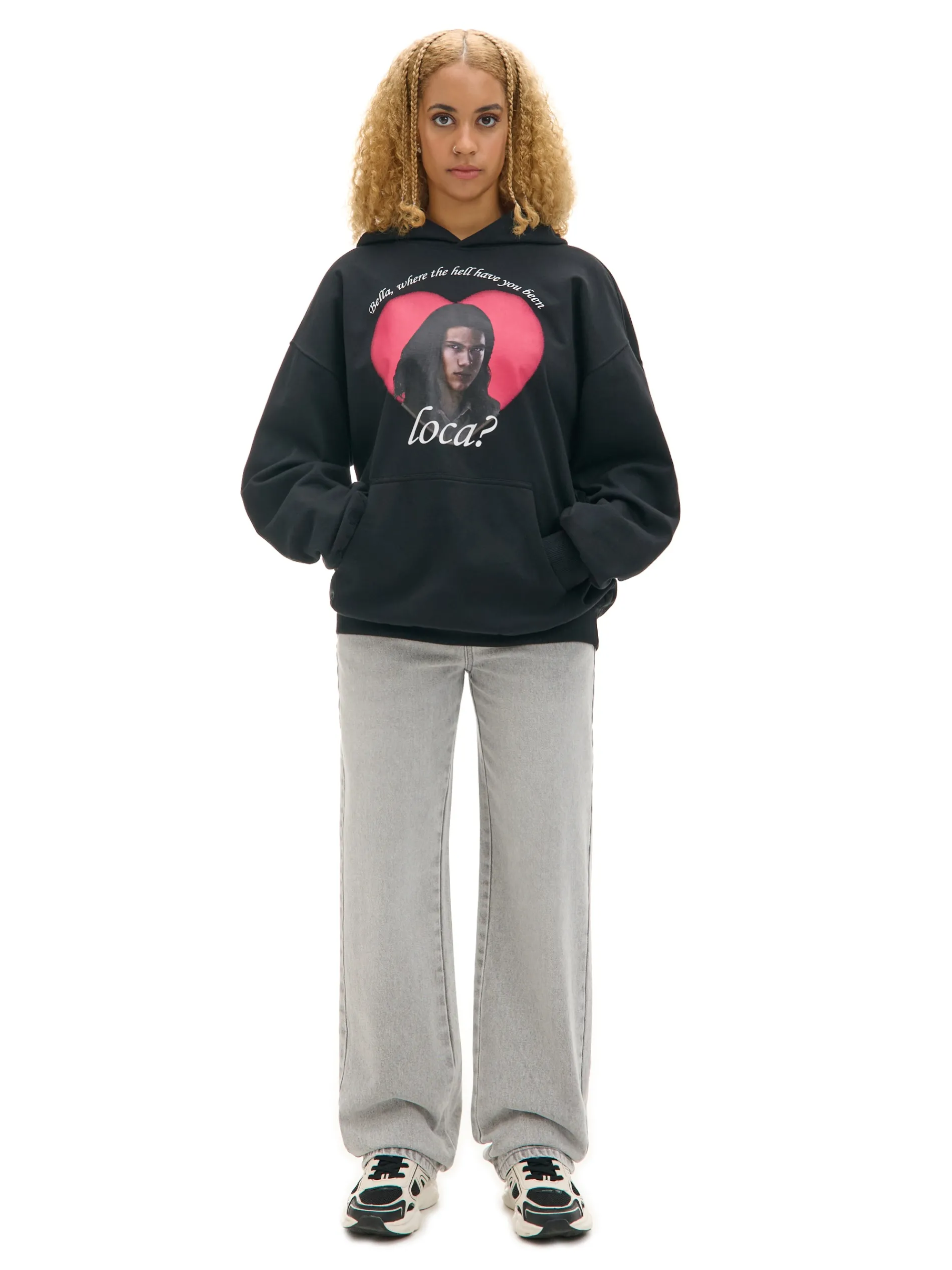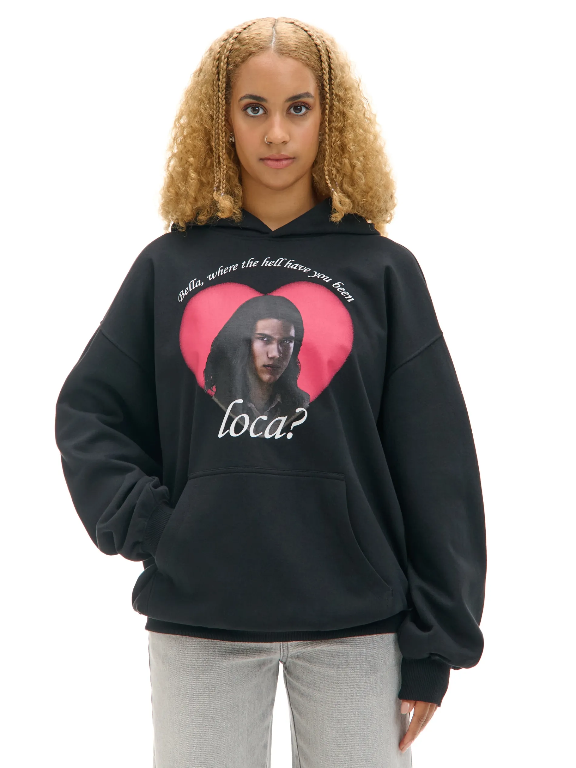 Czarna bluza damska z kapturem zakładana przez głowę. Ściągacze na dole i przy mankietach zapobiegają unoszeniu się materiału. Na przodzie wizerunek jednej z postaci z serii „Zmierzch”. Unikatowy model dla fanek Jacoba i nie tylko! uszyta z miękkiej dzianiny z bawełną krój oversize miękki kaptur długie rękawy z obniżoną linią ramion dół i mankiety wykończone ściągaczami kieszeń kangurka na przodzie z przodu duży nadruk z motywem Twilight LIONSGATE, ® , TM & © 2024 Lions Gate Ent Inc. and related companies. All Rights Reserved.”
