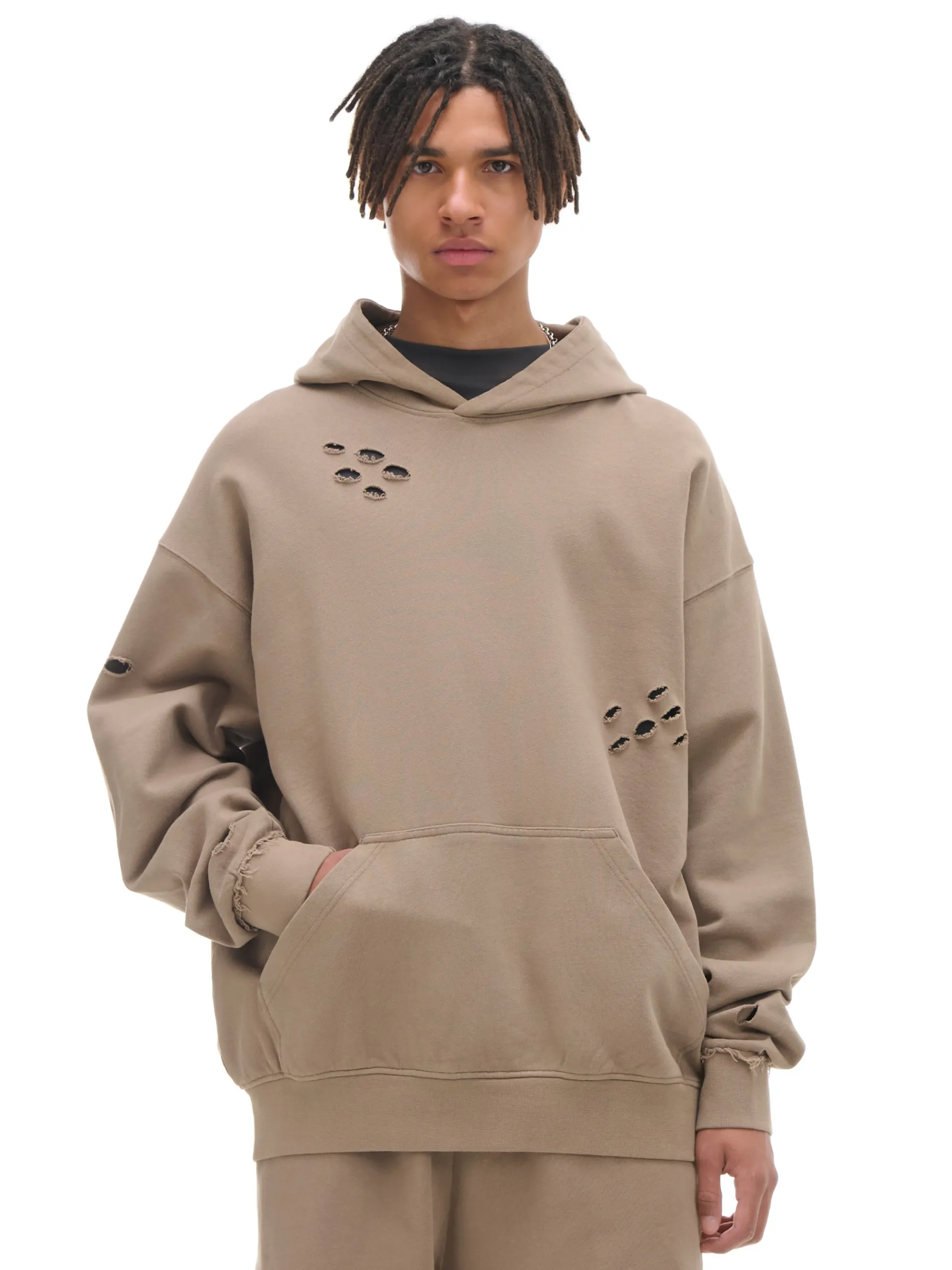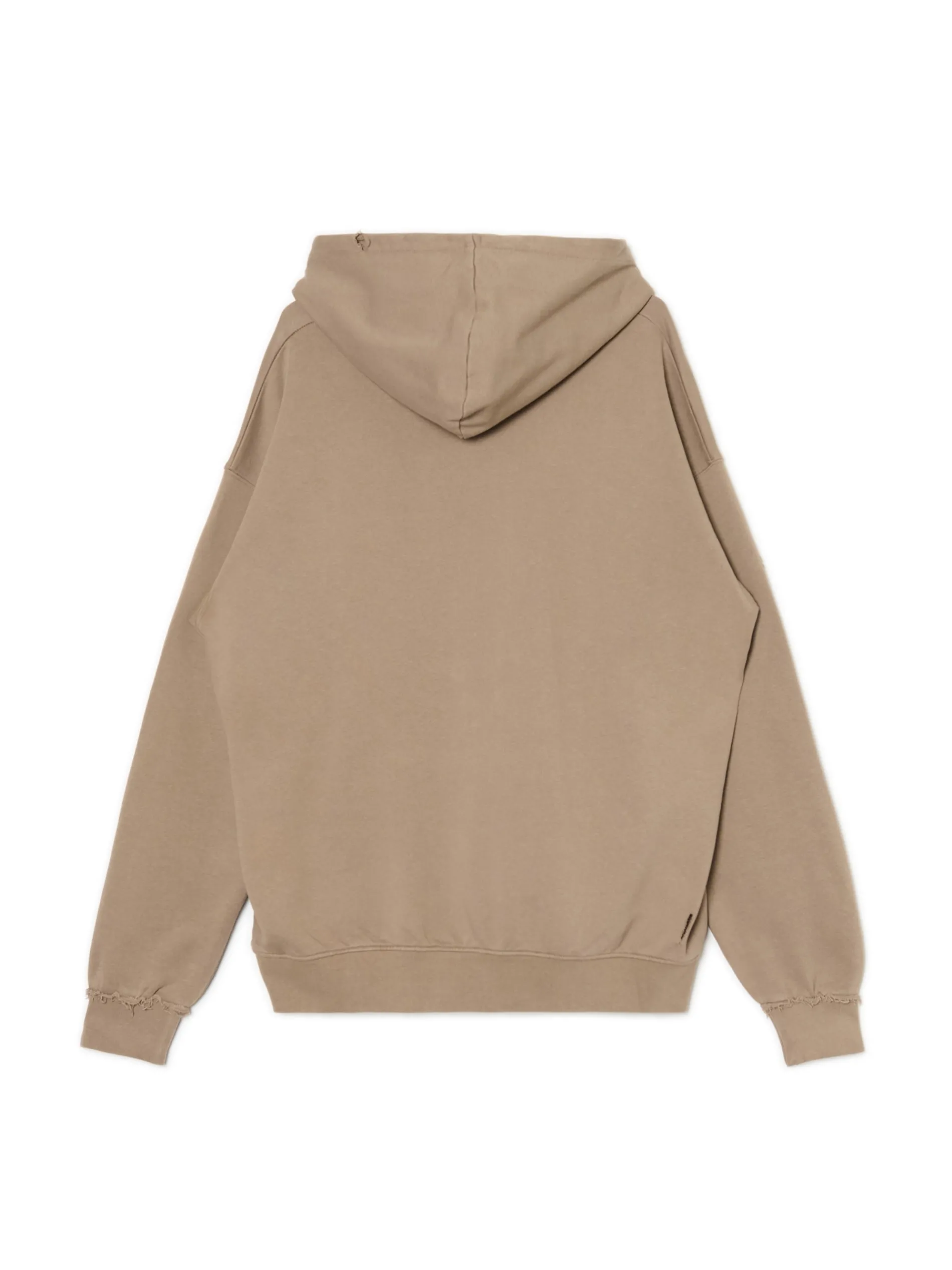 Męska beżowa bluza z kapturem typu hoodie. Dziury i poszarpane krawędzie przy mankietach od rękawów nadają jej charakteru. Look & vibe! 100% oddychającej bawełny swobodny krój loose duża kieszeń typu kangur ściągacze na biodrach i mankietach poszarpane krawędzie przy mankietach asymetryczne dziury i postrzępienia na materiale