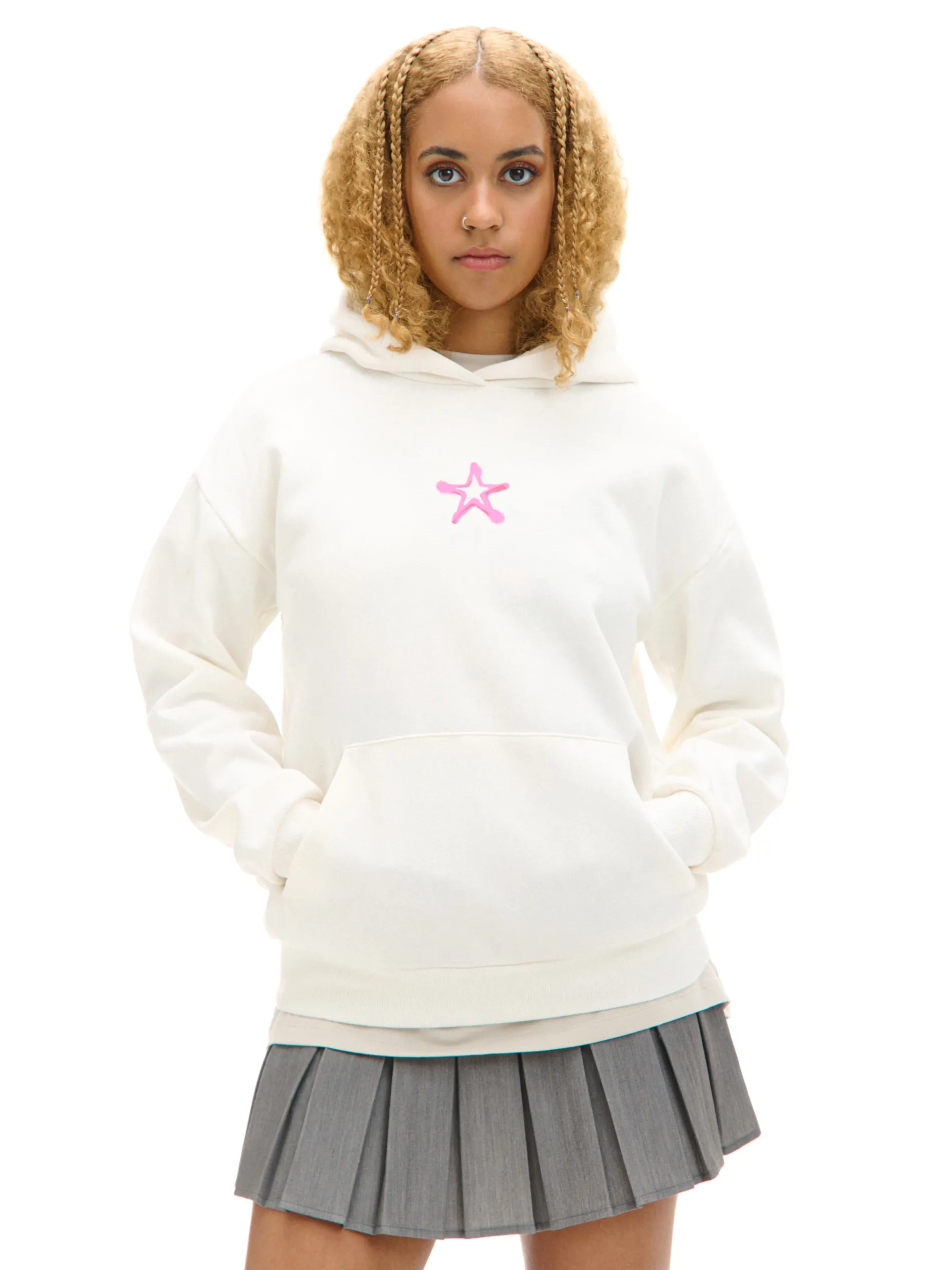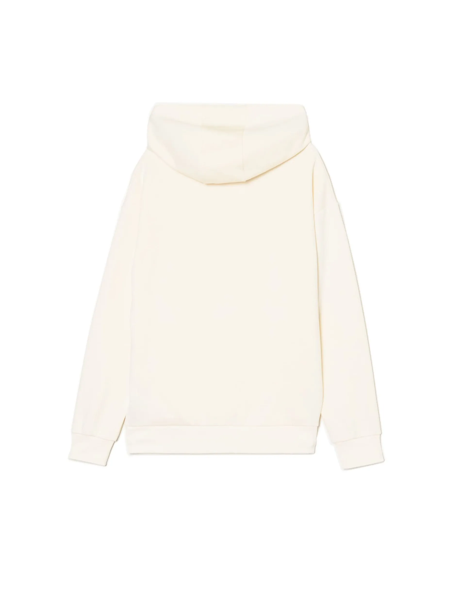 Ciepła damska bluza z kapturem uszyta z trwałej mieszanki dzianin w kremowym kolorze. Item, który otuli Cię w chłodne wieczory. uszyta z miękkiej dzianiny z bawełną regularny krój obszerny kaptur długie rękawy z obniżoną linią ramion z przodu duża kieszeń typu kangurka dół i rękawy wykończone prążkowanym ściągaczem z przodu kolorowy nadruk