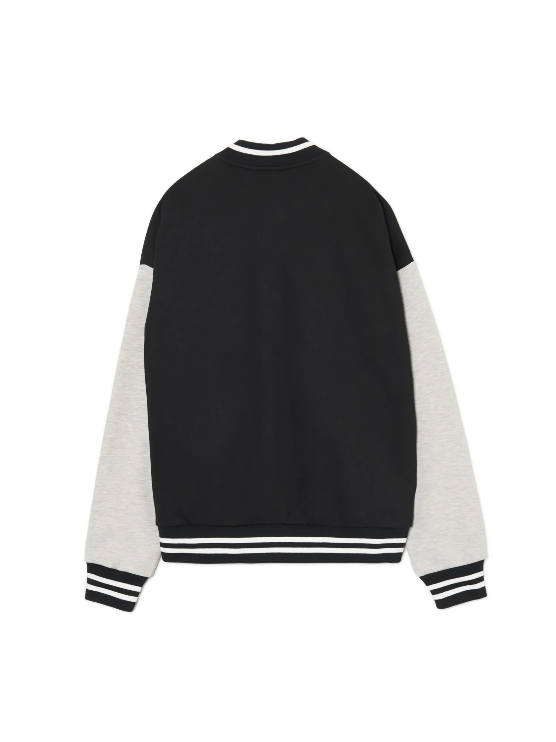 Męska bluza typu college uszyta z mieszanki dzianin z przyjemną w dotyku bawełną fleecy. Wyposażona w charakterystyczne rękawy w kontrastowym kolorze i praktyczne kieszenie z przodu na zmęczone ręce po całym dniu. bluza typu bomber bez kaptura wygodny krój comfort zapięcie na zatrzaski na całej długości krótka stójka z prążkowanego materiału długie rękawy wykończone elastycznym ściągaczem dwie kieszenie po bokach dół wykończony delikatnym, prążkowanym ściągaczem przy mankietach i w pasie wzór w drobne ciemne paski z przodu aplikacja