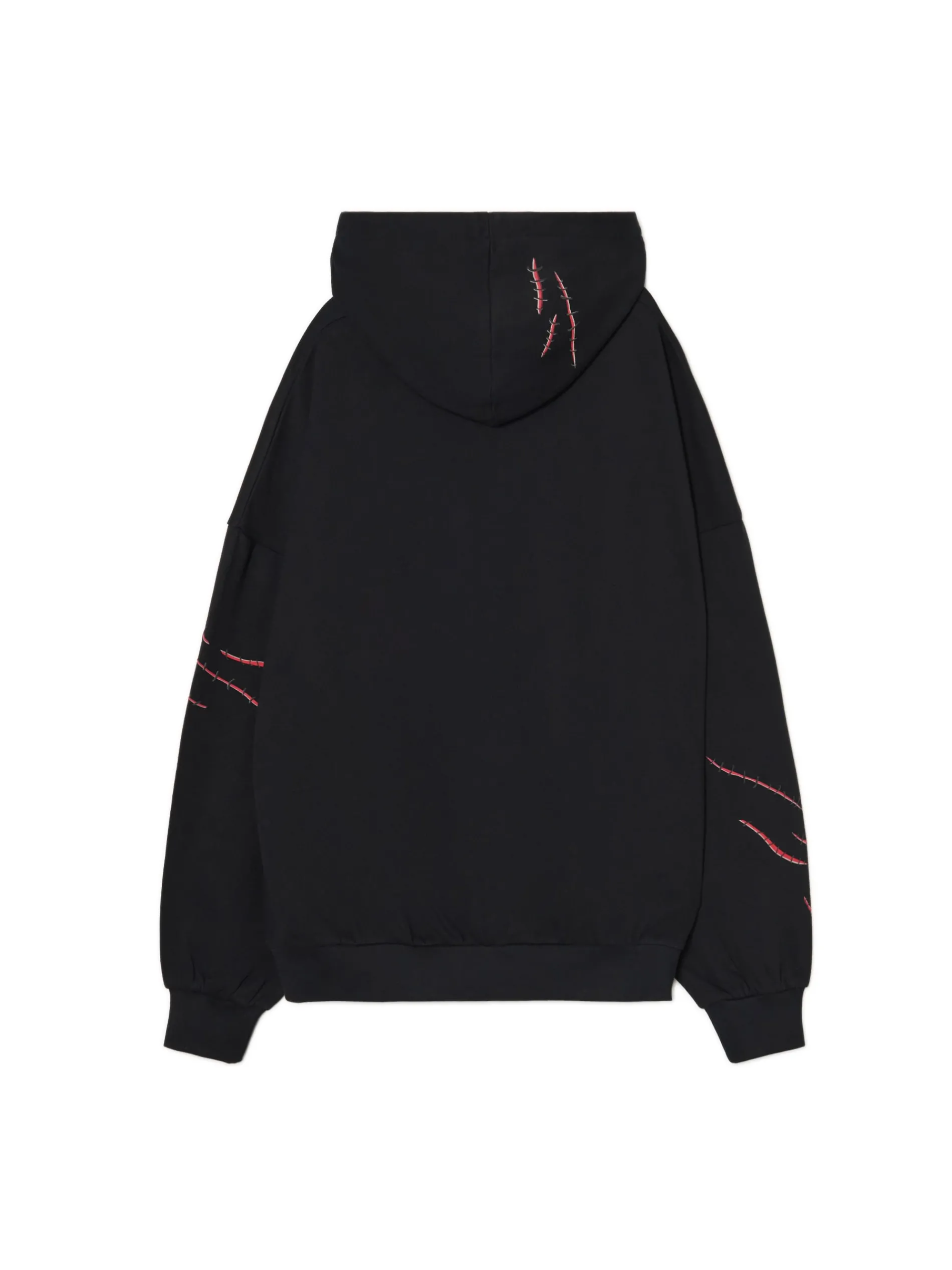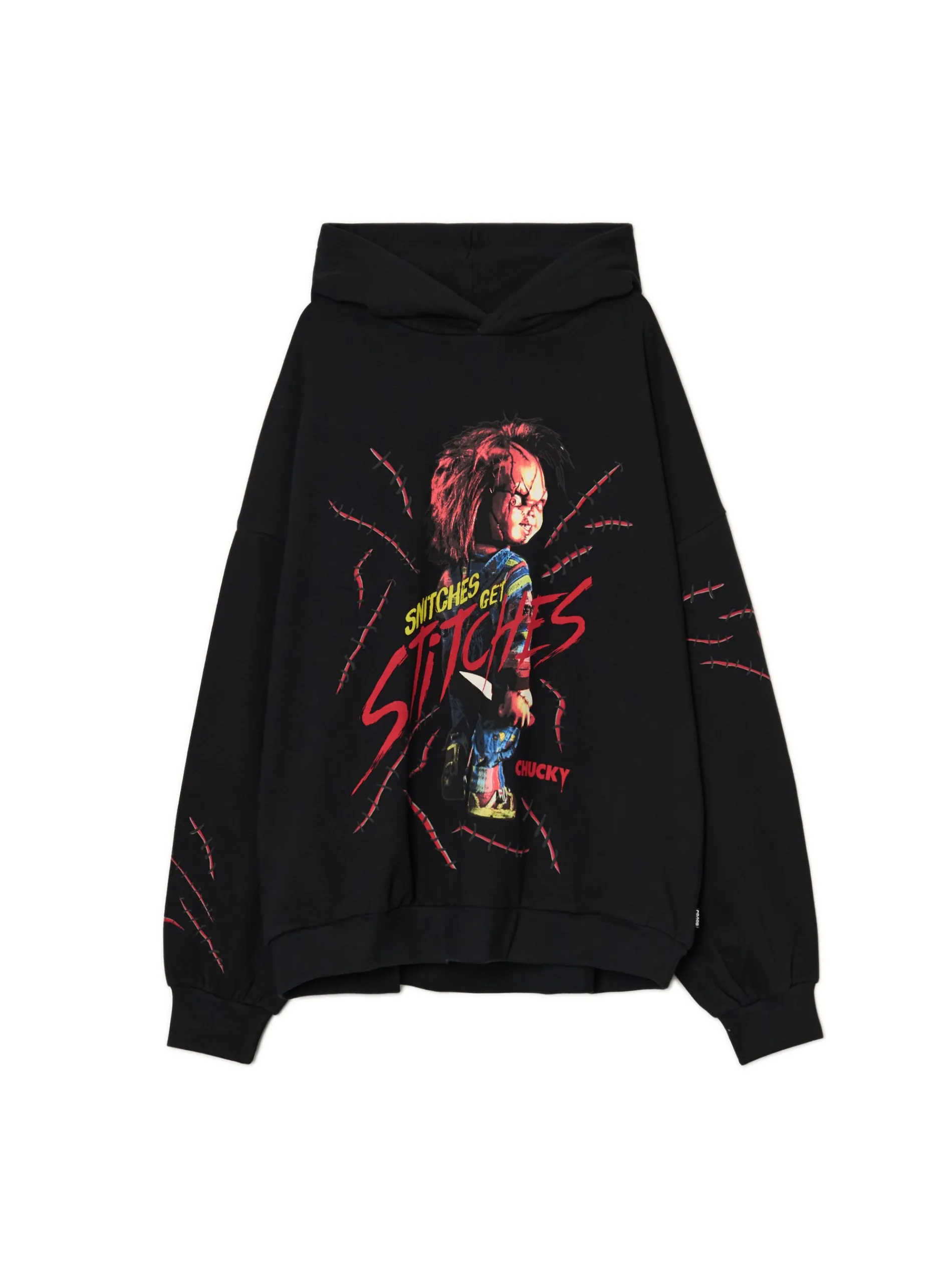 Hi! I’m Chucky! Męska bluza z kapturem uszyta z mieszanki dzianin w kolorze czarnym. Na przodzie bohater serii o laleczce Chucky z charakterystycznym uśmiechem, bliznami na twarzy i ostrym nożem. Let’s play! uszyta z miękkiej dzianiny z bawełną obszerny krój boxy miękki kaptur długie rękawy dwie kieszenie boczne dół i rękawy wykończone prążkowanym ściągaczem nadruk z motywem Halloween CHUCKY FRANCHISE © UNIVERSAL CITY STUDIOS LLC. ALL RIGHTS RESERVED