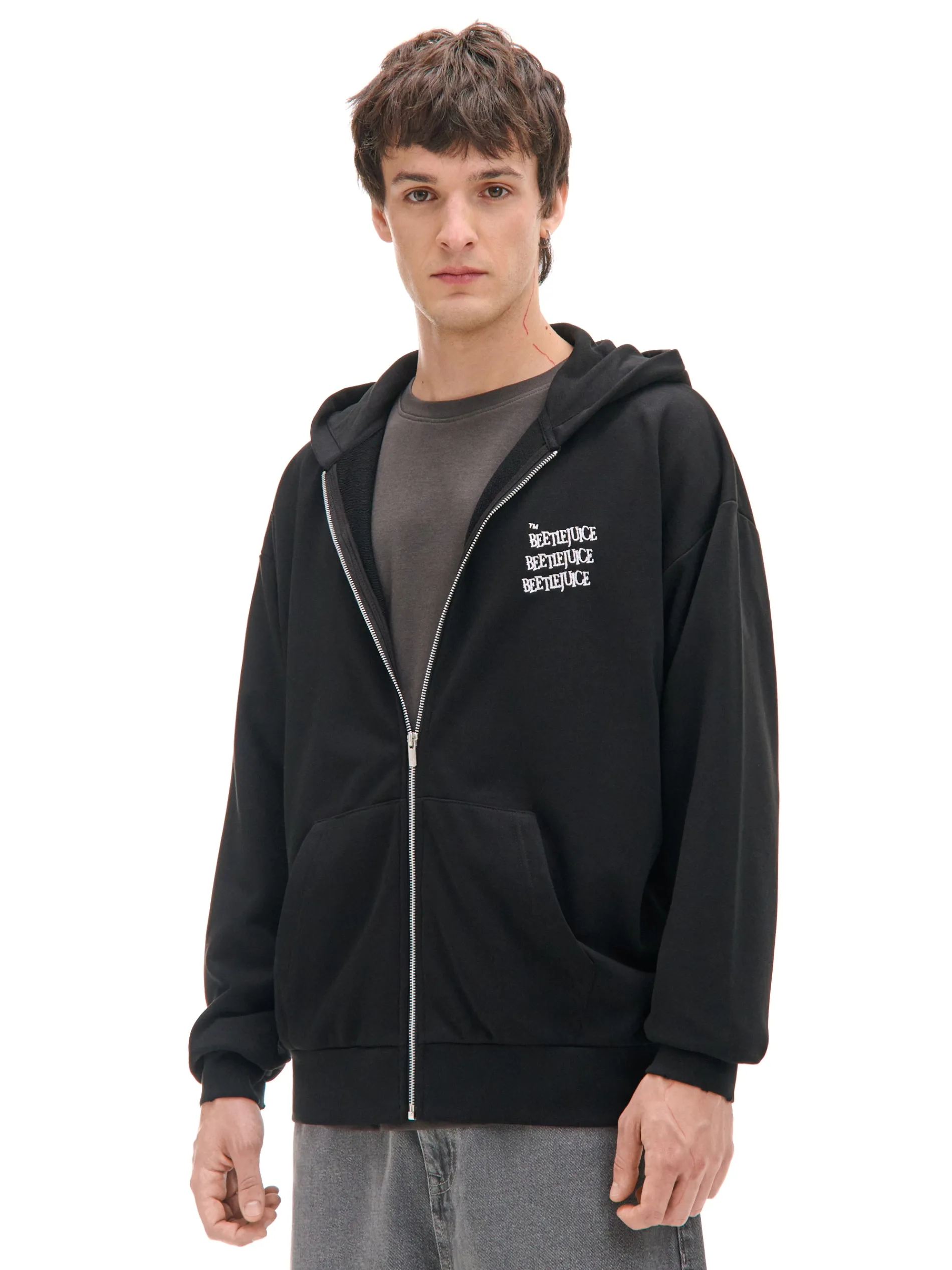 Rozpinana męska bluza typu hoodie w kolorze czarnym. Na przodzie nadruk tekstowy z imieniem głównego bohatera kinowego hitu – Beetlejuice. Na plecach zdjęcia z filmowym motywem i cała prawda o jego pochodzeniu. dzianinowy materiał z bawełną dodatek miękkiej i trwałej bawełny french terry swobodny, luźny krój zapięcie na metalowy zamek miękki kaptur długie rękawy z obniżoną linią ramion dwie kieszenie po bokach nadruk z motywem Halloween BEETLEJUICE BEETLEJUICE and all related characters and elements © & TM WBEI. (s24)