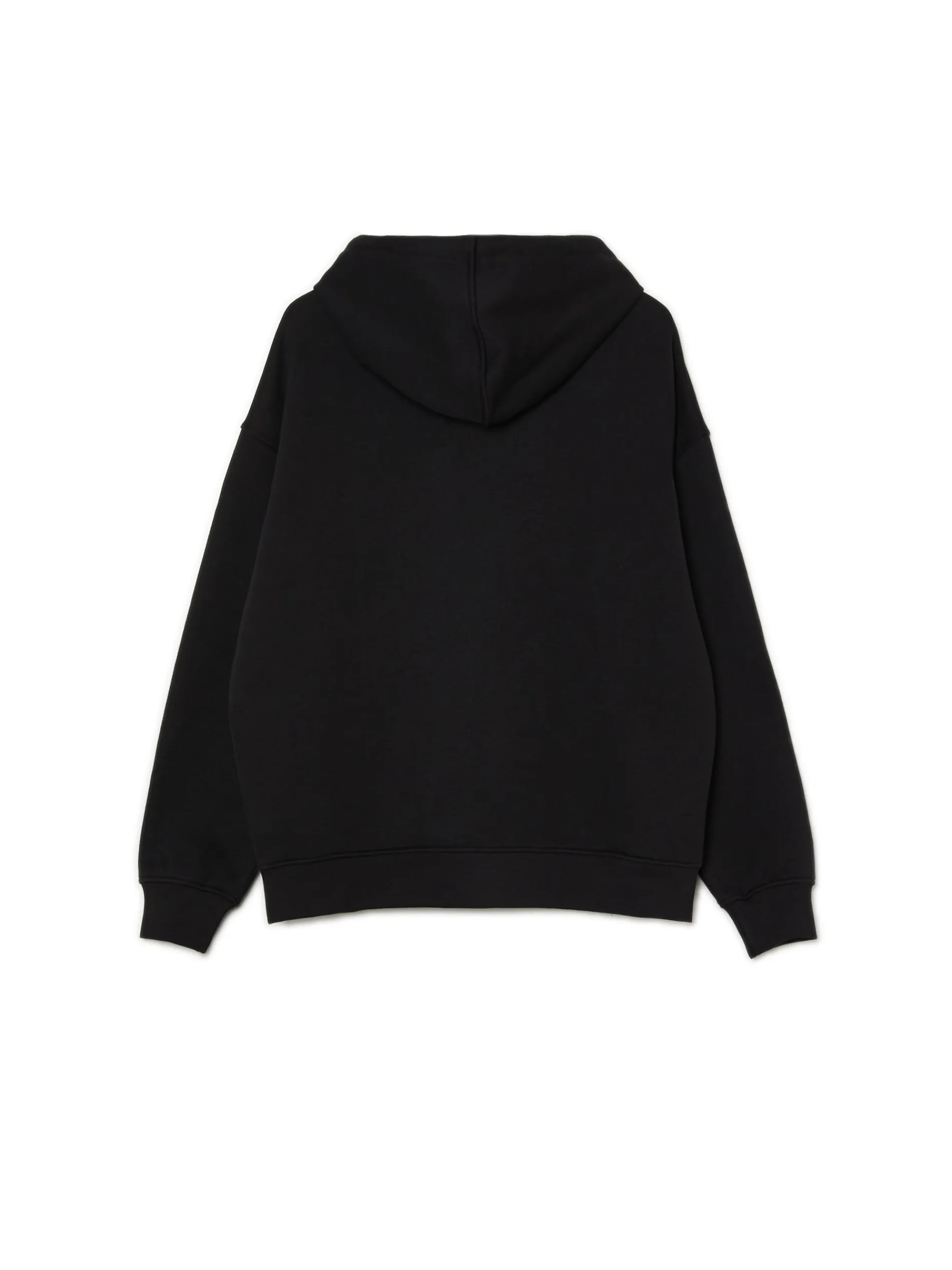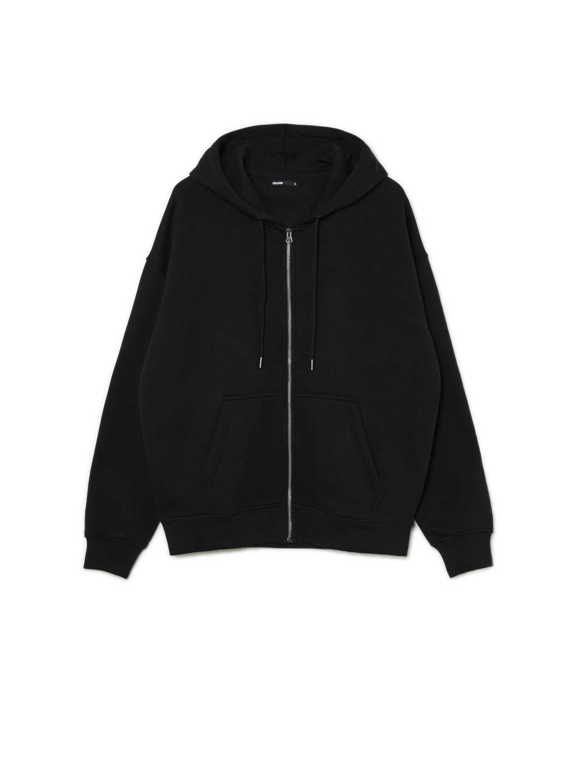 Czarna damska bluza z kapturem, uszyta z gładkiej dzianiny. dzianina z dodatkiem miękkiej bawełny fleecy swobodny krój oversize kaptur regulowany sznurkiem zapięcie na suwak dół i rękawy wykończone ściągaczem dwie kieszenie boczne Wzrost modelki: 170 cm