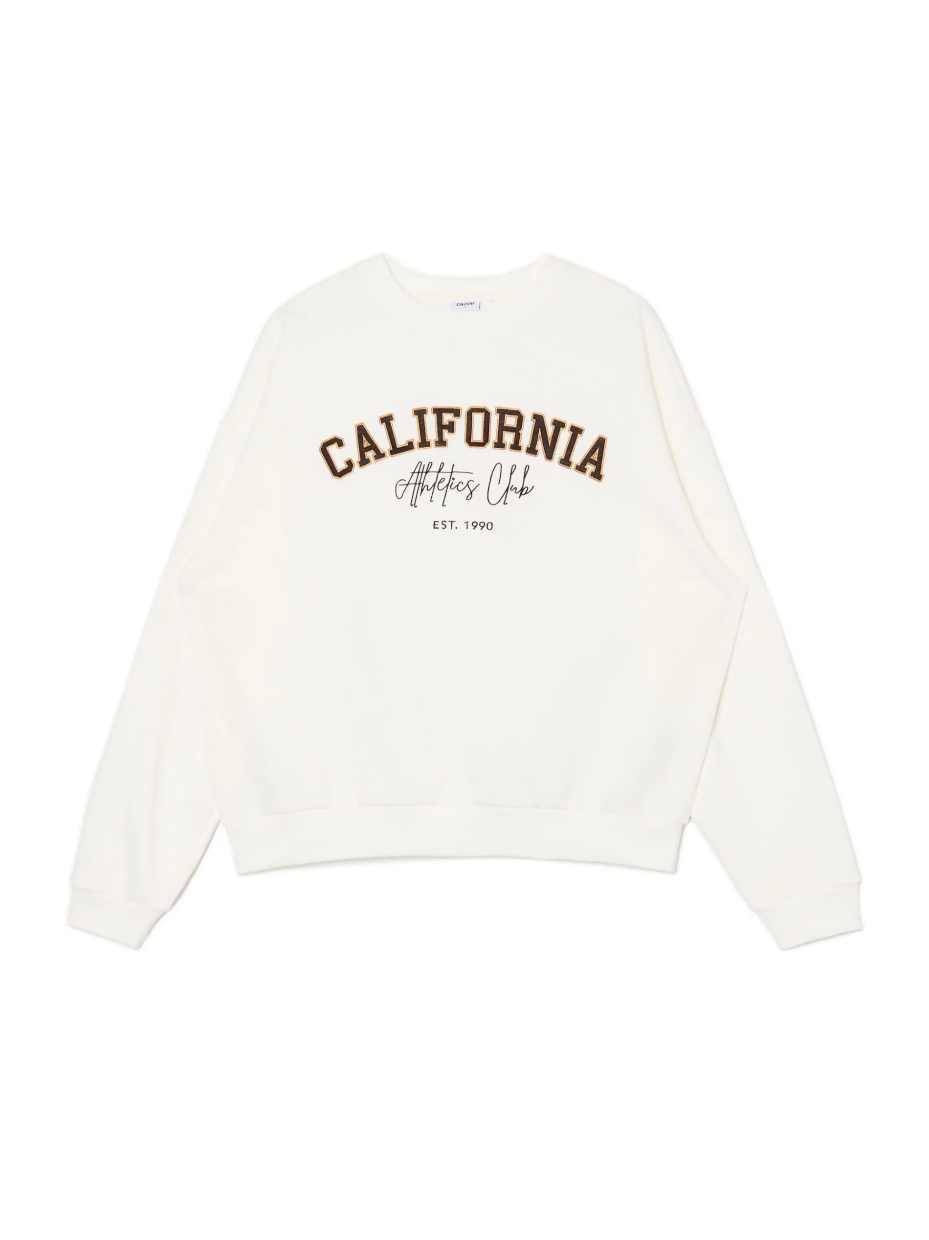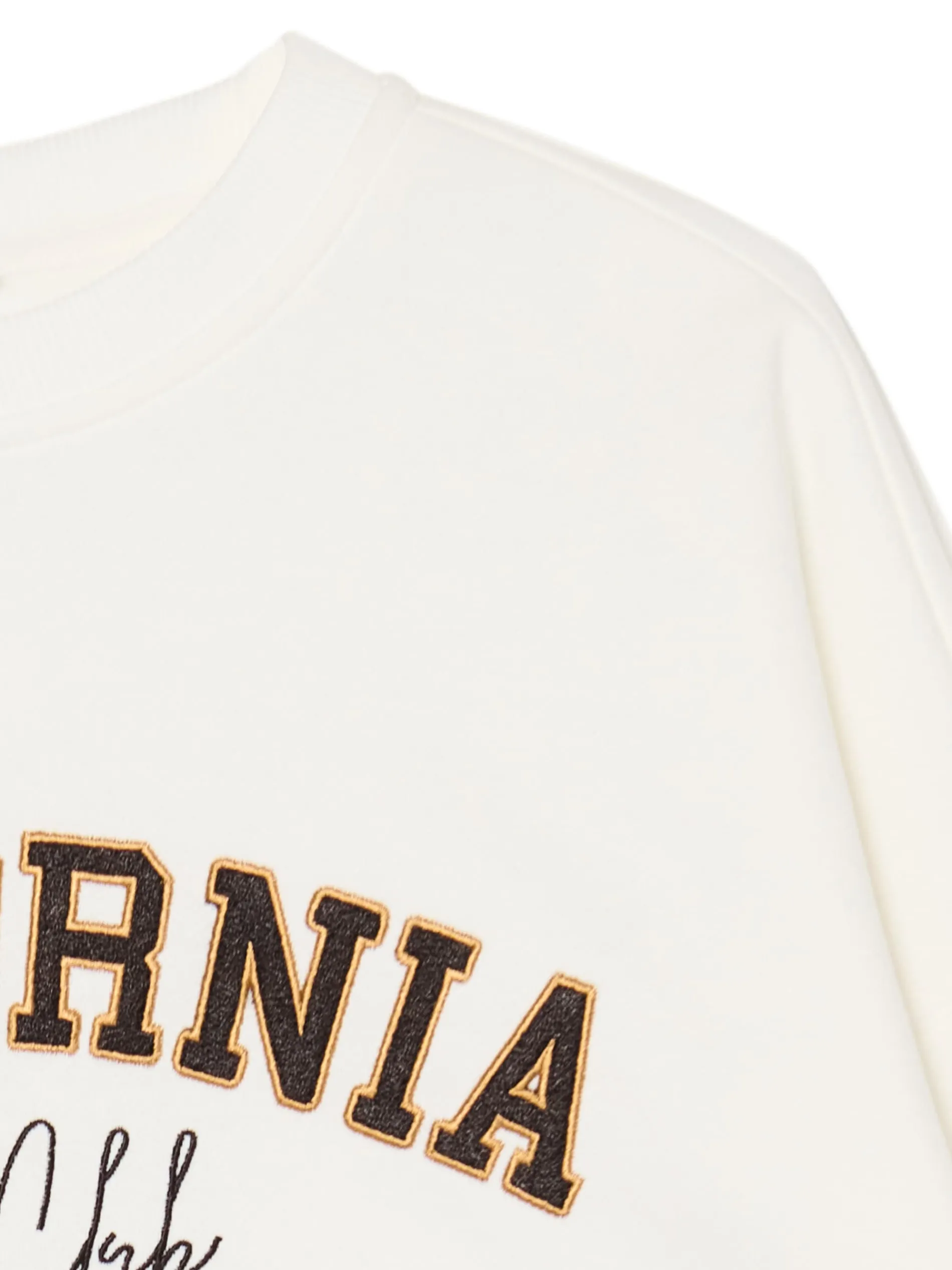 Damska bluza typu college uszyta z dzianiny z dodatkiem miękkiej bawełny fleecy. Na przodzie ozdobne naszywki w formie tekstowej. bluza typu college, uszyta z dzianiny o wysokiej zawartości bawełny dekolt, dół i rękawy z dzianinowym ściągaczem ozdobne naszywki z przodu