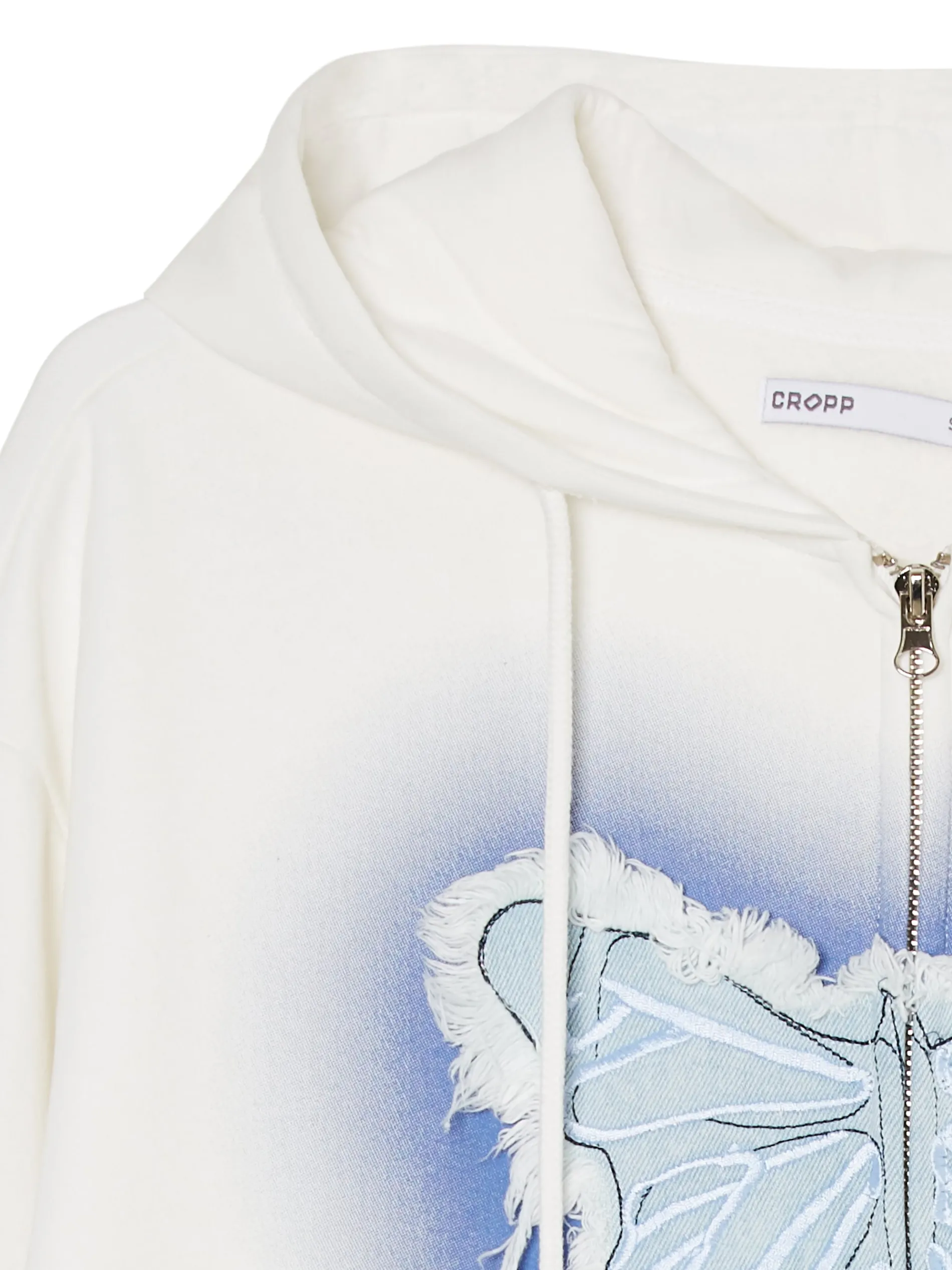 Biała damska bluza o krótkim kroju, uszyta z mieszanki dzianin zawierającej bawełnę. Must have na letnie wypady z ekipą! krótki krój typu crop z przodu zapięcie na suwak kaptur regulowany sznurkiem dwie kieszenie z przodu dół i rękawy wykończone ściągaczem ozdobna denimowa aplikacja w kształcie motyla Wzrost modelki: 172 cm