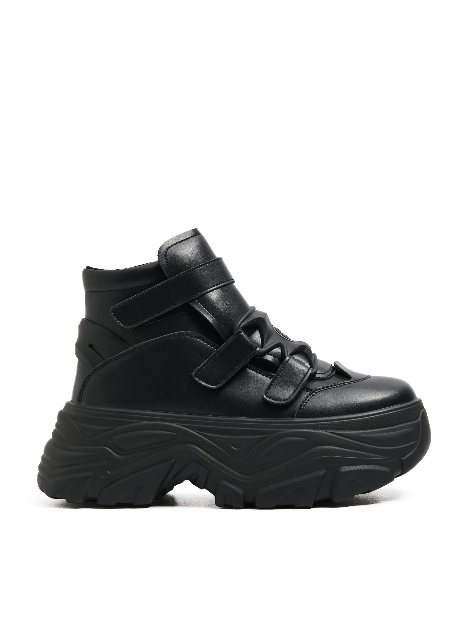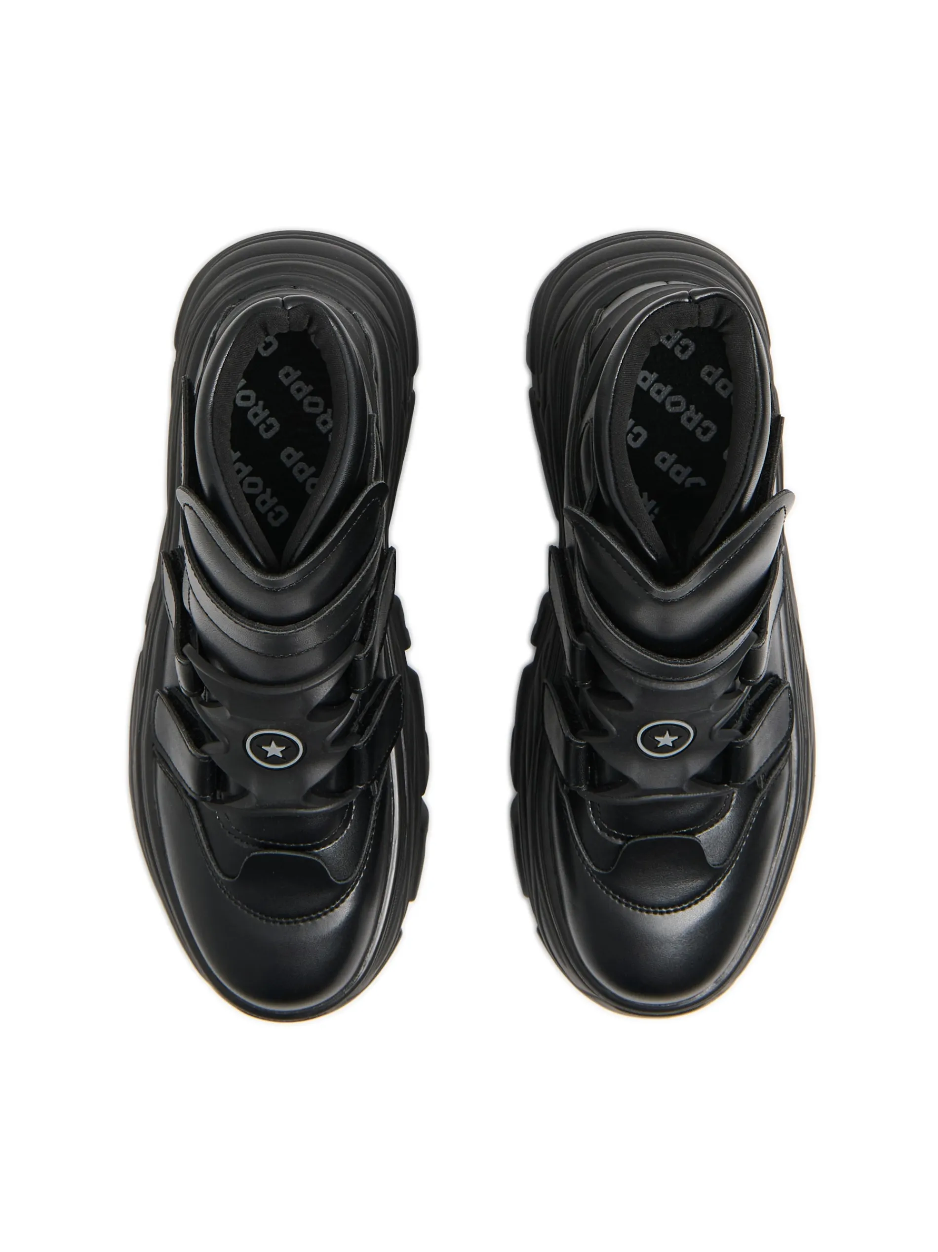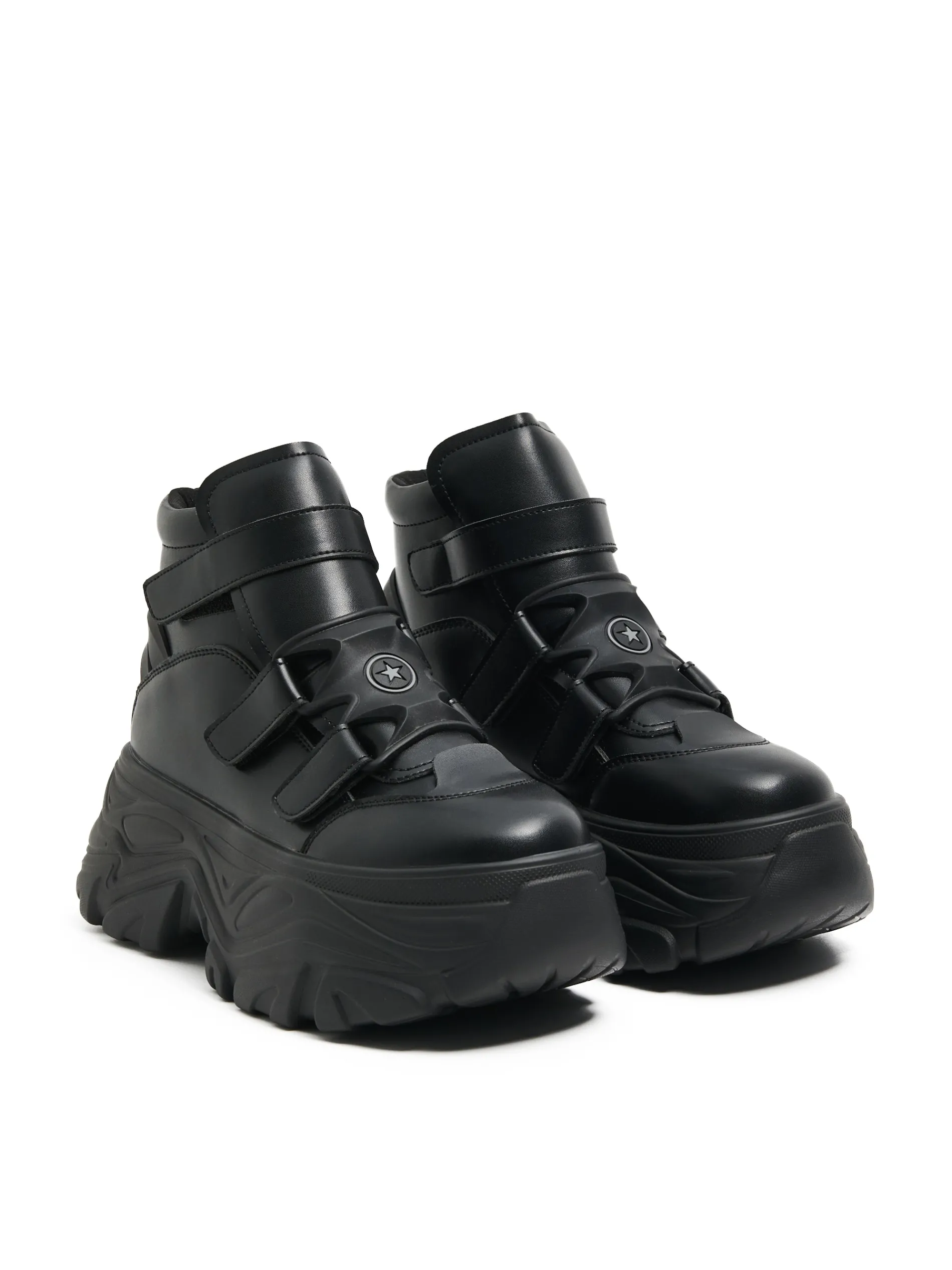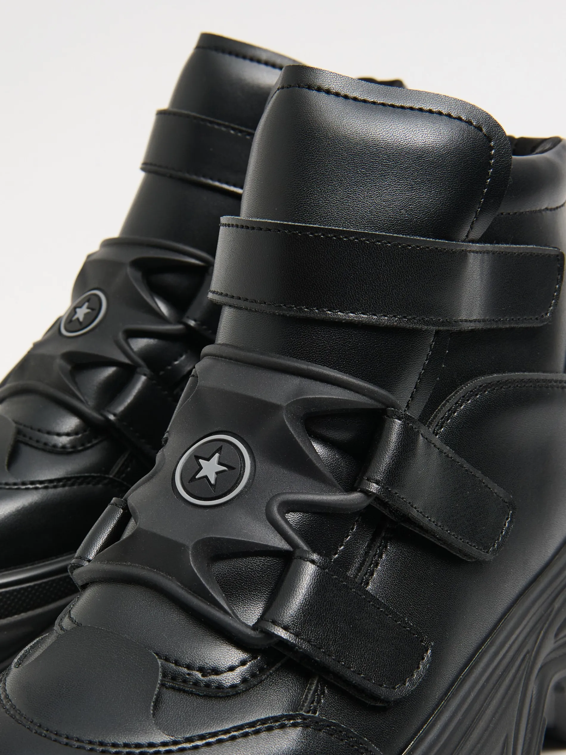 Przejściowe damskie buty za kostkę typu chunky, wykonane z imitacji skóry. Sportowy fason, masywna podeszwa i wygodne zapięcie na rzepy. Na przodzie dekoracyjna naszywka z gwiazdą. Idealne na sezon jesienno-zimowy! przejściowe botki za kostkę cholewka z imitacji skóry masywna podeszwa solidny język usztywniający kostkę zapięcie na rzepy brandowy wzór na wkładce