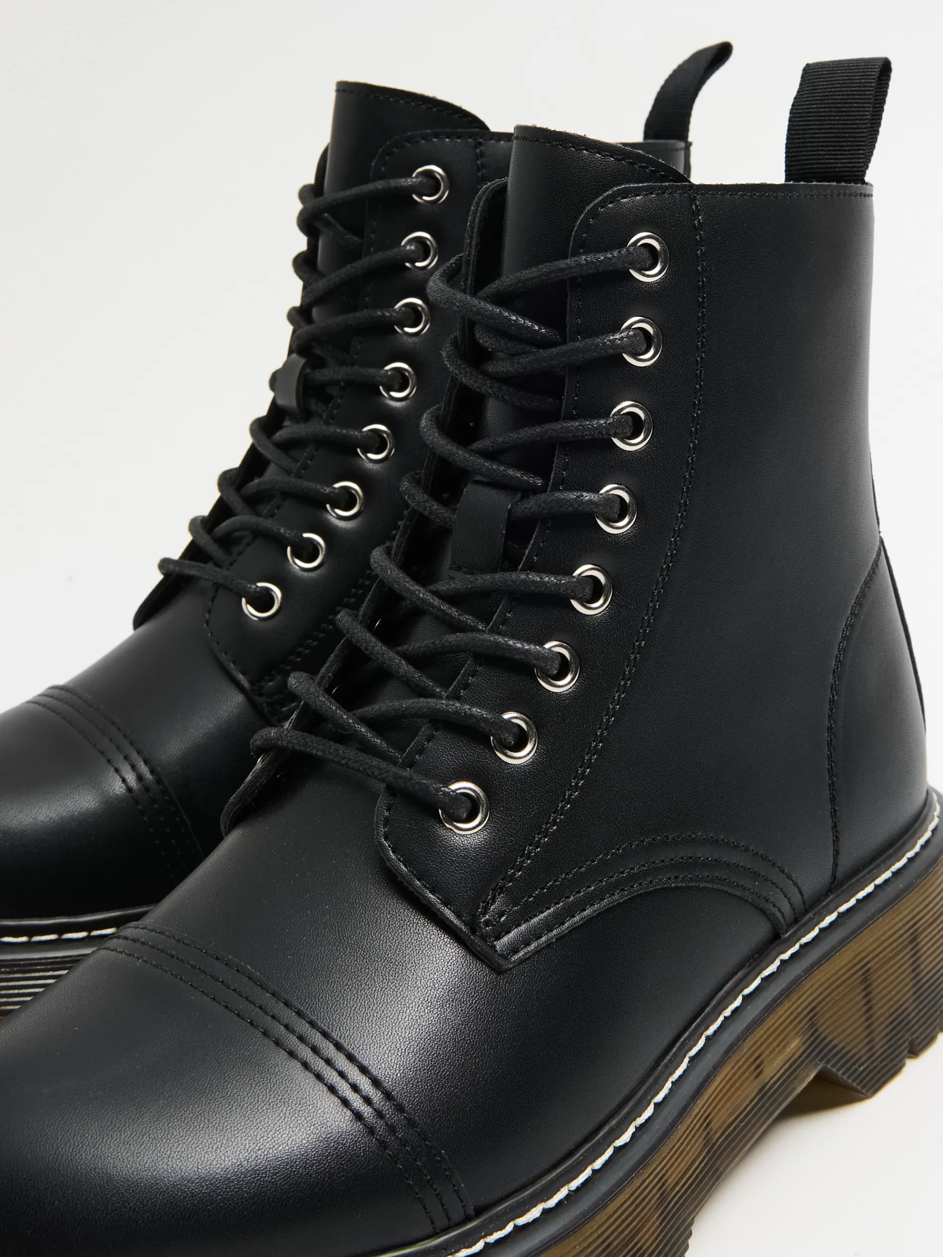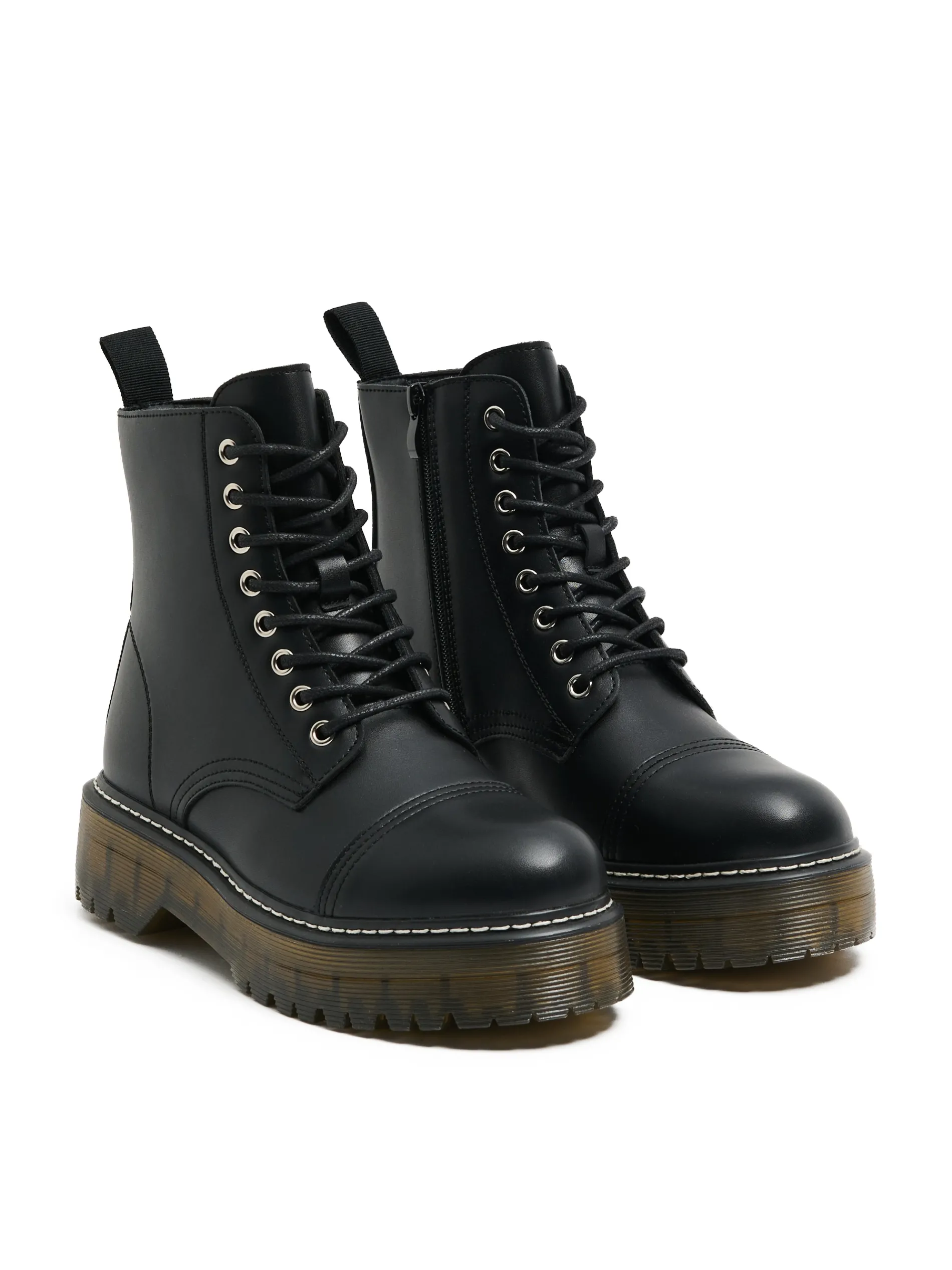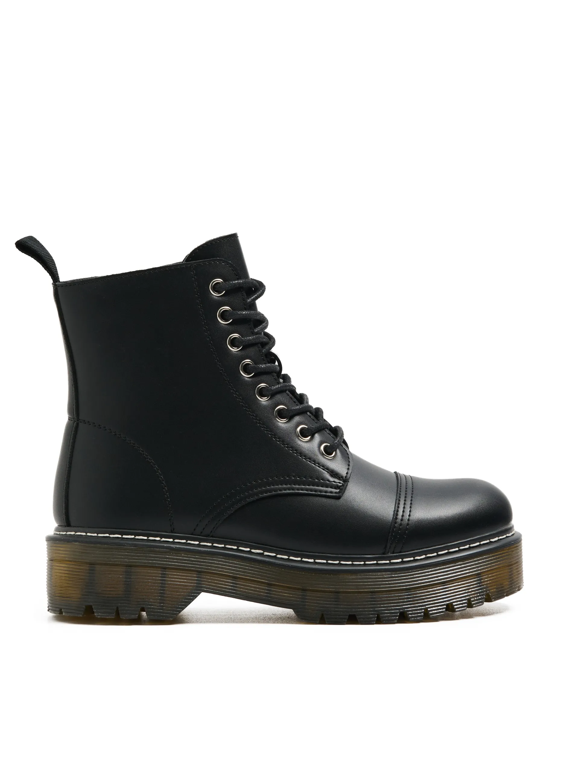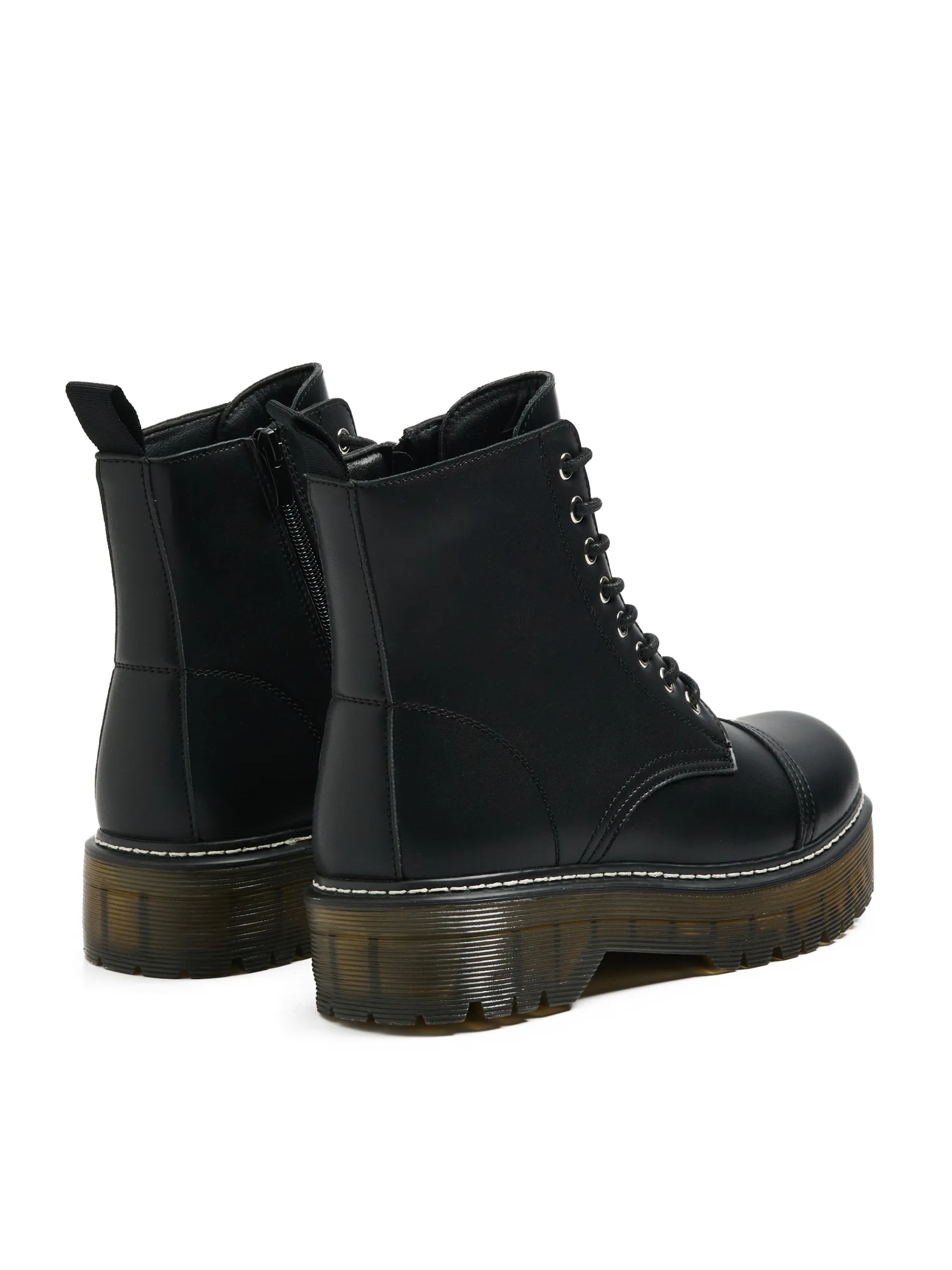 Damskie botki na sezon jesienno-zimowy wykonane z materiału imitującego skórę. Czarne klasyki, które pasują do każdego rodzaju stylizacji. botki za kostkę cholewka z imitacji skóry zapięcie na zamek z boku traperowa podeszwa wykonana z gumy termoplastycznej wiązane na czarne sznurowadła kontrastowe przeszycia metalowe detale wygodny uchwyt do wkładania i zdejmowania butów