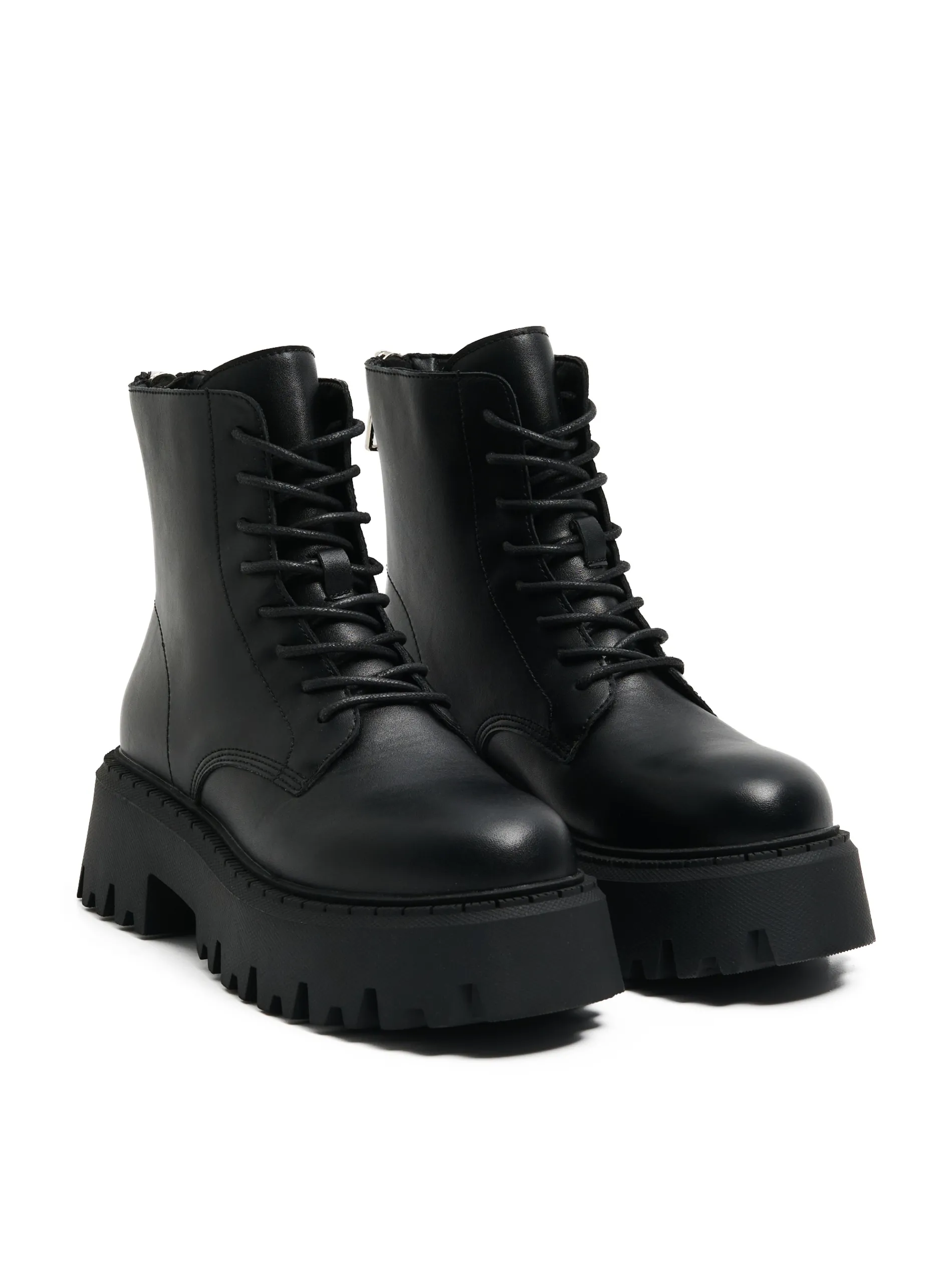 Czarne damskie botki z wysoką cholewką wykonane z imitacji skóry. Posiadają traktorową podeszwę i obcas z termoplastycznej gumy zapobiegającej starciu się materiału. Idealne na sezon przejściowy. botki za kostkę cholewka z imitacji skóry zapięcie z tyłu na zamek traktorowa podeszwa z gumy termoplastycznej wiązane na czarne sznurowadła
