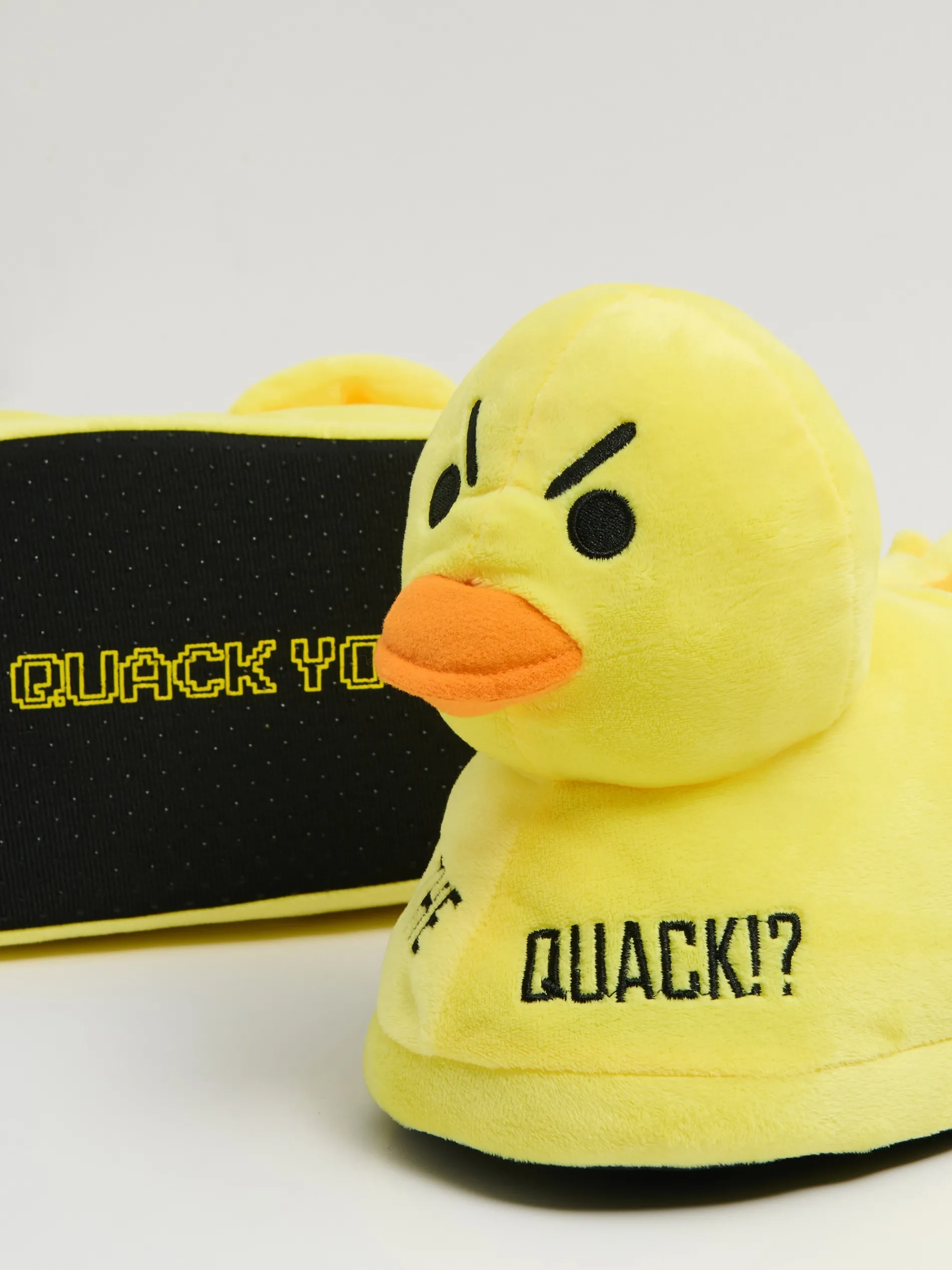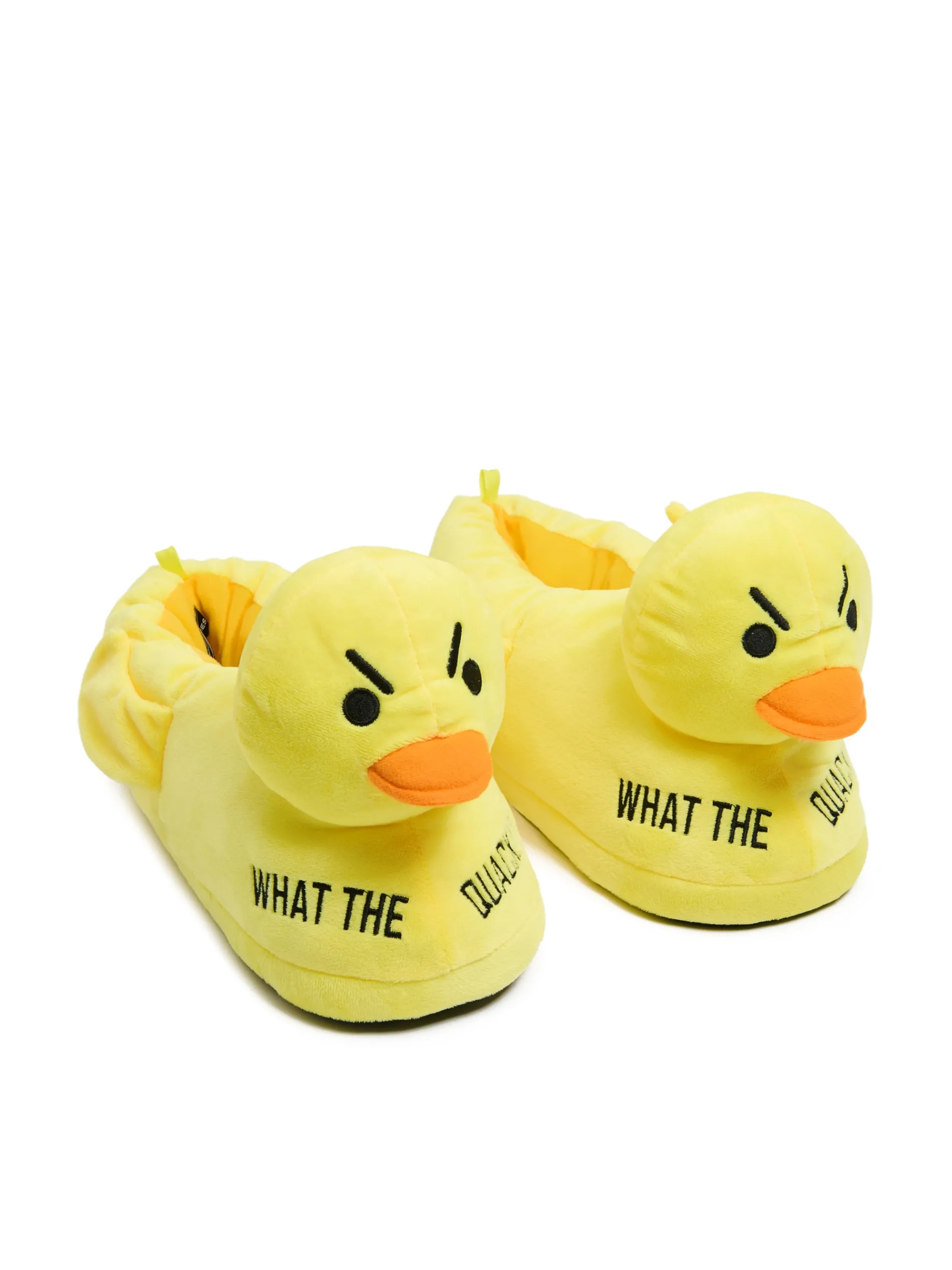 Męskie domowe kapcie w kształcie wybitnie wściekłych kaczek, pytających „What the quack?”. Na płaskiej podeszwie napis oraz specjalne antypoślizgowe wypustki. Instrukcja obsługi: nie karmić chlebem, ziarno jest zdrowsze, nie wypuszczać na staw w parku, zapisać na terapię skoncentrowaną na radzeniu sobie ze złością. Masz ochotę na inną wersję kolorystyczną tych kapci? Kliknij tutaj!