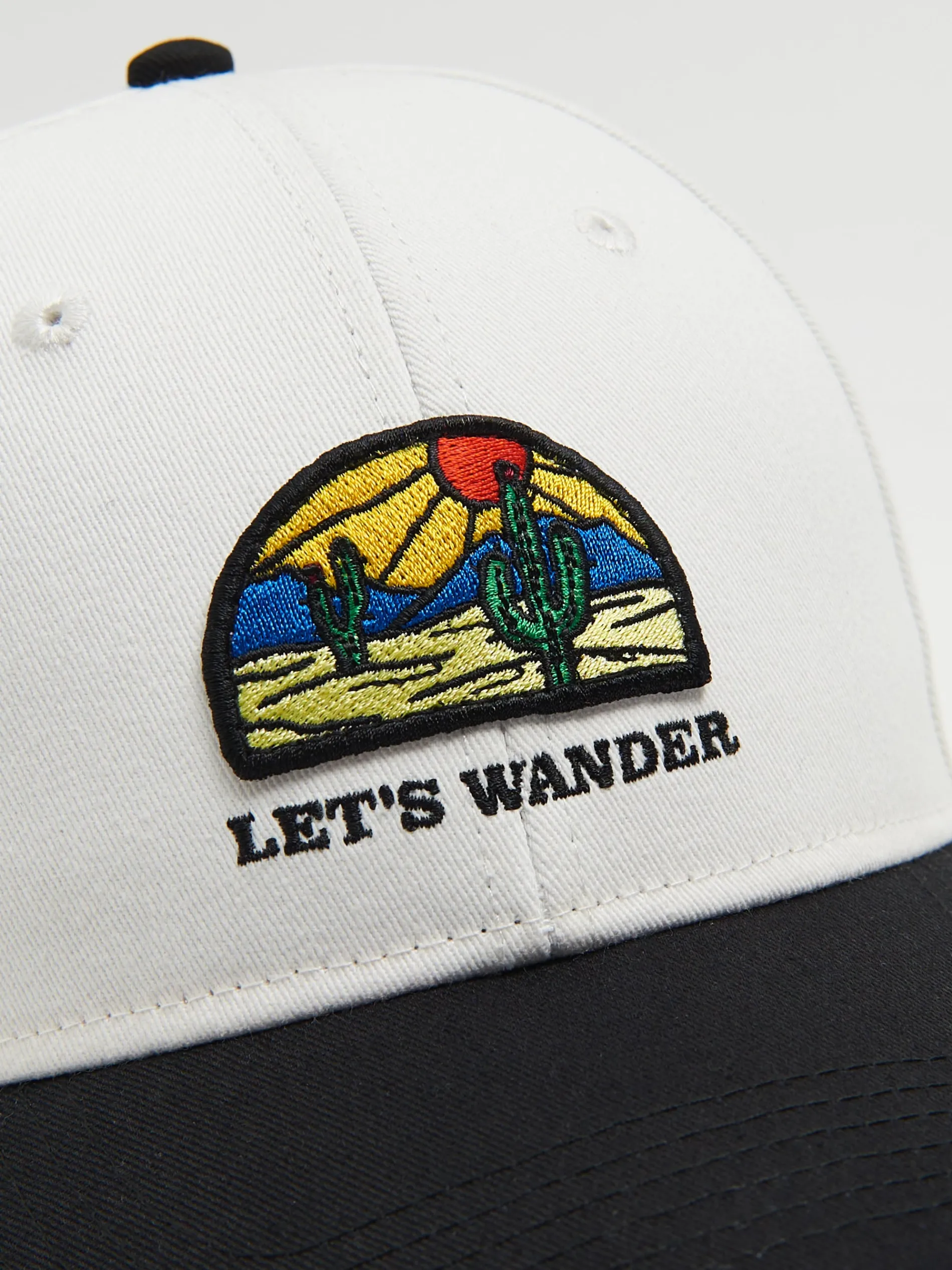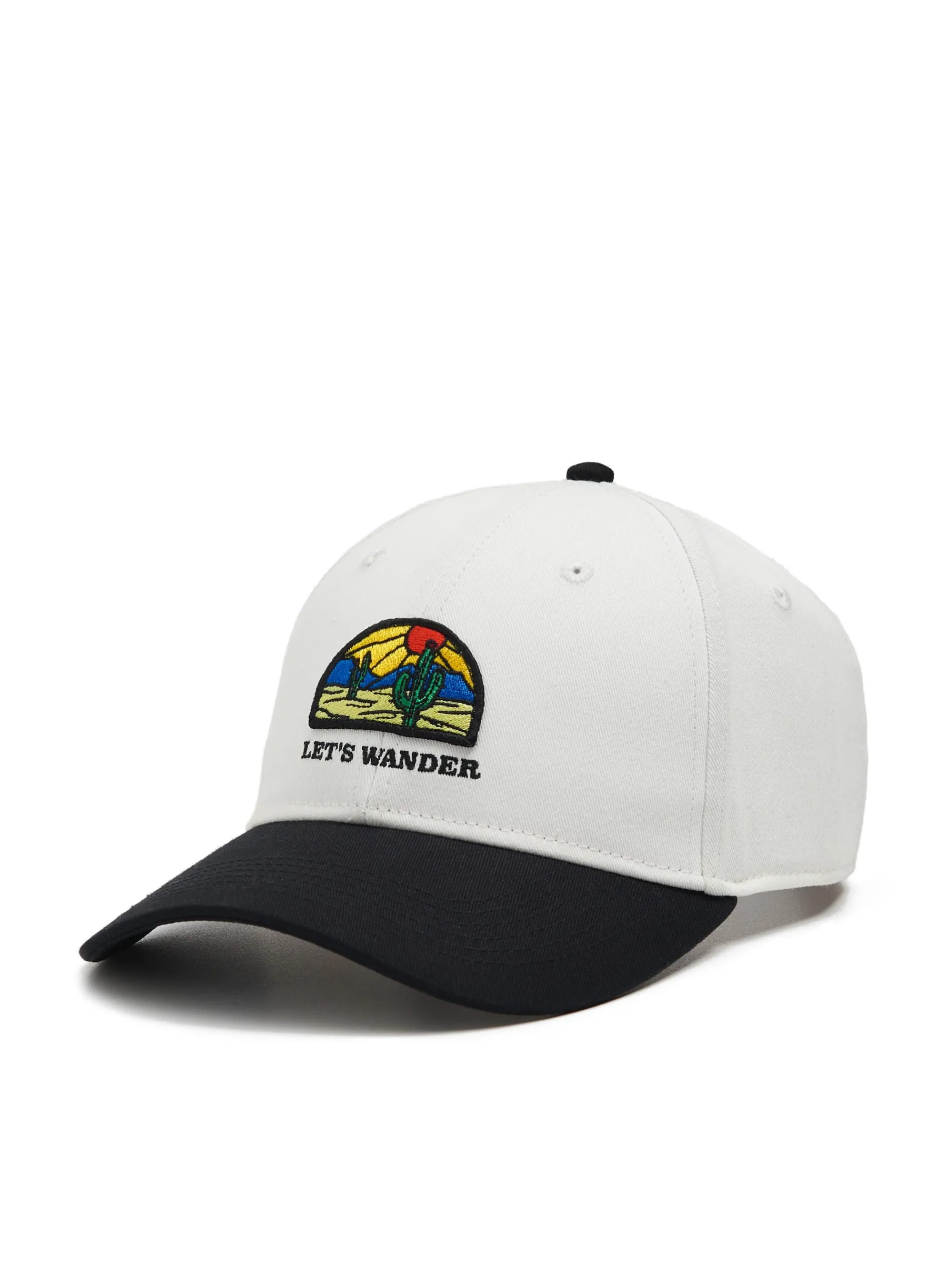 Letnia męska czapka z daszkiem, uszyta z bawełnianej tkaniny. profilowany daszek w kontrasowym kolorze z przodu naszywka i haft z napisem LET’S WANDER możliwość regulacji obwodu za pomocą paska z klamrą