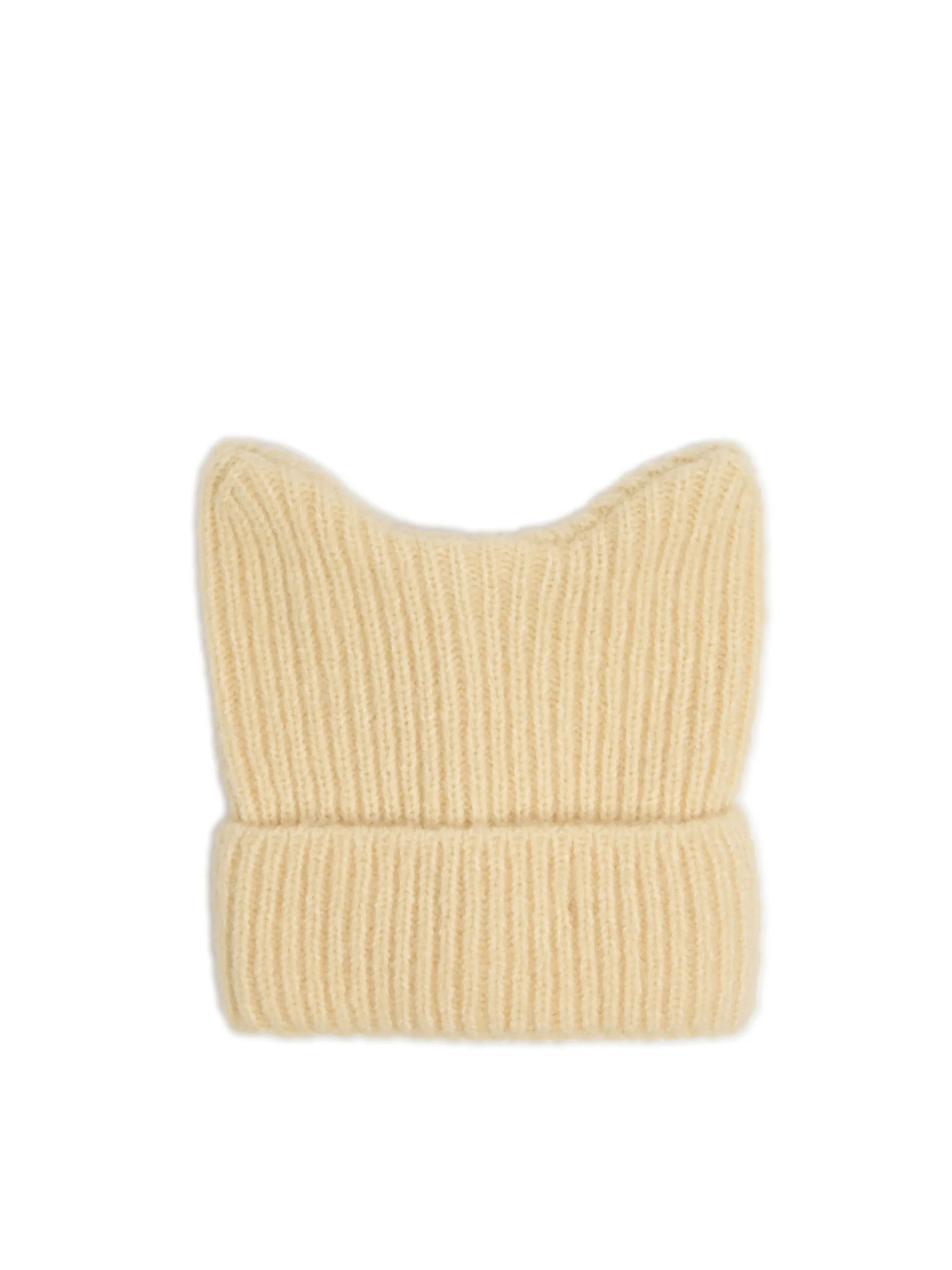 Kremowa damska czapka beanie z kocimi uszkami, uszyta z przyjemnej w dotyku dzianiny.