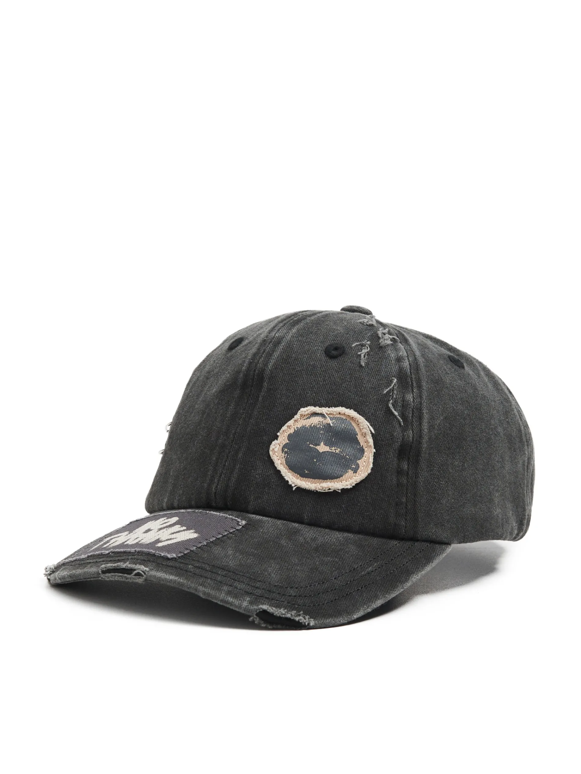 Damska czapka z daszkiem typu bejsbolówka, uszyta w 100% z bawełny. profilowany daszek z postrzępieniami z tyłu regulacja za pomocą paska ozdobne naszywki, agrafki i rozdarcia efekt sprania materiału