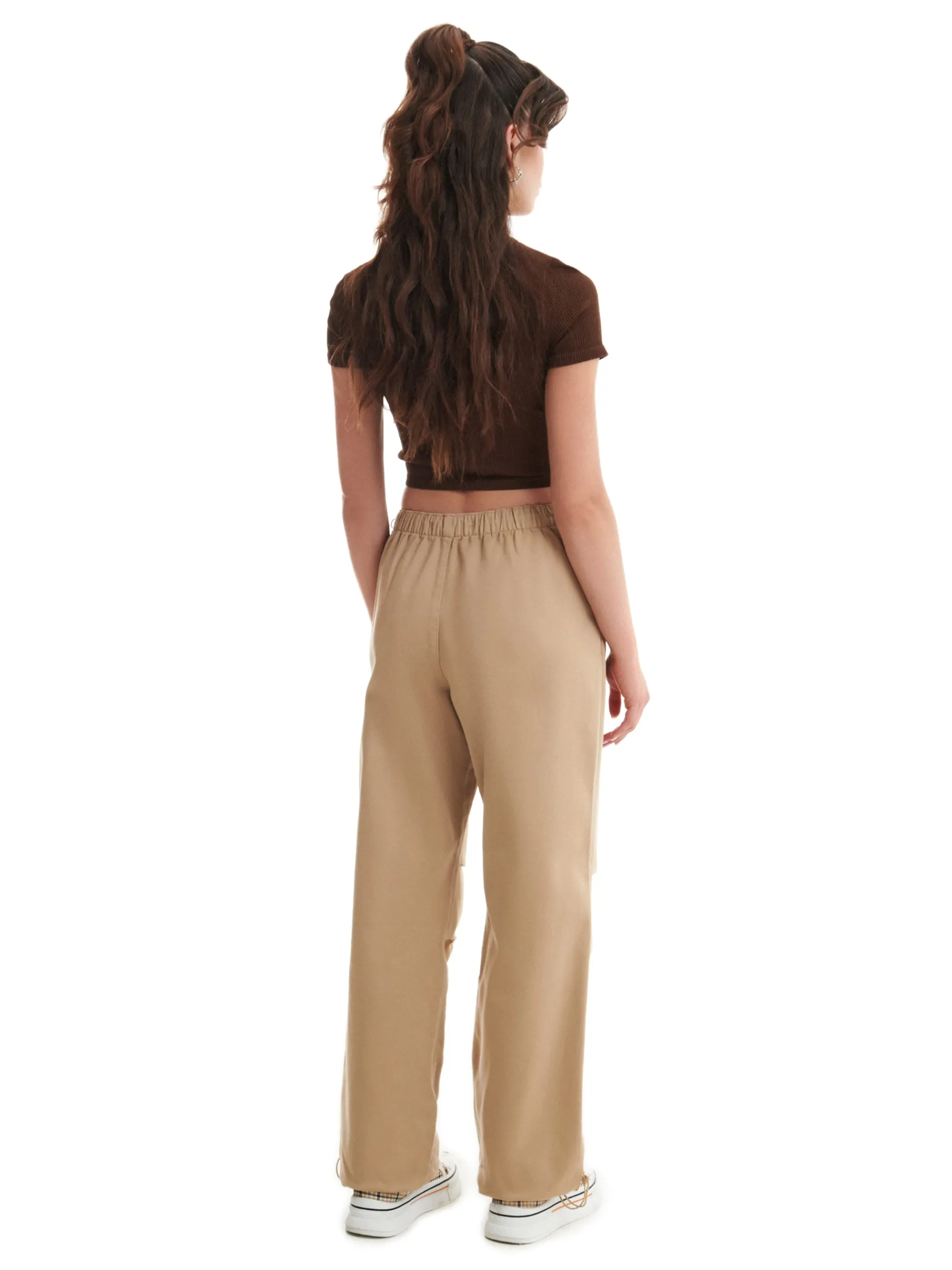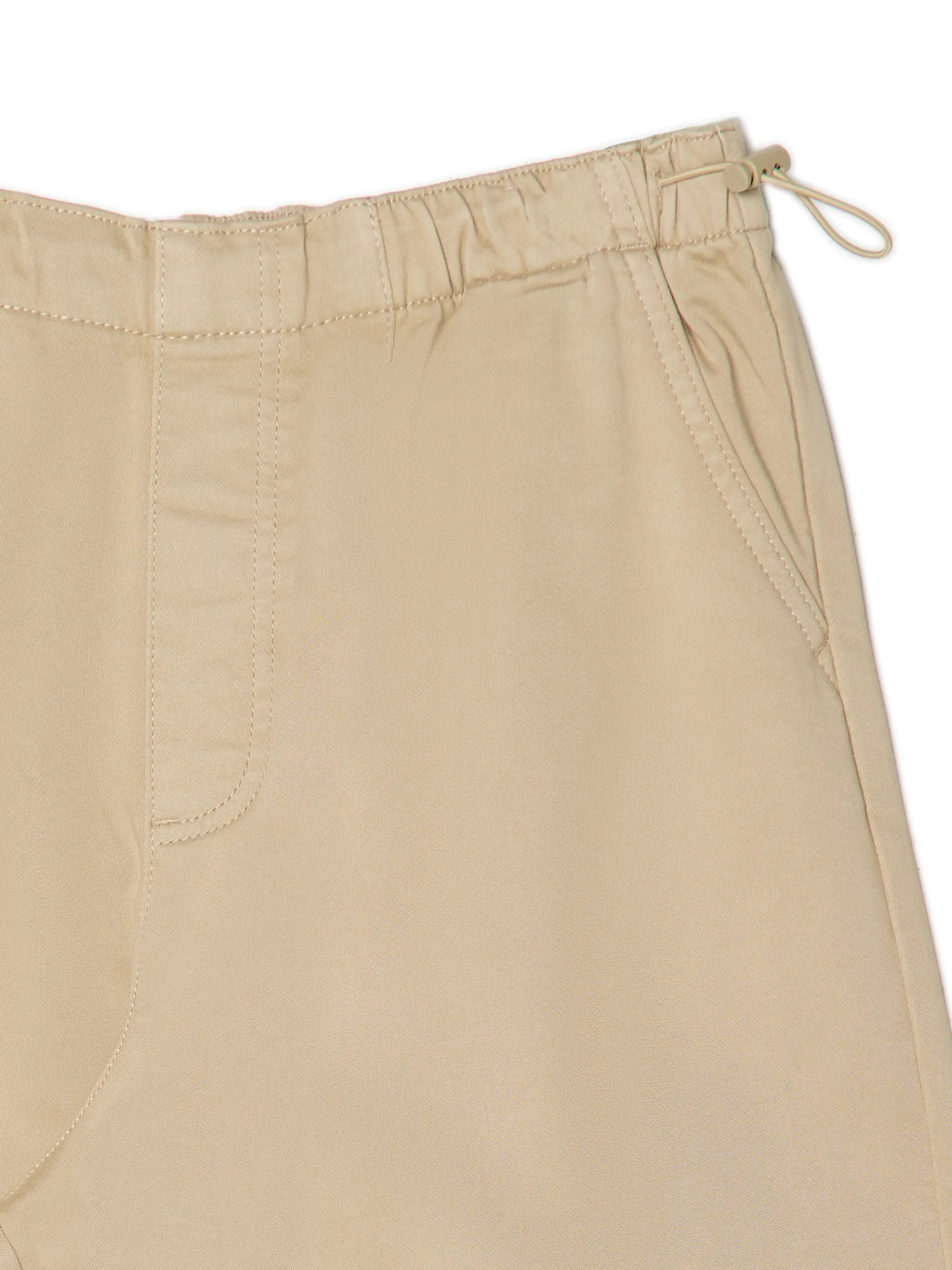 Beżowe spodnie jeansowe w stylu parachute, nazywane też spadochronowymi. Uszyte z tkaniny o wysokiej zawartości bawełny. fason typu loose gumka w pasie boczne kieszenie długa, luźna nogawka zakończona gumką ze stoperem do regulacji obwodu dostępne inne warianty kolorystyczne