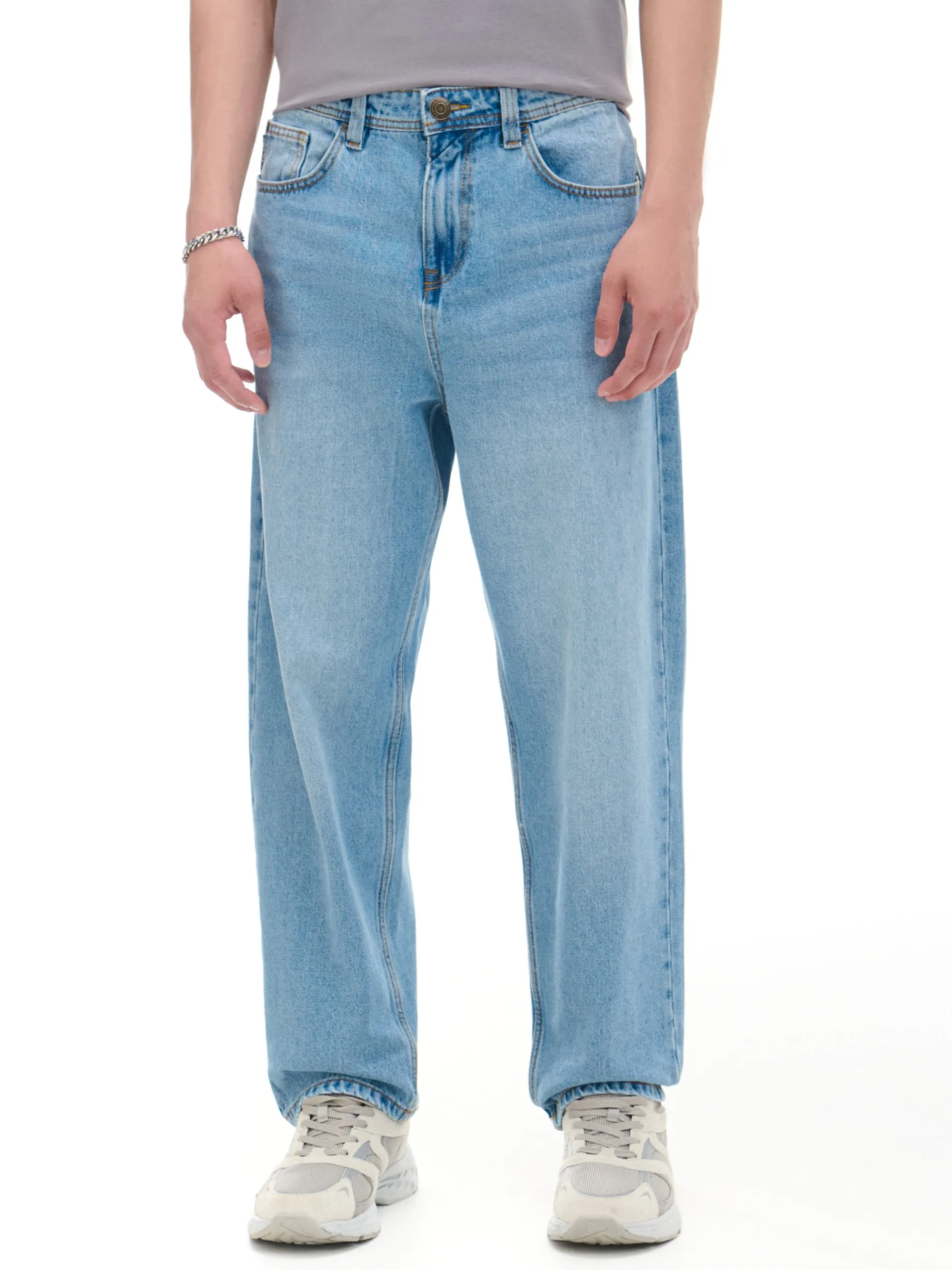 Niebieskie męskie jeansy o kroju loose, uszyte w 100% z bawełny. regularny stan, w pasie zamek i guzik obniżony krok cztery kieszenie luźna nogawka, lekko zwężana ku dołowi efekt sprania materiału szlufki na pasek Model prezentuje produkt w rozmiarze M. Wzrost modela: 185 cm