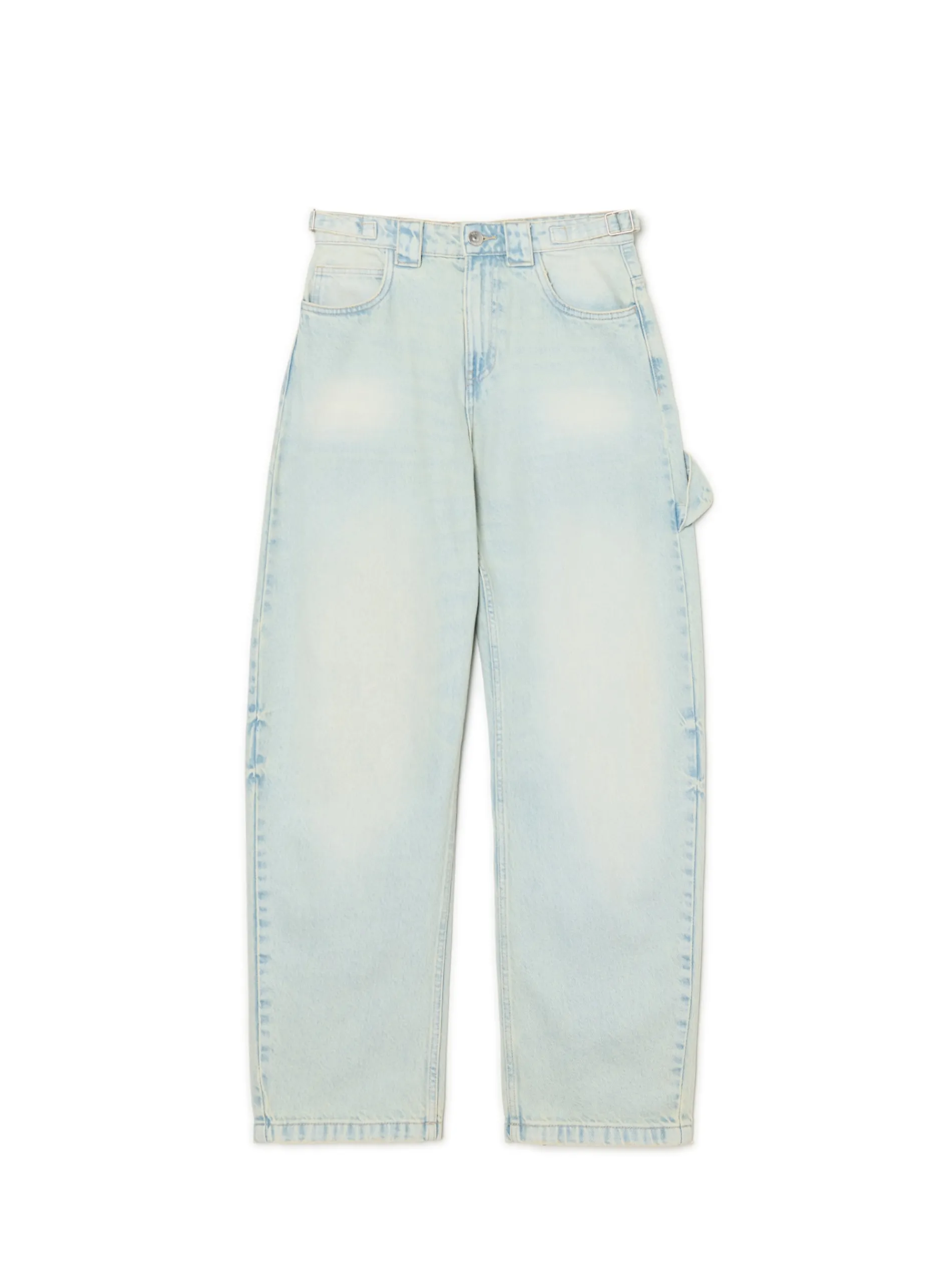 Damskie spodnie jeansowe z wysokim stanem o kroju skater, uszyte z bawełny. Ozdobą tego itemu są paski z metalowymi klamrami i efekt sprania na całości. 100% bawełny swobodny, luźny krój wysoki stan, zapięcie na zamek i guzik pięć kieszeni hammer loop na lewej nogawce dwa wąskie, regulowane paski delikatny efekt sprania Wzrost modelki: 177 cm