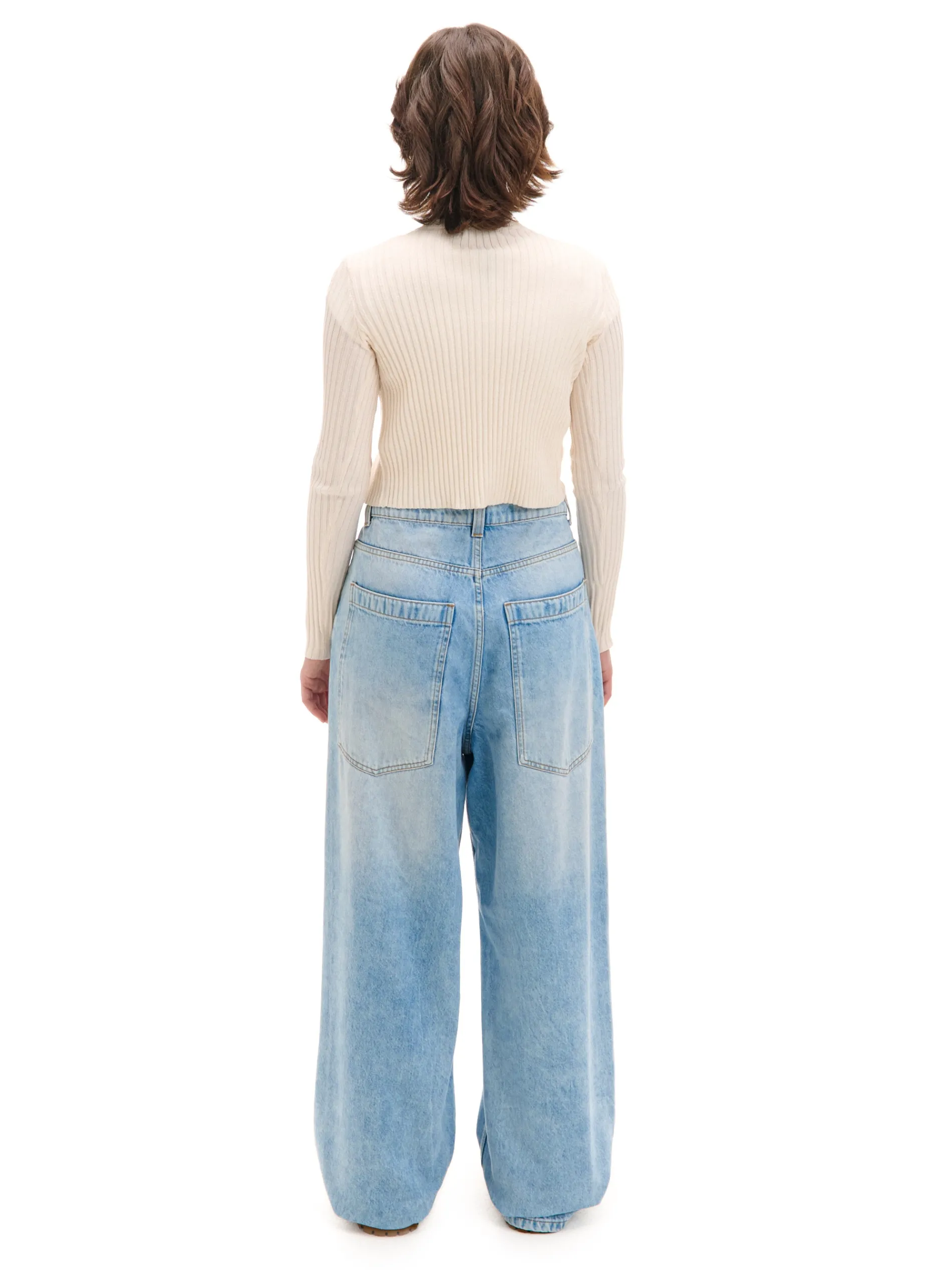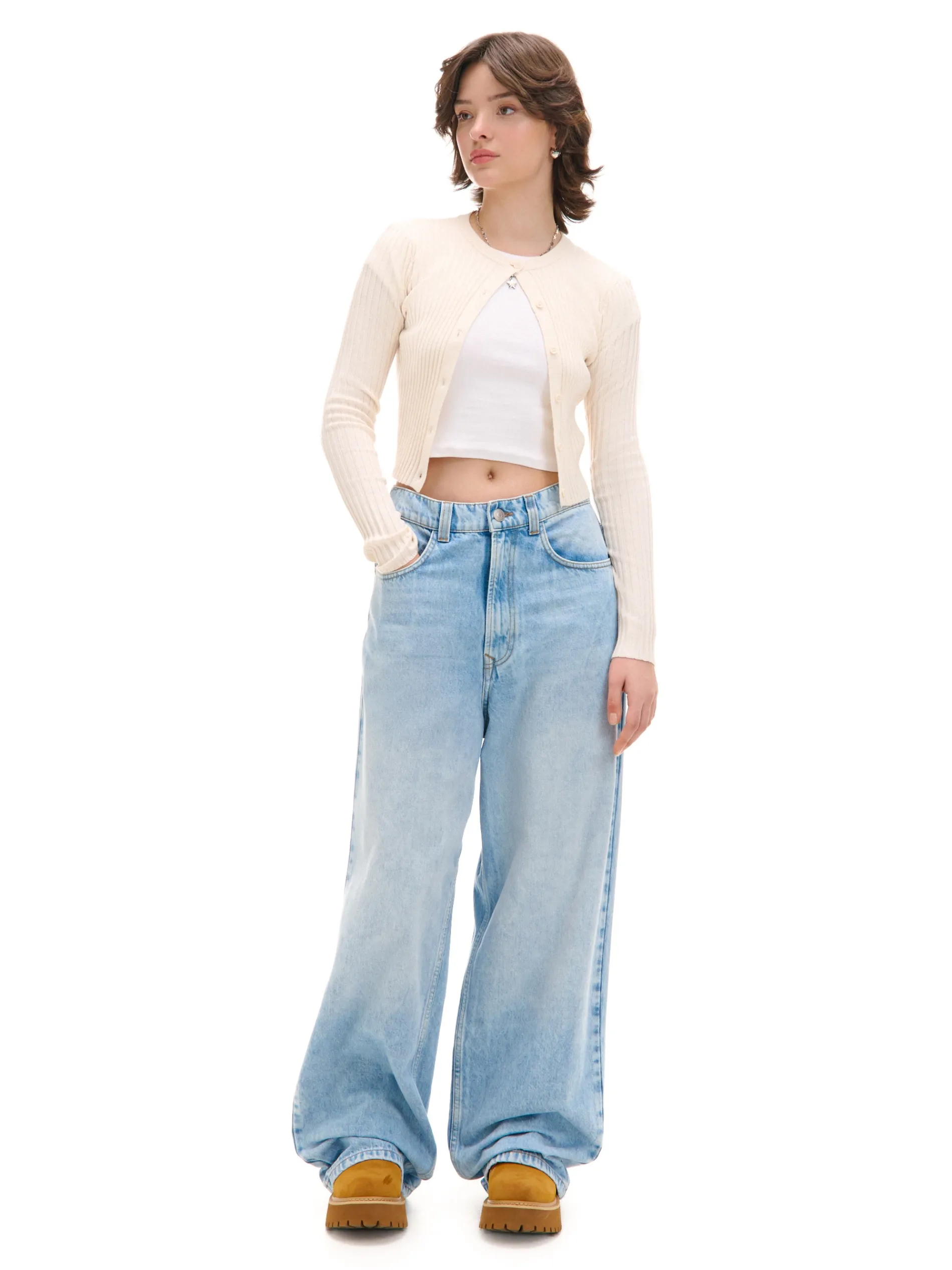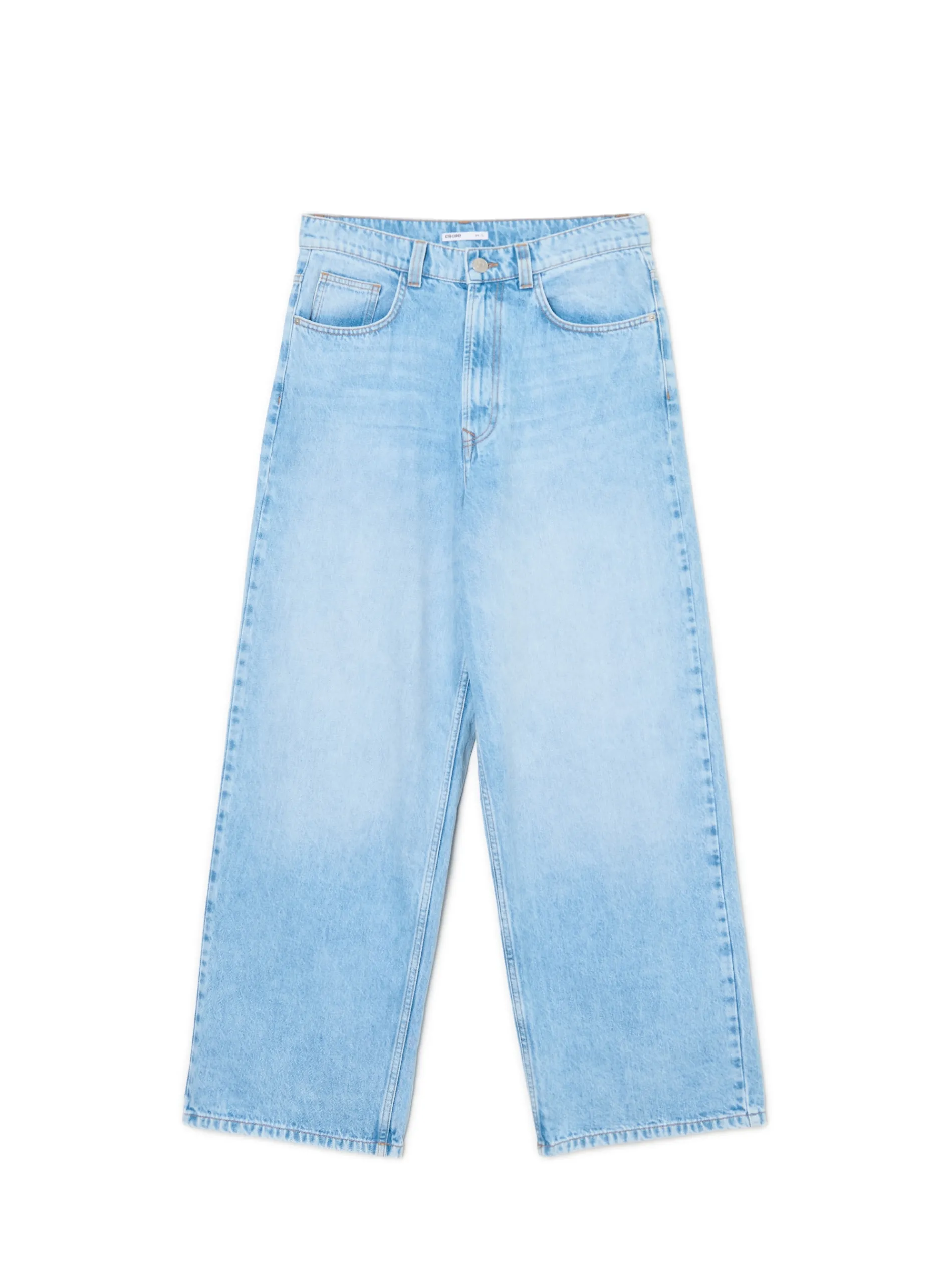 Damskie spodnie jeansowe o kroju super baggy uszyte z bawełnianej tkaniny. Bardzo szerokie nogawki, praktyczne kieszenie i wygodne zapięcie zapewniają komfort. Must-have casual na spontaniczne wypady! denimowe spodnie o kroju loose 100% bawełny zapięcie na zamek i guzik cztery kieszenie jedna mała kieszeń na drobniaki szerokie szlufki na pasek lekki efekt sprania na udach i pośladkach