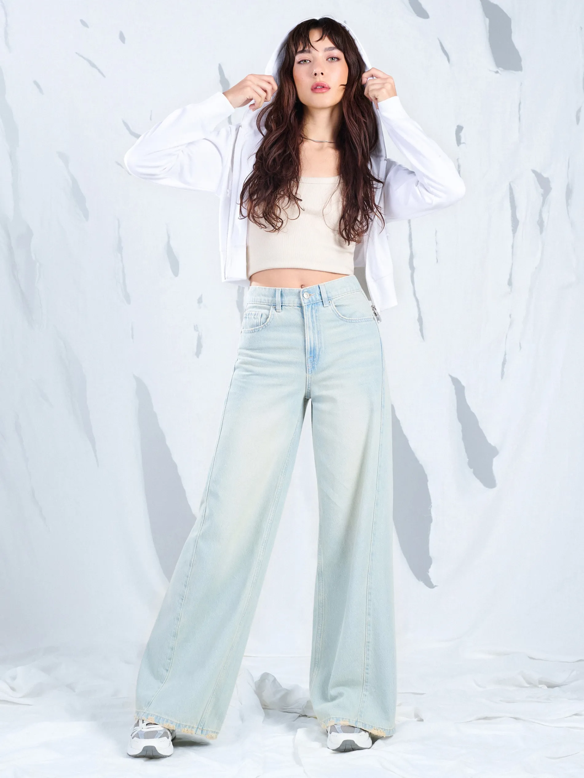 Jasne spodnie damskie typu wide leg, uszyte z bawełnianej tkaniny z surowo wykończonymi nogawkami. 100% bawełny długie, szerokie nogawki zapięcie na zamek i guzik pięć kieszeni surowe wykończenie nogawki z postrzępieniami efekt sprania na całości