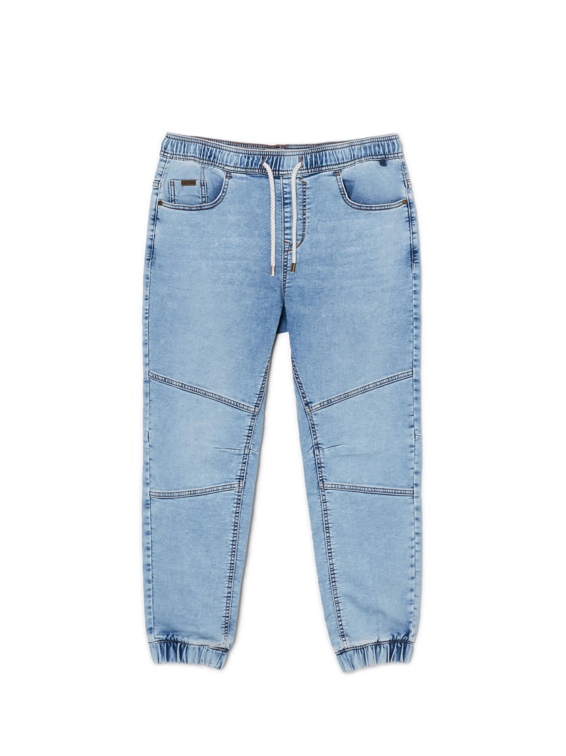 Męskie joggery w jasnoniebieskim odcieniu z ozdobnymi przeszyciami wokół kolan. Czas na mix and match ze swoimi ulubionymi koszulkami! materiał z dużą zawartością bawełny wygodny krój typu jogger klasyczne 5 kieszeni dwie pary kieszeni z przodu i tyłu ściągacze w nogawkach elastyczna gumka w pasie regulowana sznurkiem z ozdobnymi trokami