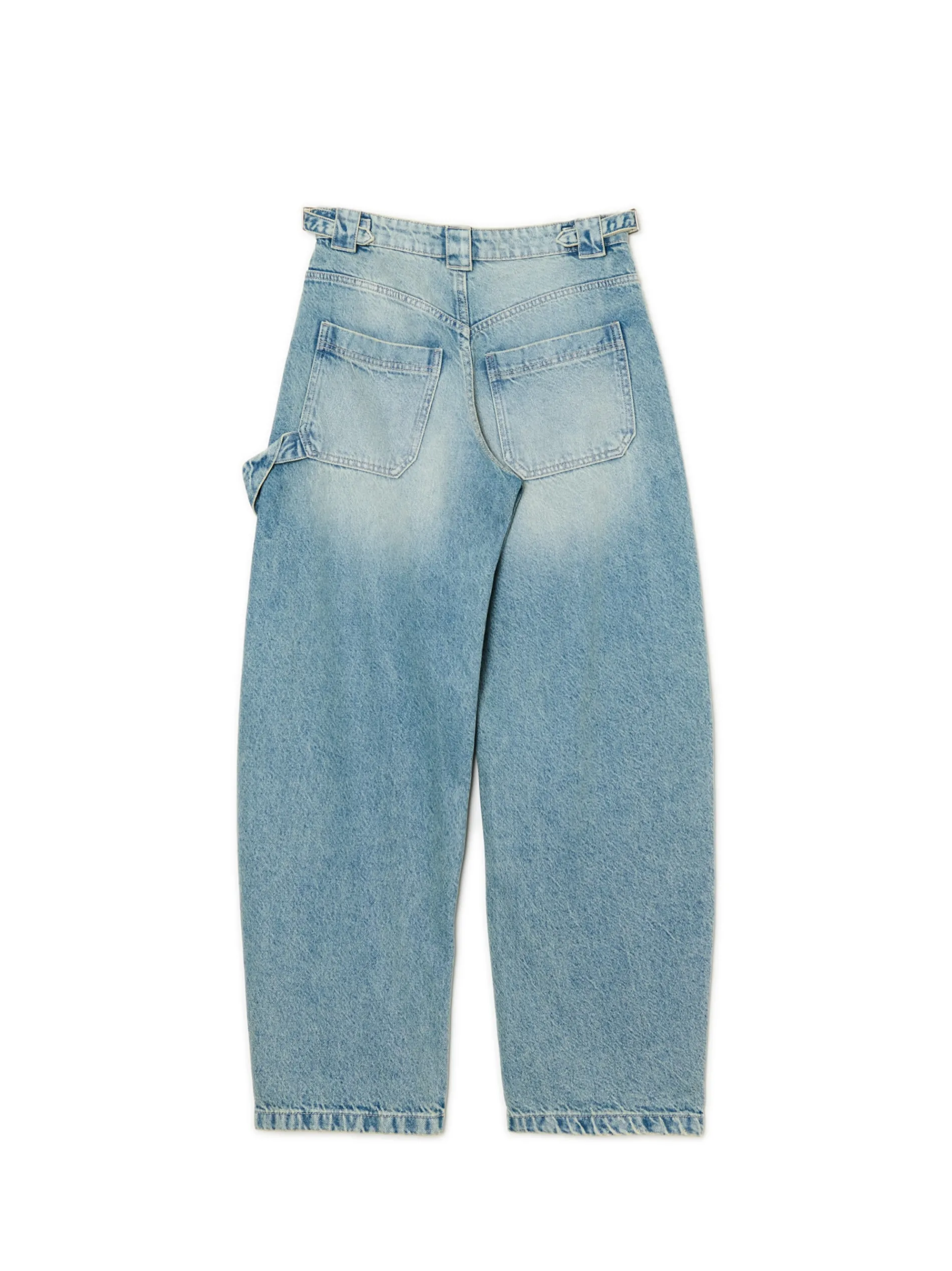 Damskie spodnie jeansowe z wysokim stanem o kroju skater, uszyte z bawełny. Ozdobą tego itemu są paski z metalowymi klamrami i efekt sprania na całości. 100% bawełny swobodny, luźny krój wysoki stan, zapięcie na zamek i guzik pięć kieszeni hammer loop na lewej nogawce dwa wąskie, regulowane paski delikatny efekt sprania Wzrost modelki: 177 cm