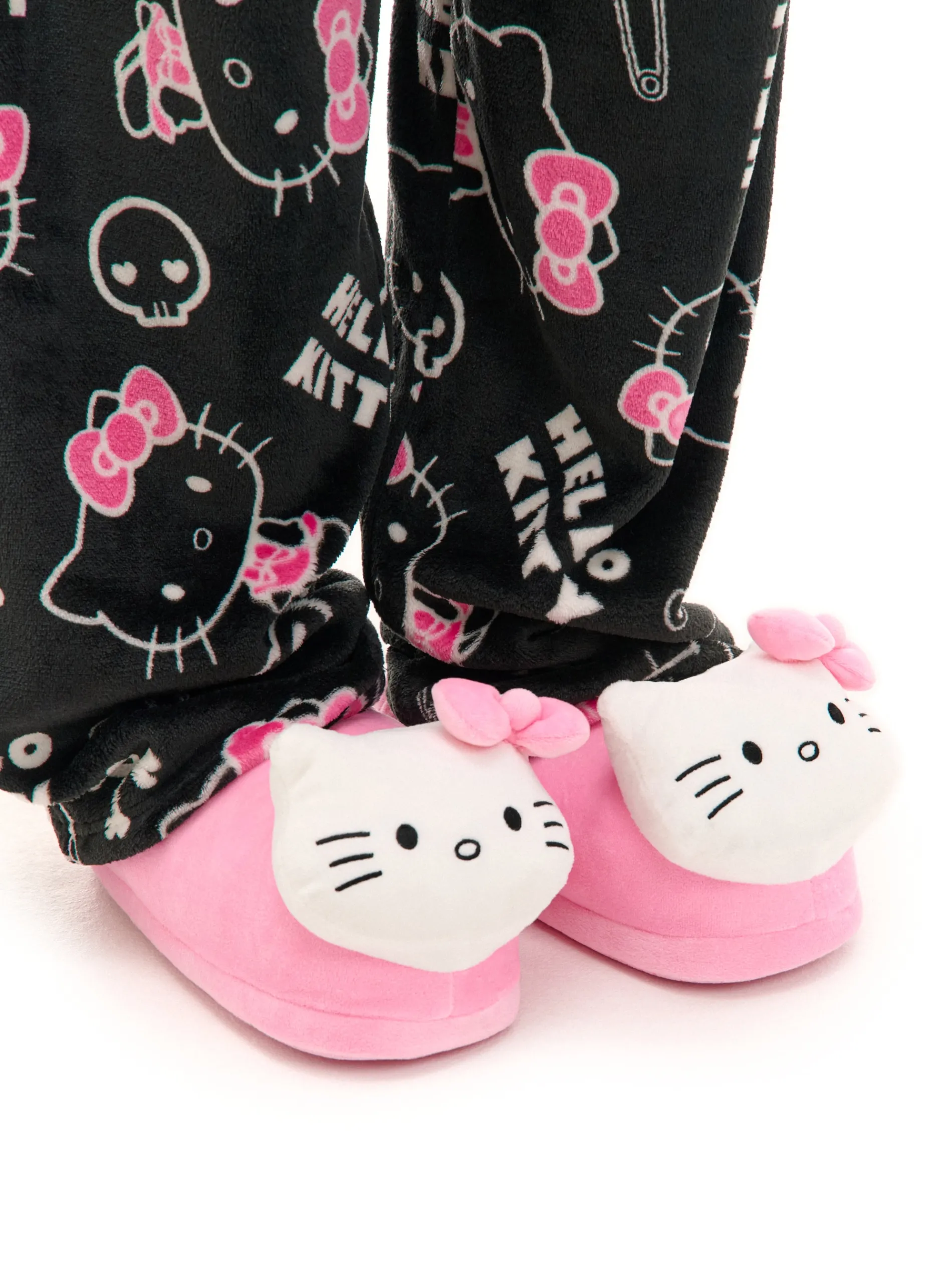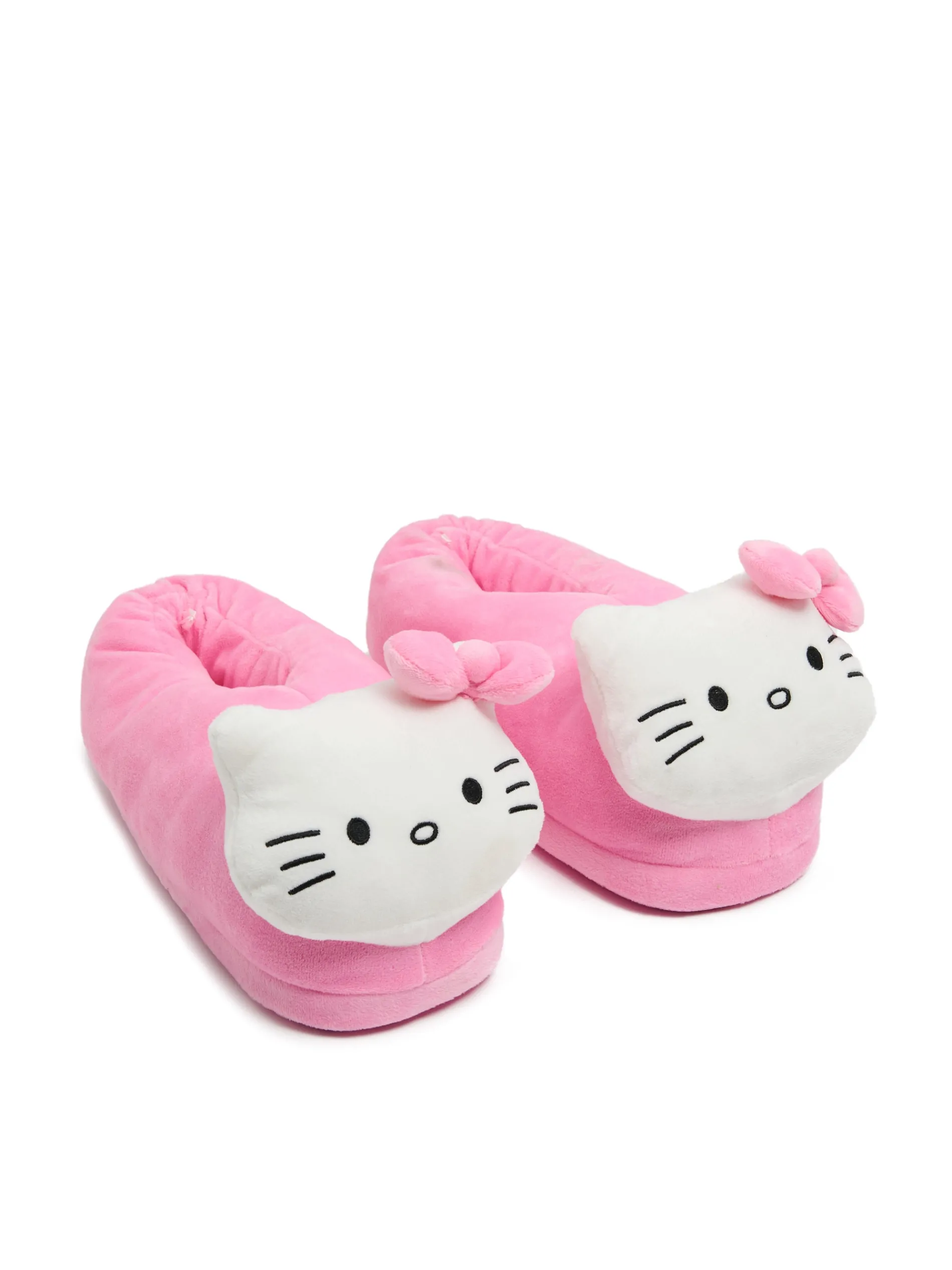 Damskie kapcie uszyte z miękkiej, pluszowej dzianiny w różowym kolorze. Z przodu ozdobne wstawki z motywem światowej sławy kota, Hello Kitty z charakterystyczną kokardą. Idealne na pyjama party!