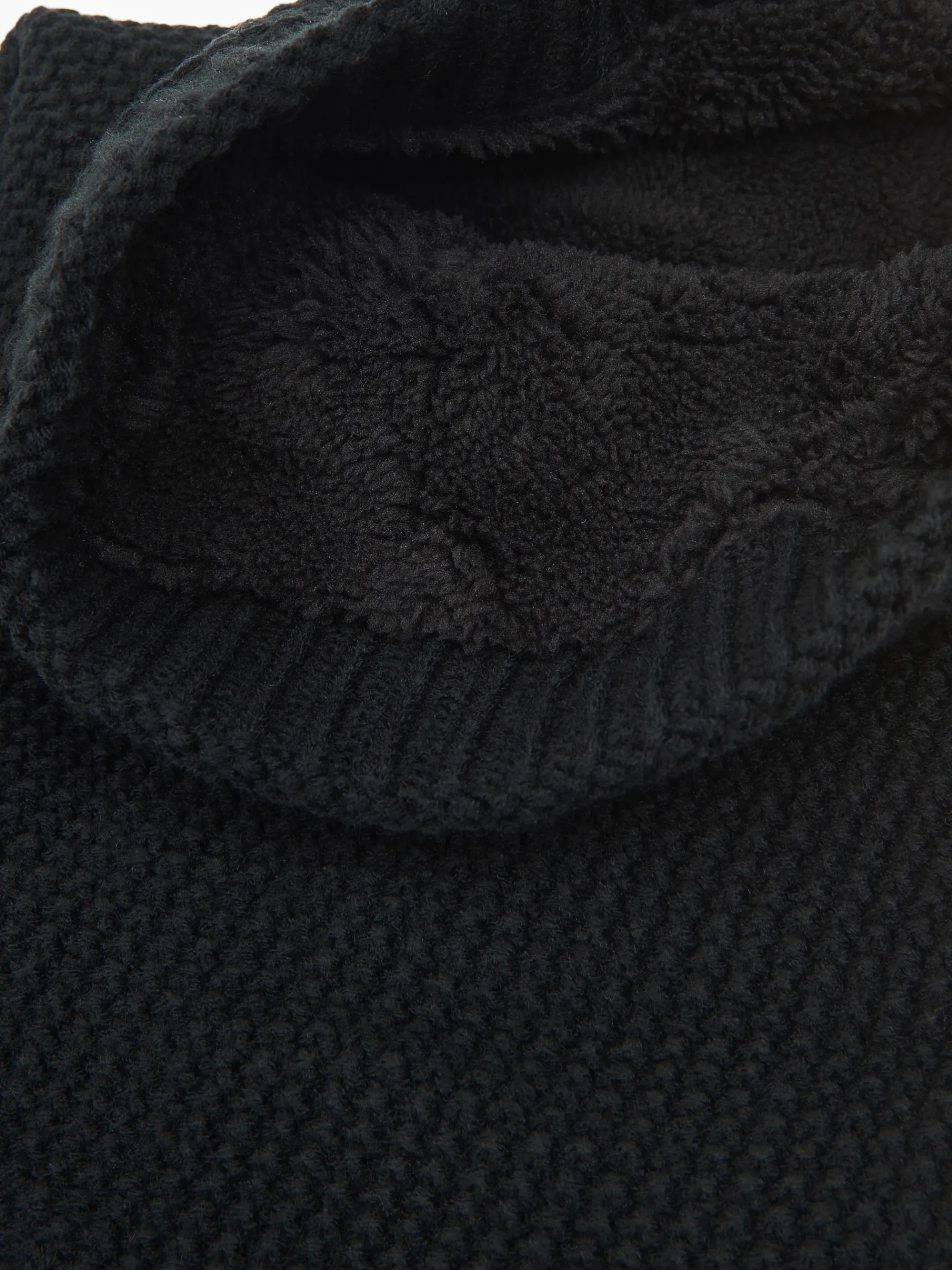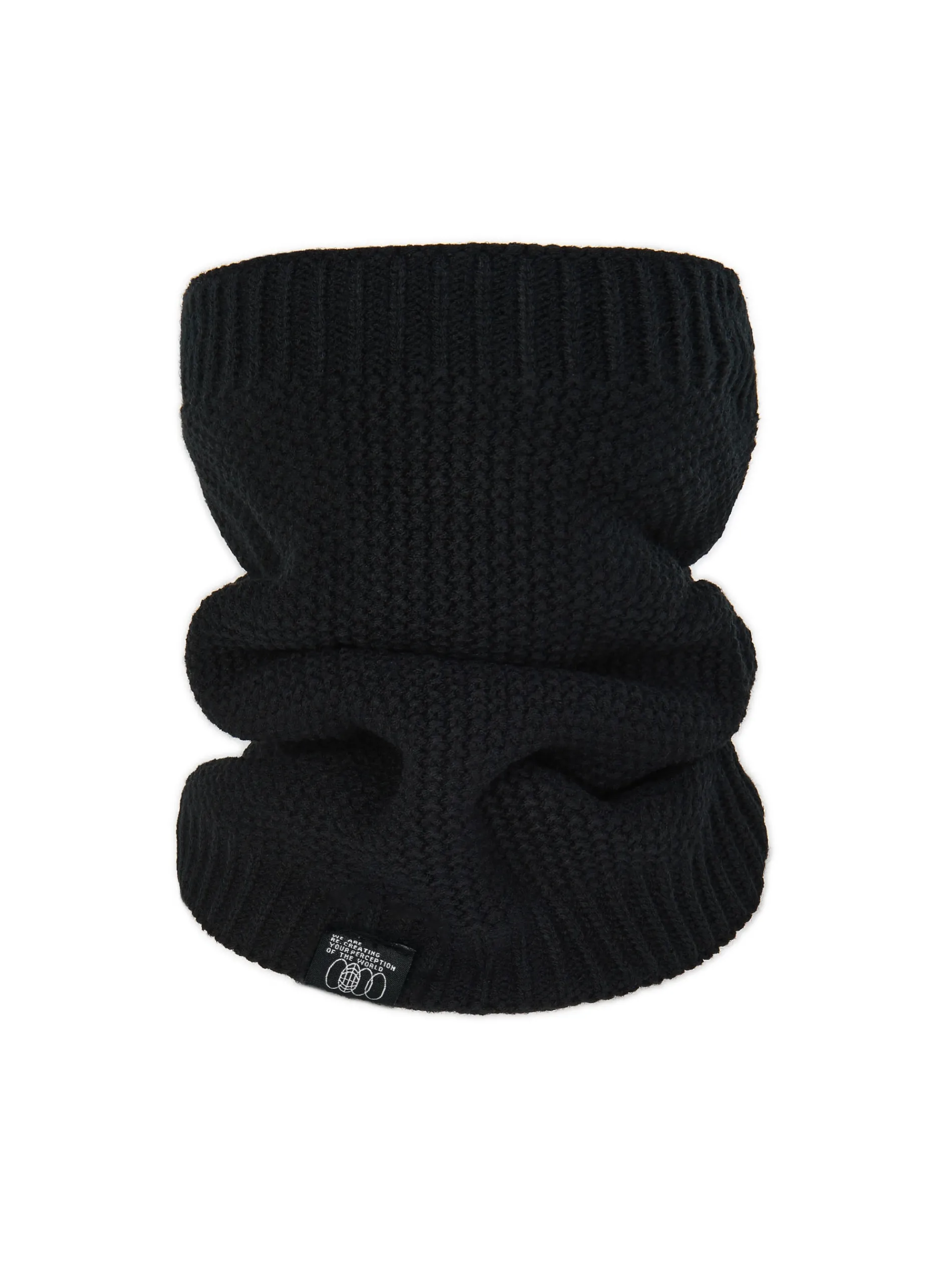 Czarny męski szalik typu komin, uszyty z grubej, mięsistej dzianiny o ciekawym splocie. U dołu ozdobiony niewielką metką z napisami. Praktyczne must-have na zimne miesiące!