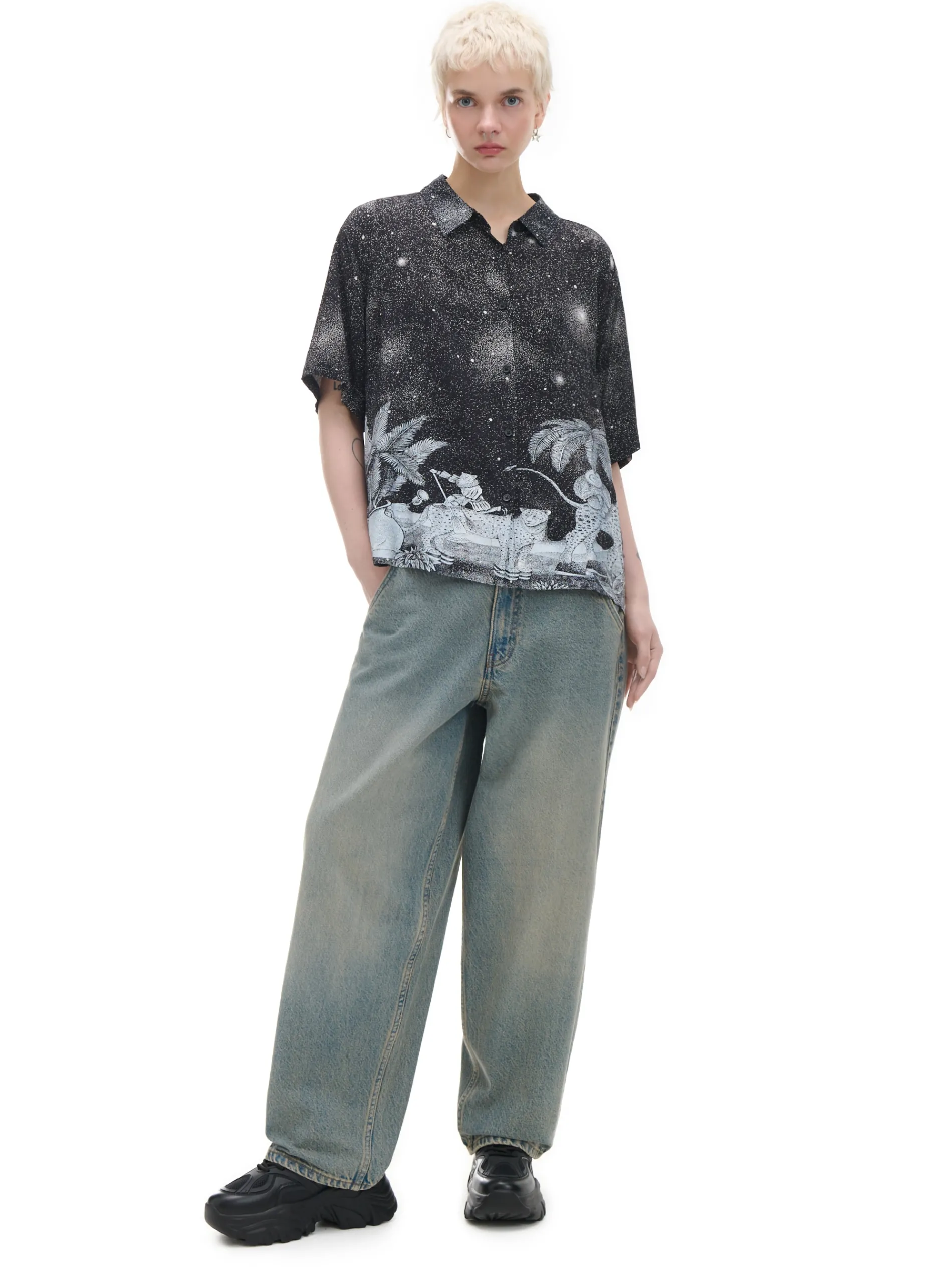 Damska koszula uszyta w 100% z wiskozy w kroju oversize. Nadruk na przodzie inspirowany pracami Dimy Kashtalyana. lekki materiał z wiskozą luźny krój oversize jednorzędowe zapięcie na guziki klasyczny kołnierzyk krótkie, swobodne rękawy nadruk w formie artystycznej grafiki Ten produkt powstał w ramach kolaboracji Cropp x DIMA. Sprawdź jego inne prace: @dkashtalyan i zainspiruj się twórczą energią!