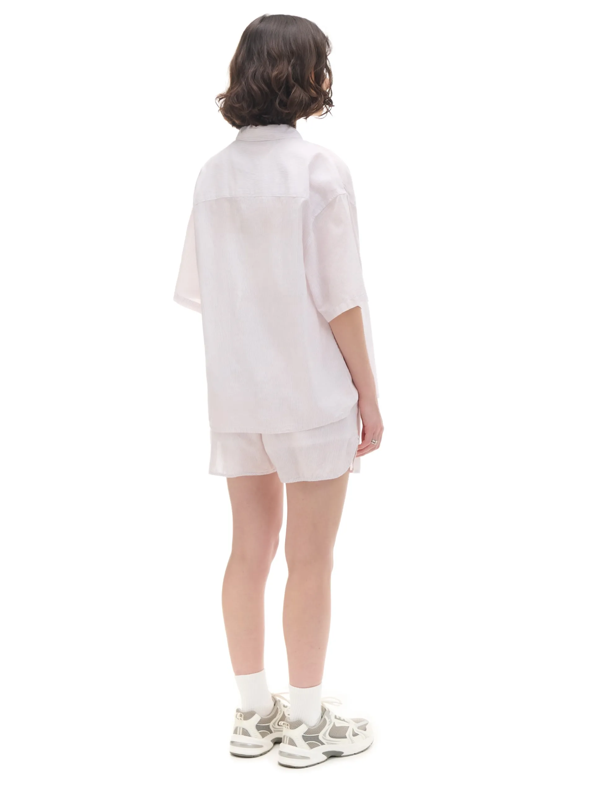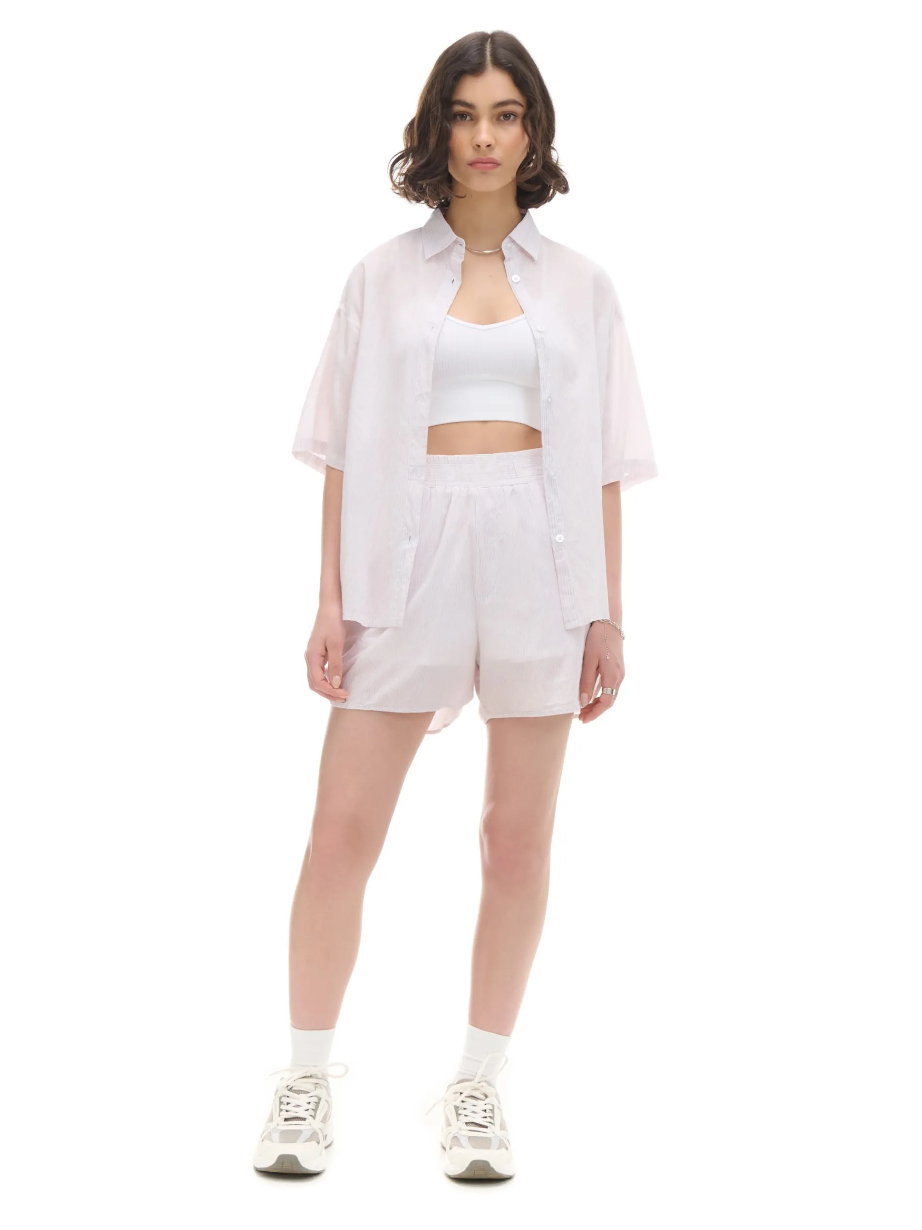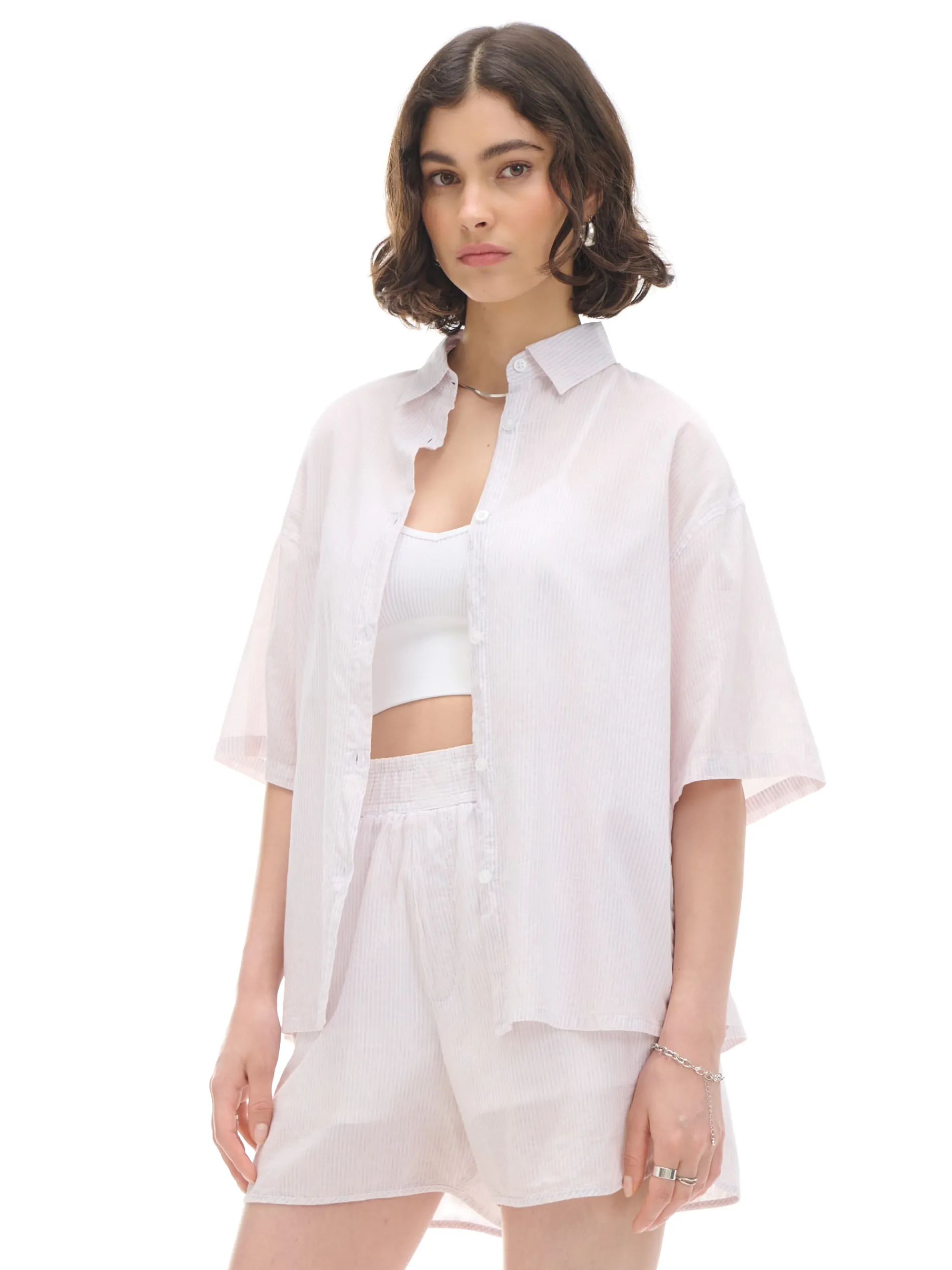 Damska koszula o kroju oversize, uszyta z bawełny ze wzorem w paski. Przewiewny materiał i luźny fason zapewnią Ci wygodę w ciepłe dni! 100% bawełny krój oversize klasyczny kołnierzyk krótkie, szerokie rękawy jednorzędowe zapięcie na guziki wzór w paski na całości tworzy zestaw z szortami z tego samego materiału Wzrost modelki: 172 cm