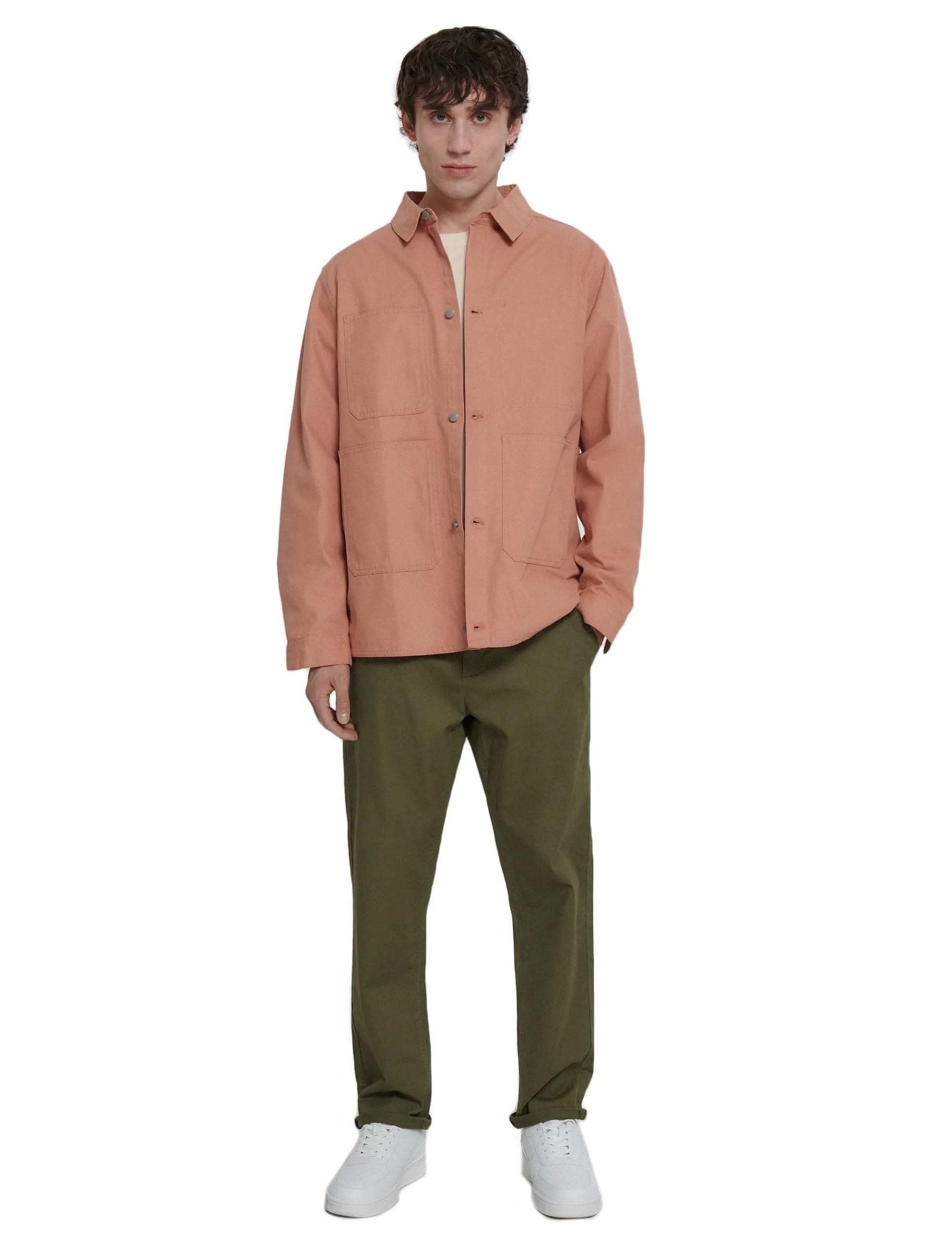 Męska koszula wierzchnia, uszyta z grubej bawełnianej tkaniny. regularny krój zapięcie na guziki, kołnierzyk długie rękawy, zakończone mankietem zapinanym na guzik trzy duże kieszenie zewnętrzne jedna kieszeń wewnątrz Wzrost modela: 186 cm