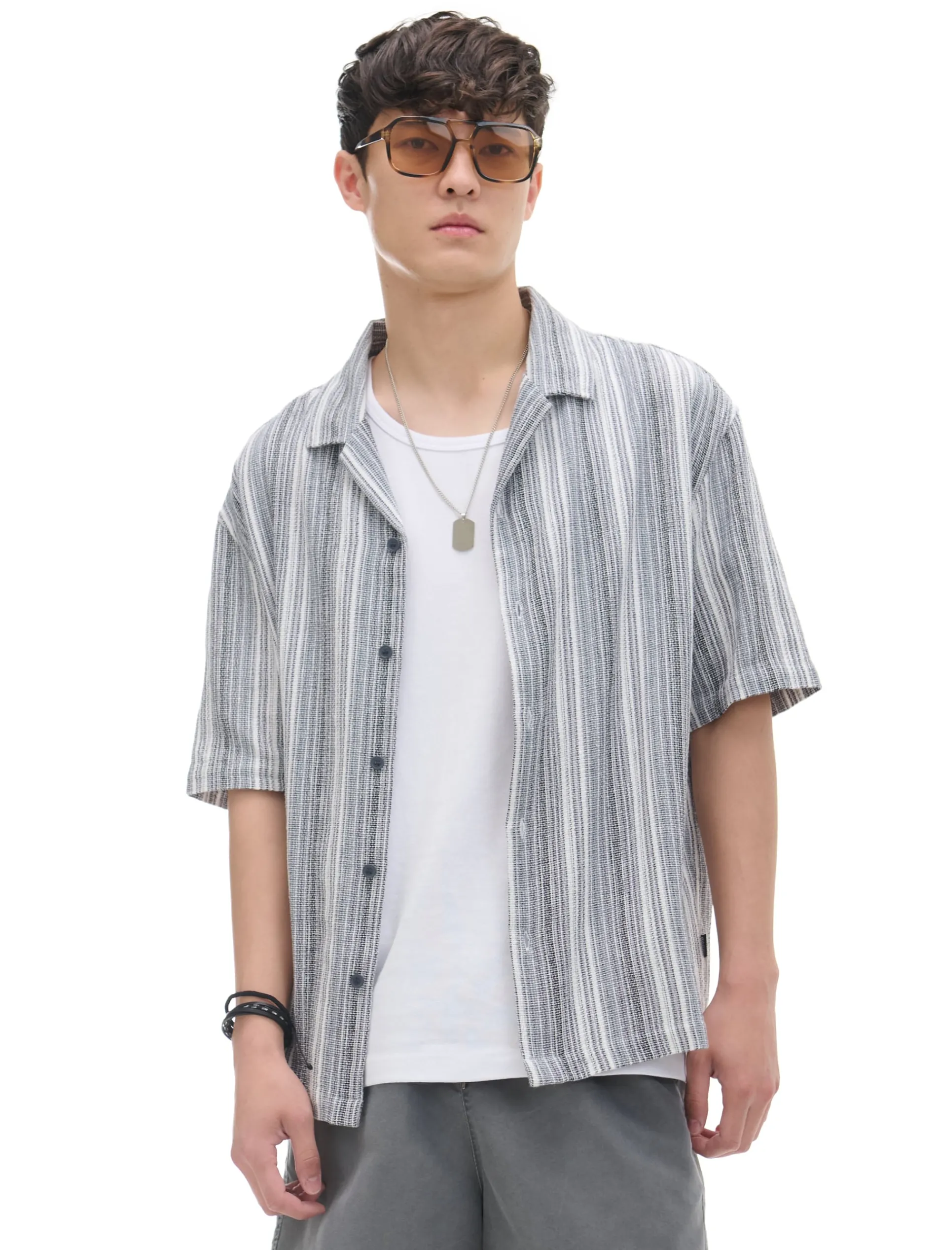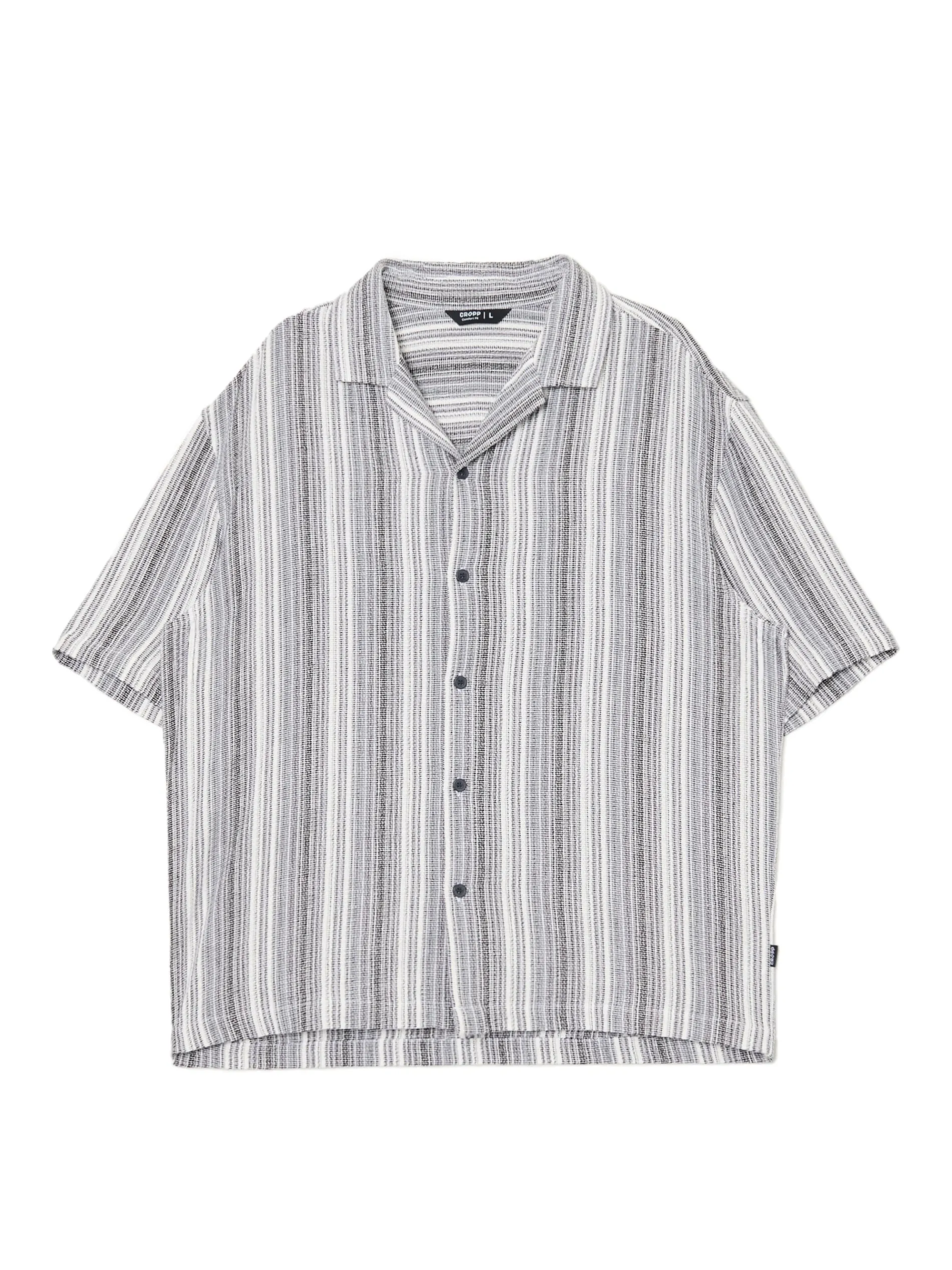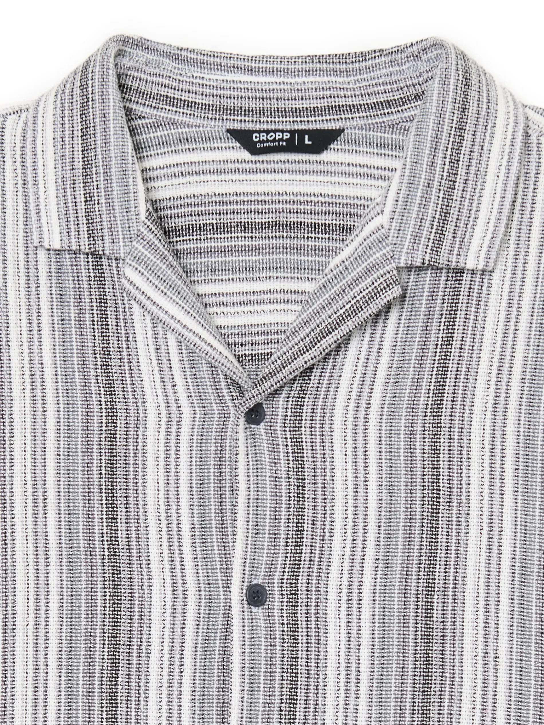 Męska letnia koszula, uszyta w 100% z bawełny. Idealna do wakacyjnych outfitów! krótki krój pod szyją kołnierzyk krótkie rękawy zapięcie na guziki wzór w cienkie pionowe paski all over Model prezentuje produkt w rozmiarze M. Wzrost modela: 185 cm