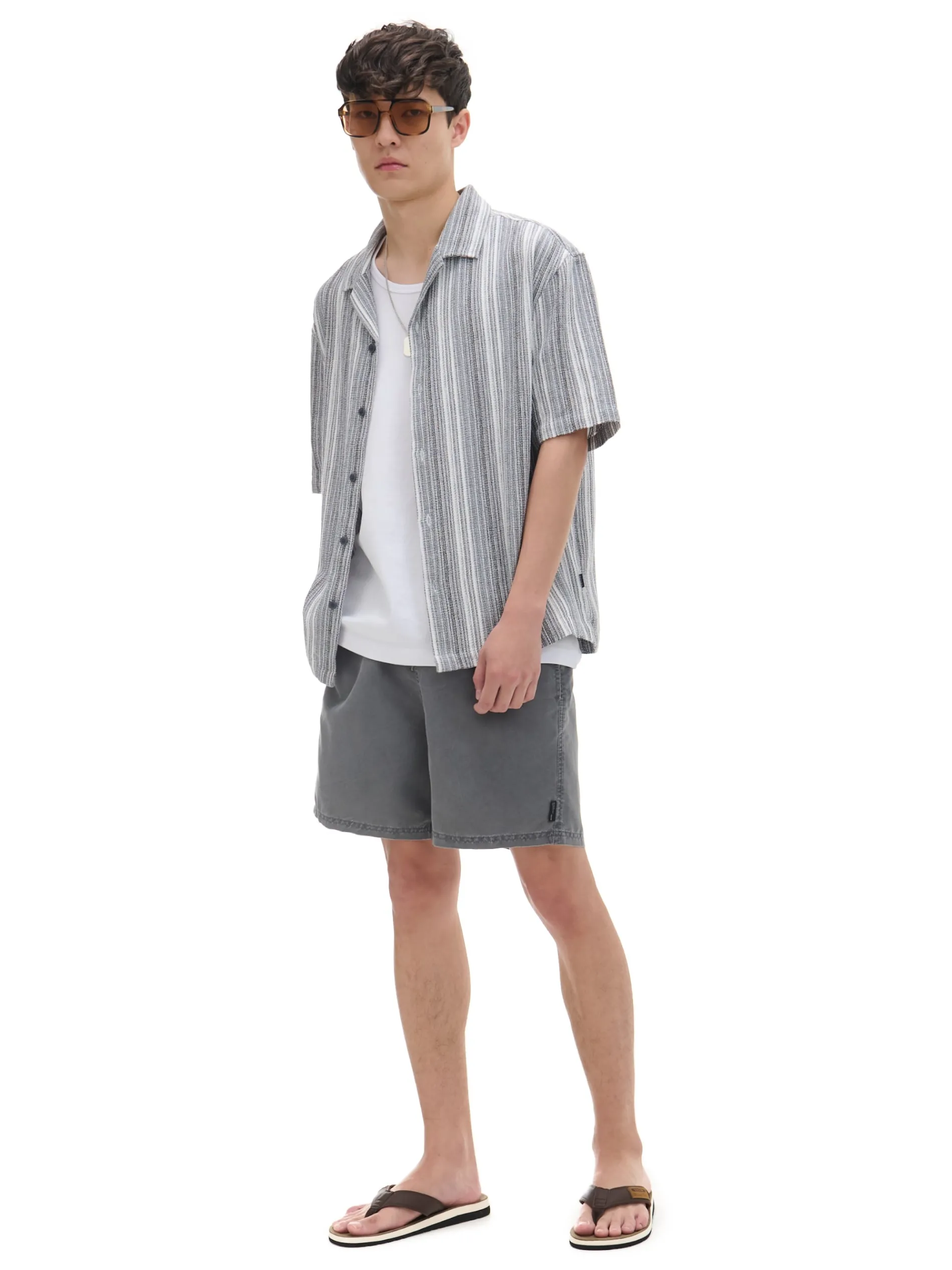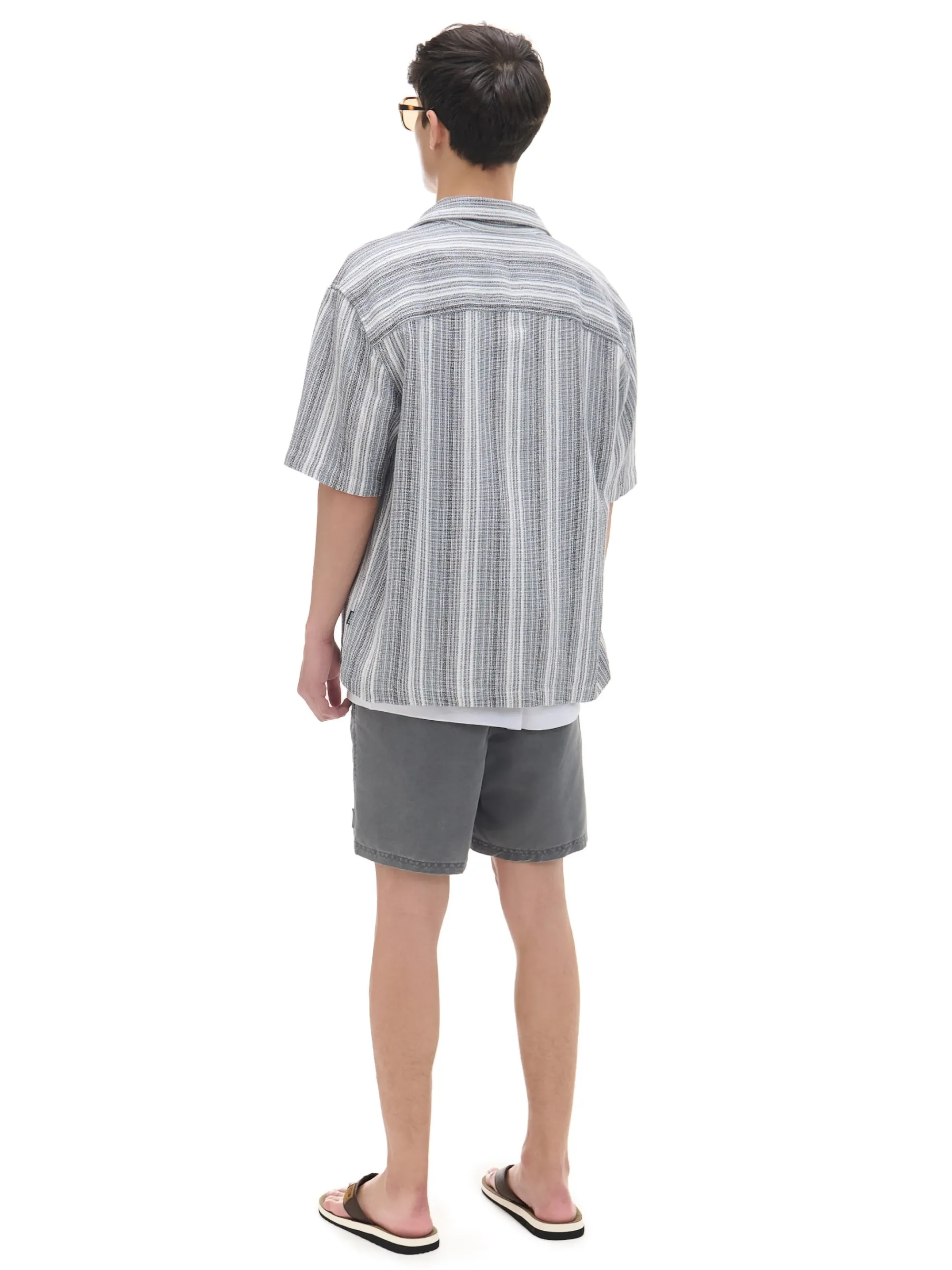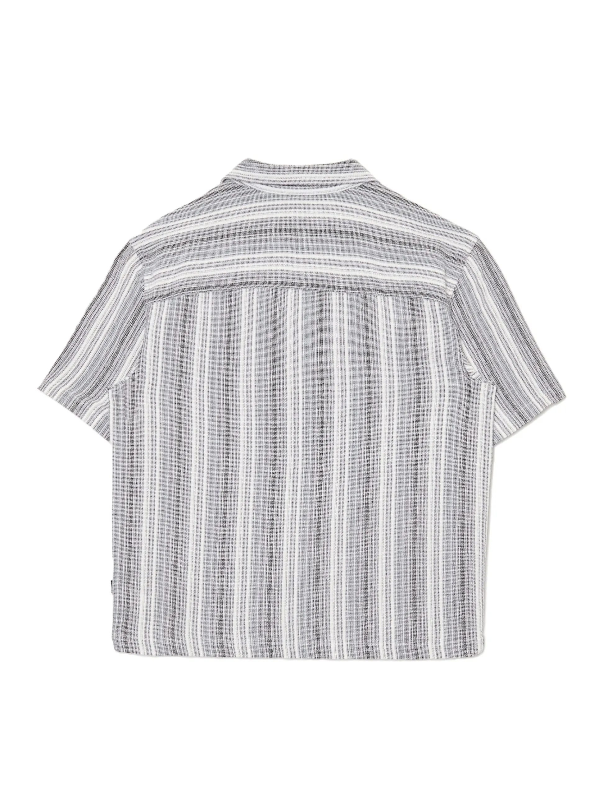 Męska letnia koszula, uszyta w 100% z bawełny. Idealna do wakacyjnych outfitów! krótki krój pod szyją kołnierzyk krótkie rękawy zapięcie na guziki wzór w cienkie pionowe paski all over Model prezentuje produkt w rozmiarze M. Wzrost modela: 185 cm