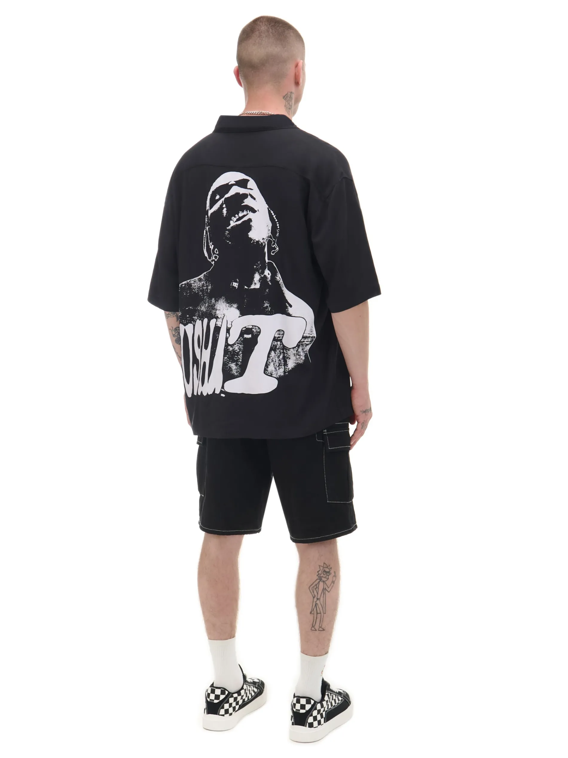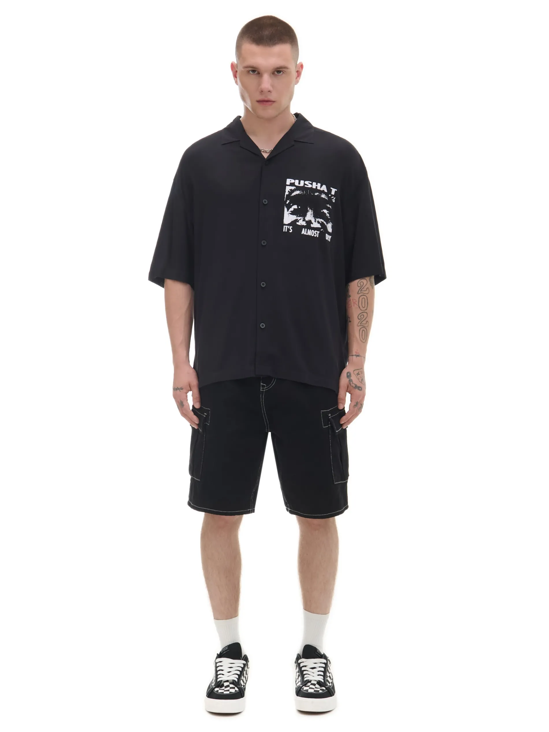 Męska koszula z krótkim rękawem uszyta z wiskozy. Na przodzie i plecach licencjonowany print z Pushą T. 100% wiskozy regularny krój jednorzędowe zapięcie na guziki krótkie, swobodne rękawy kołnierz z otwartymi klapami mały nadruk na piersi, duży nadruk na plecach Model prezentuje produkt w rozmiarze M/L. Wzrost modela: 185 cm