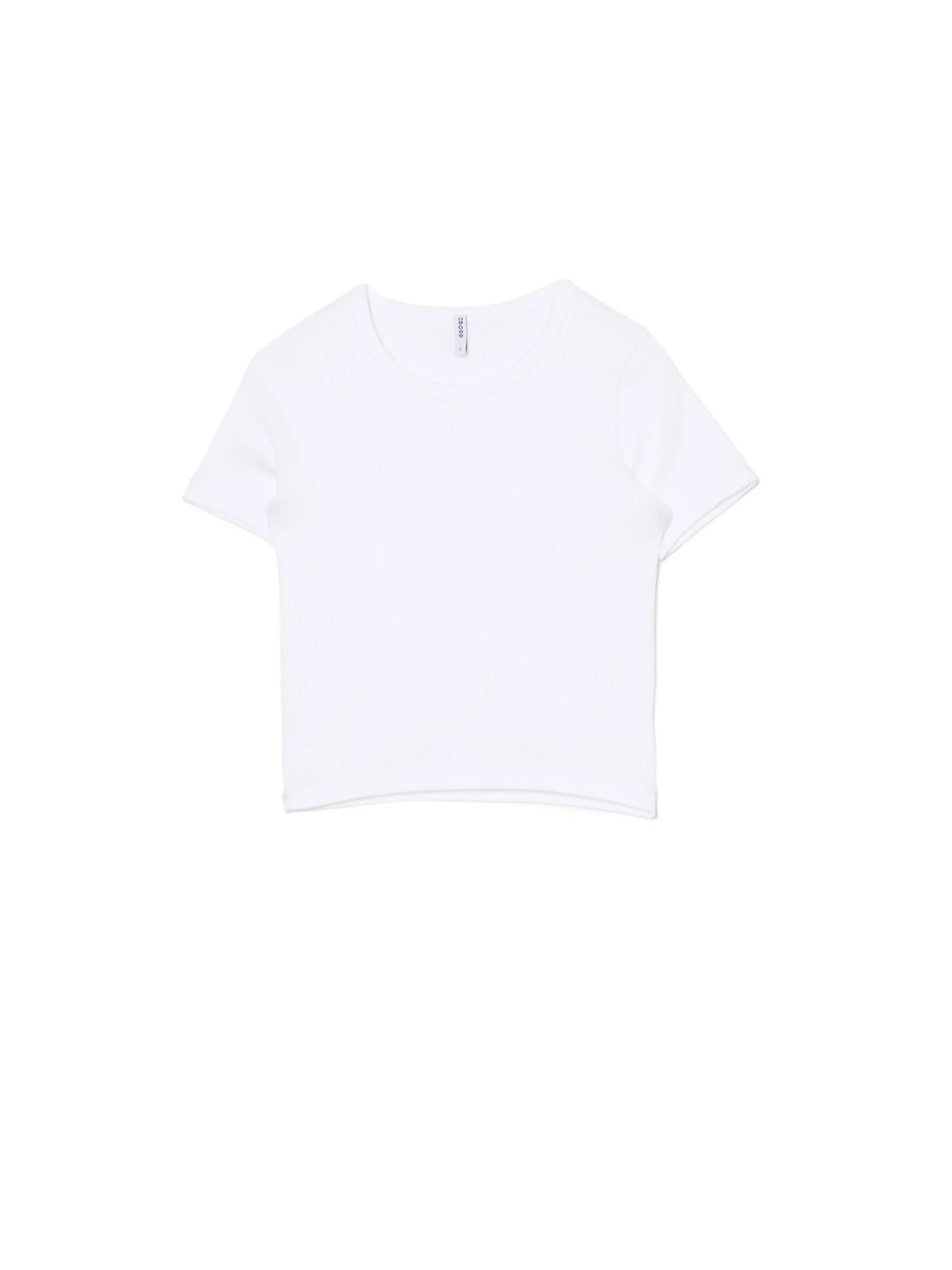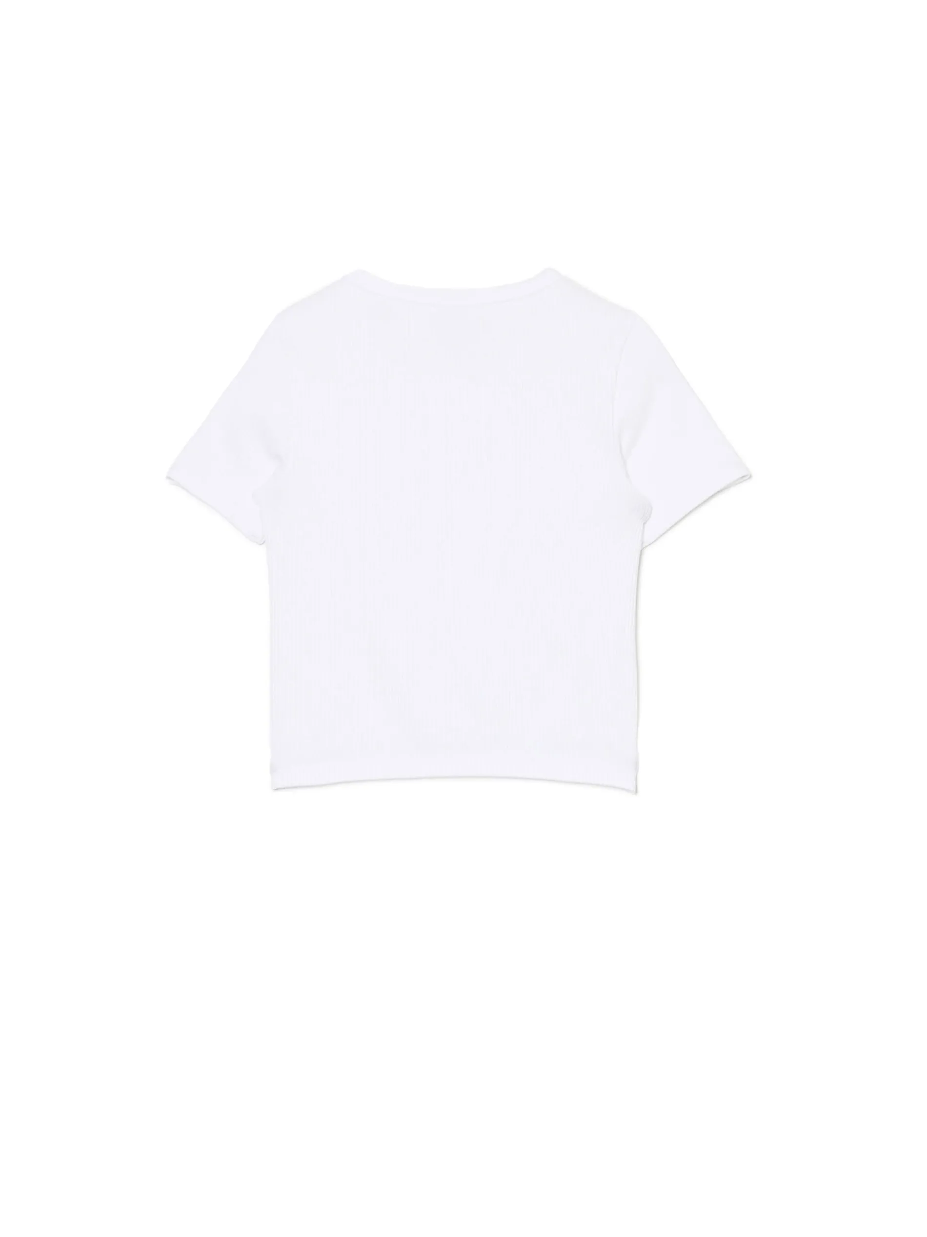 Biały damski T-shirt, uszyty z dzianiny zawierającej domieszkę elastanu. dopasowany krój krótkie, dopasowane rękawy zabudowany dekolt prążkowana faktura materiału Wzrost modelki: 172 cm