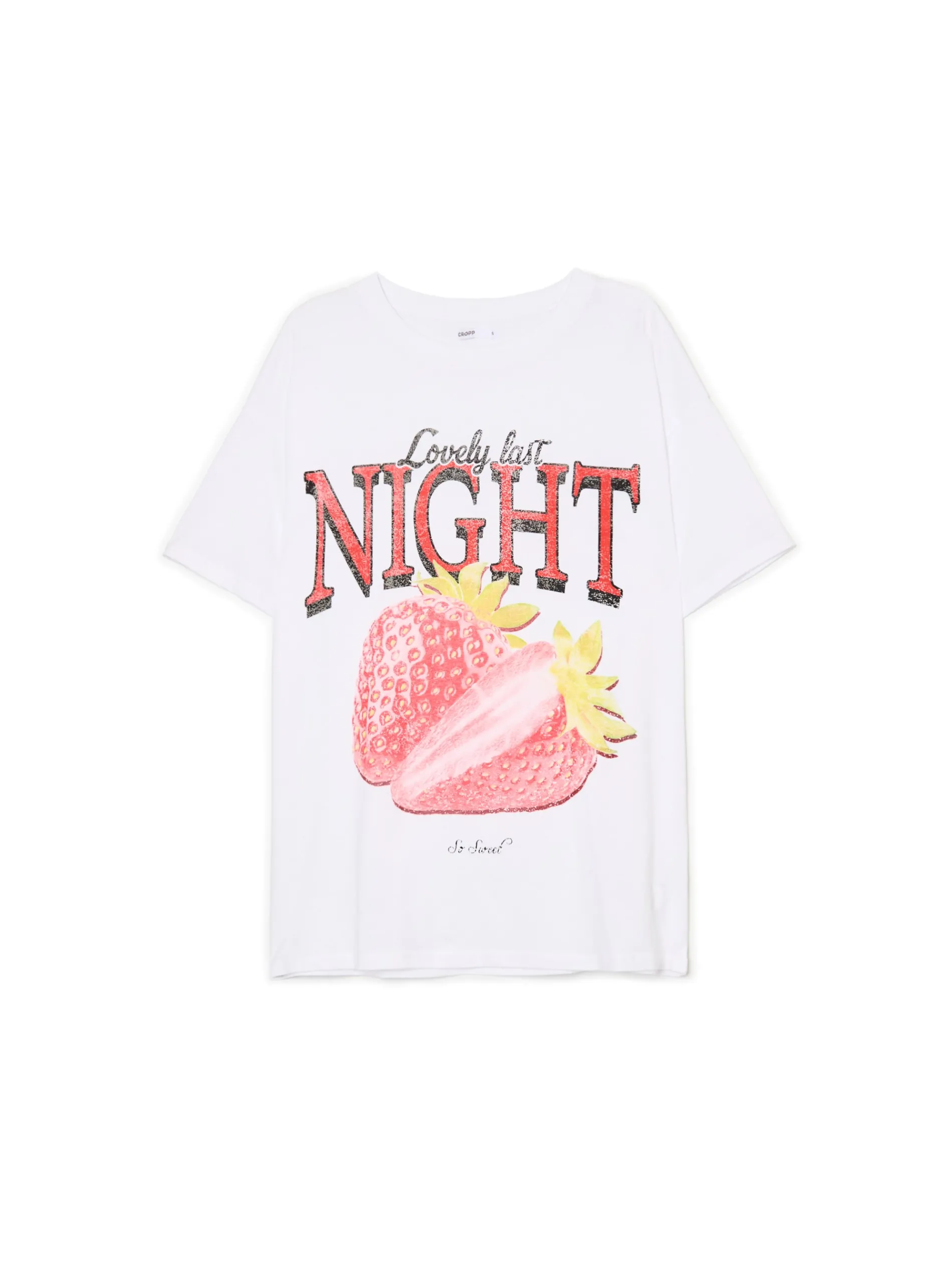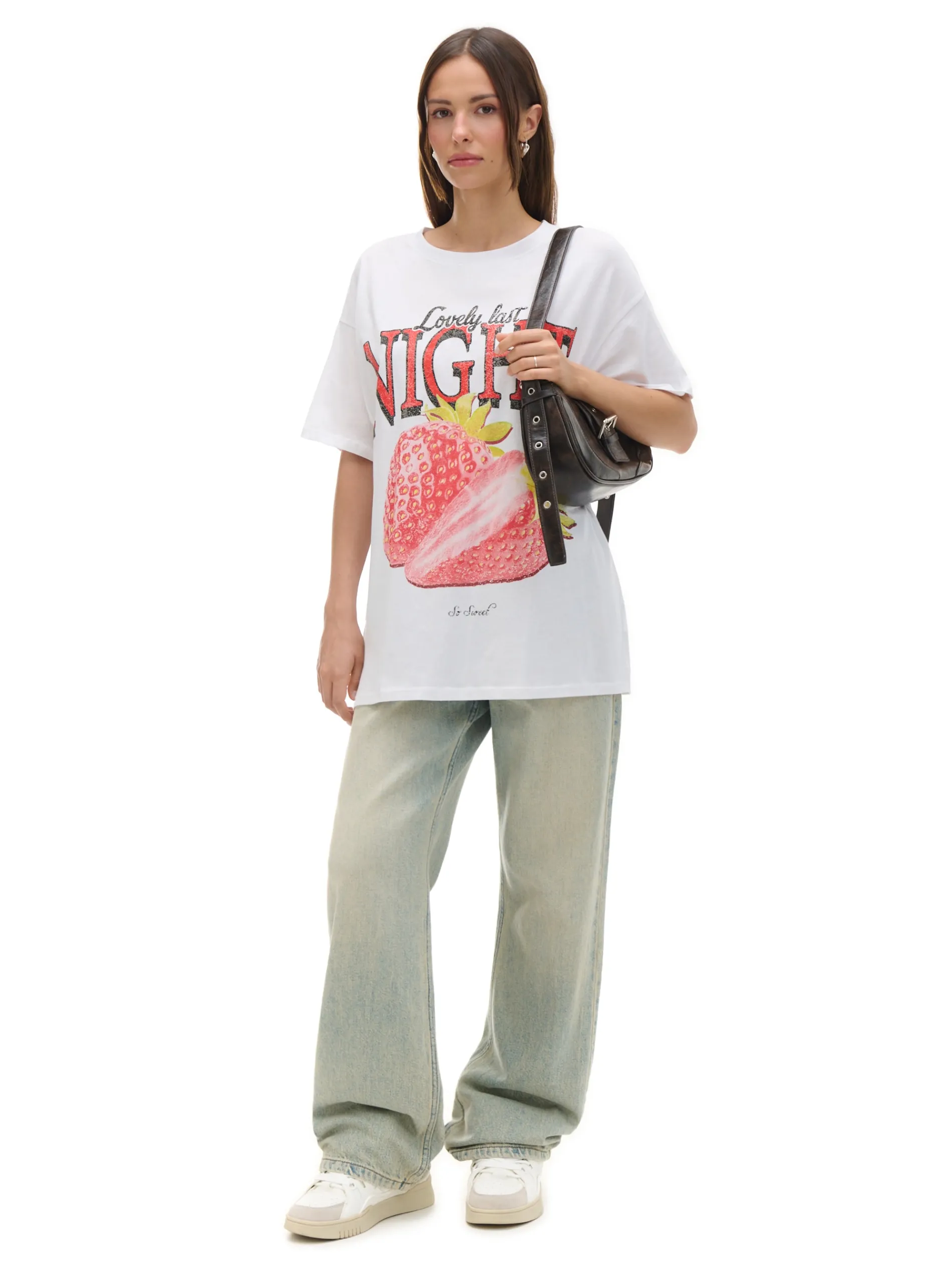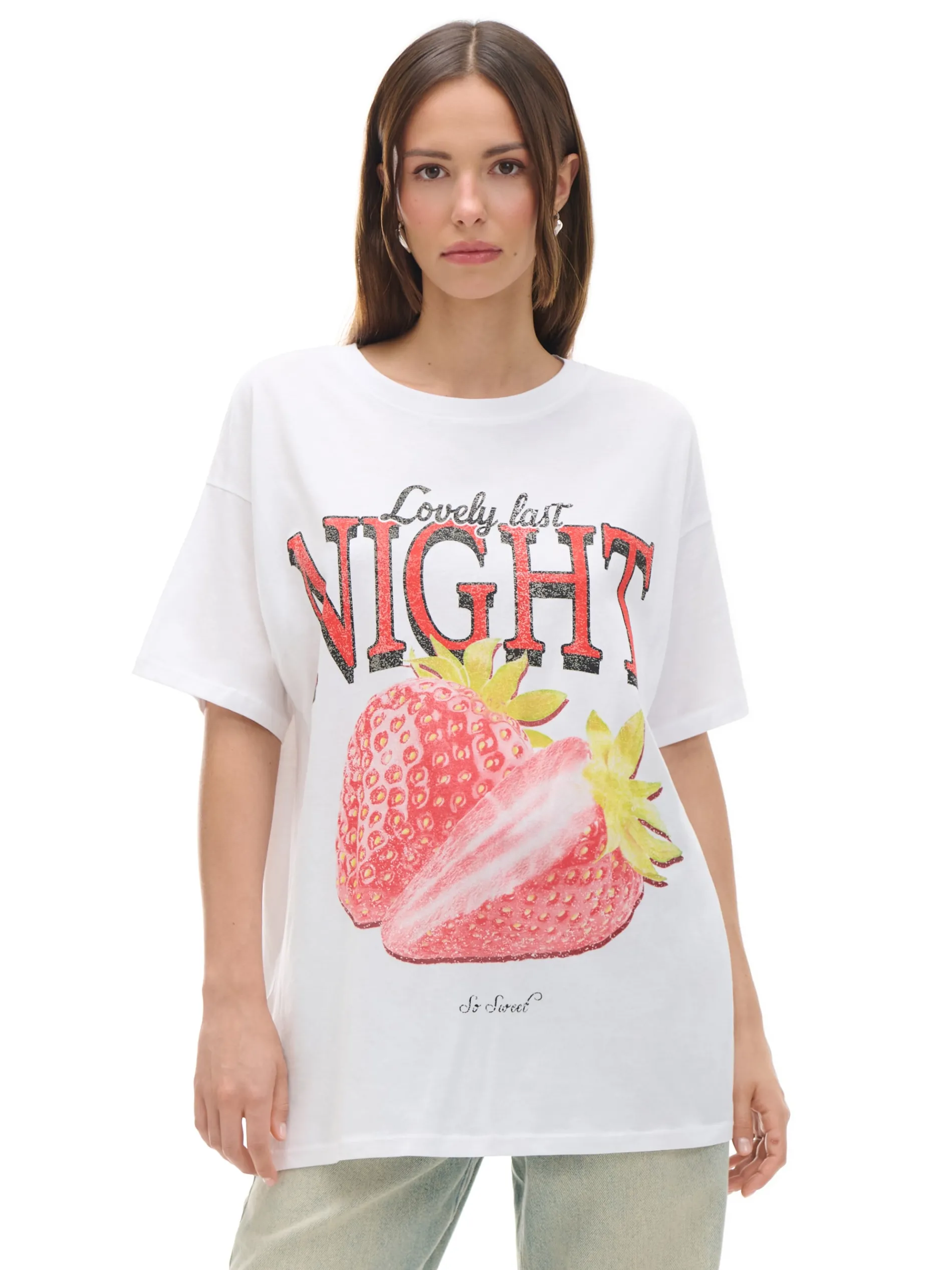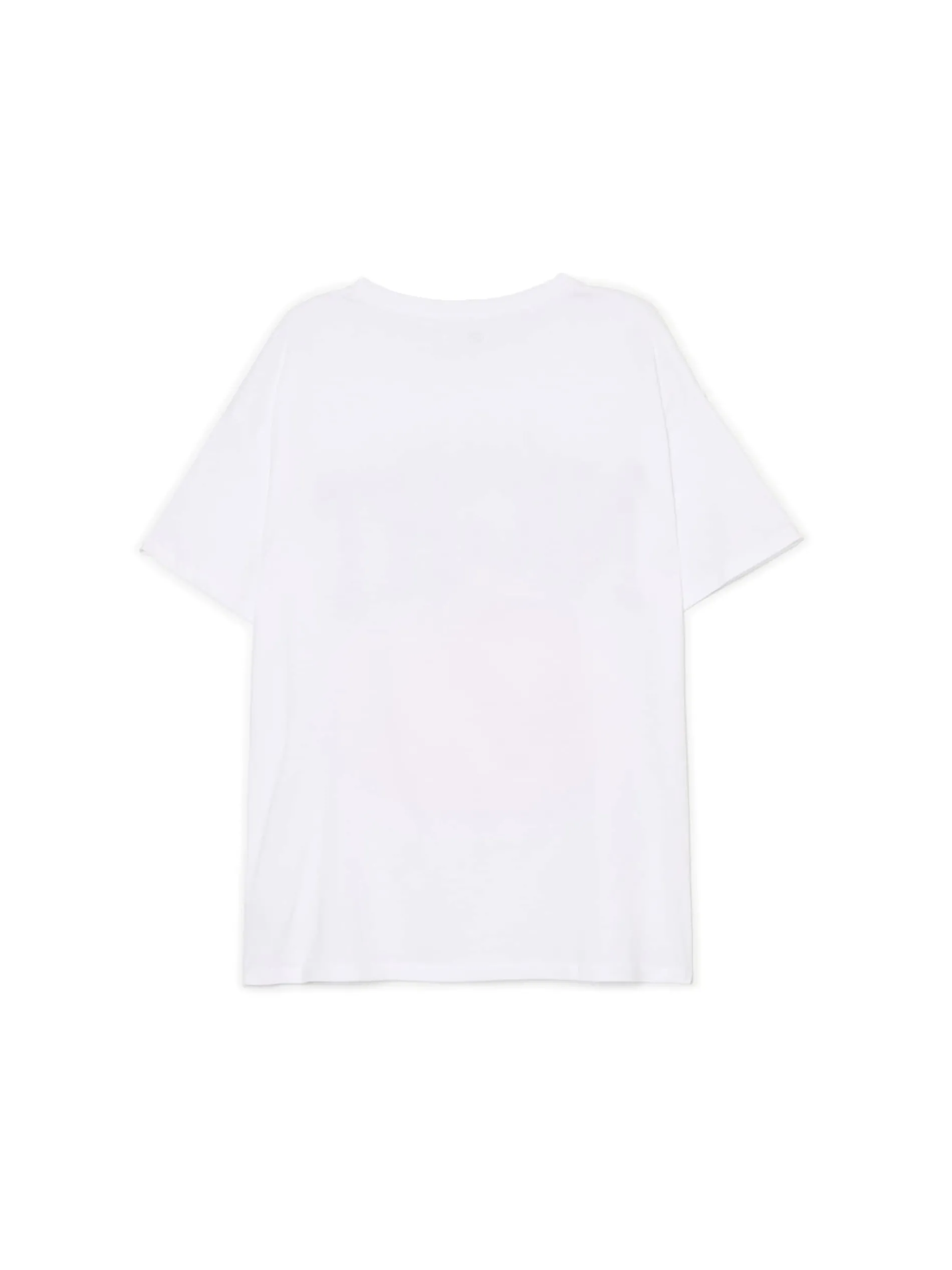 Biały damski T-shirt, uszyty w 100% z bawełny. Ozdobą tego modelu jest nadruk z delikatnym efektem sprania. 100% bawełny krój oversize krótkie, swobodne rękawy oryginalny print