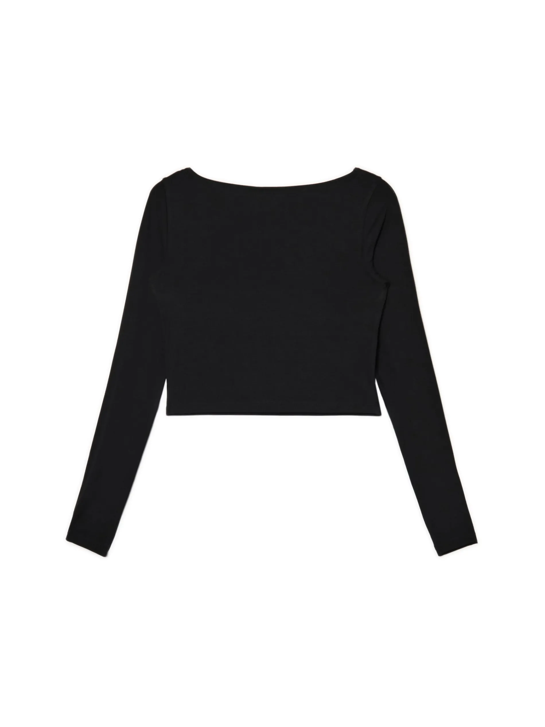 Damska bluzka z długimi rękawami o krótszym, dopasowanym fasonie z dekoltem w łódkę. Idealny item na chłodniejsze wieczory. wiskoza z domieszką elastycznych włókien dopasowany krój podkreślający sylwetkę dekolt w łódkę długie, dopasowane rękawy Wzrost modelki: 177 cm