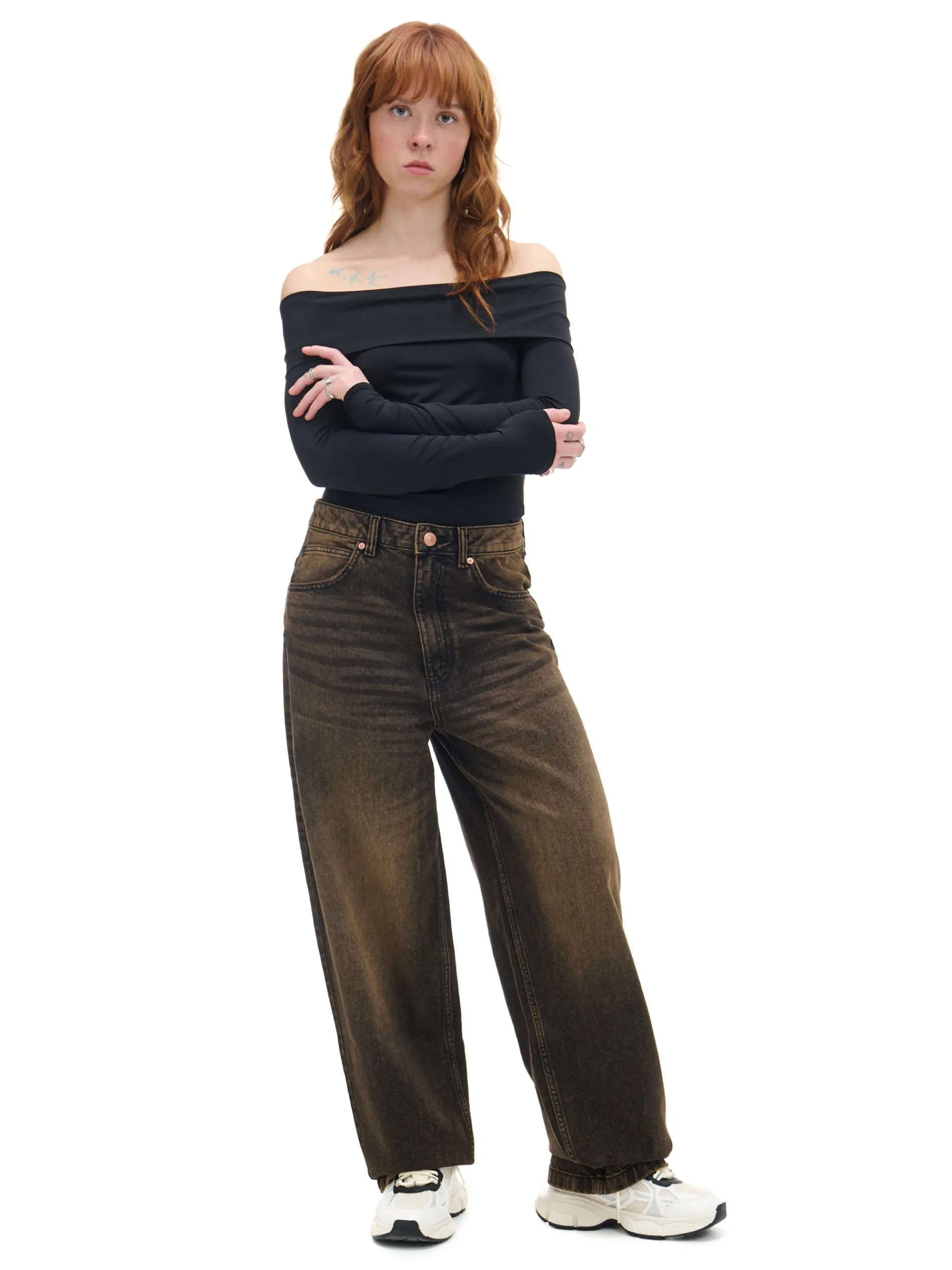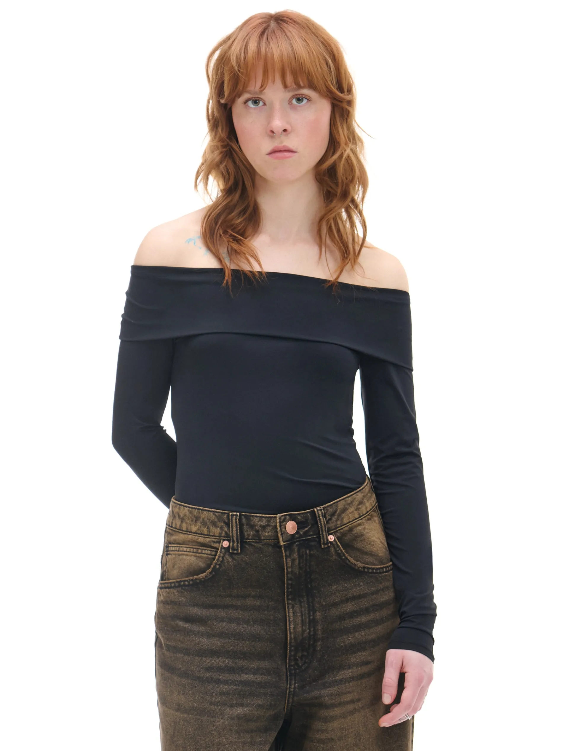 Damska bluzka typu carmen z długimi rękawami uszyta z mieszanki tkanin. Długie, wygodne rękawy i oryginalna, szeroka zakładka przy dekolcie to hity tego modelu! dzianina z dodatkiem elastycznych włókien dopasowany krój podkreślający sylwetkę dekolt typu carmen długie rękawy z obniżoną linią ramion wyraźnie zaznaczone ramiona szalowy kołnierz