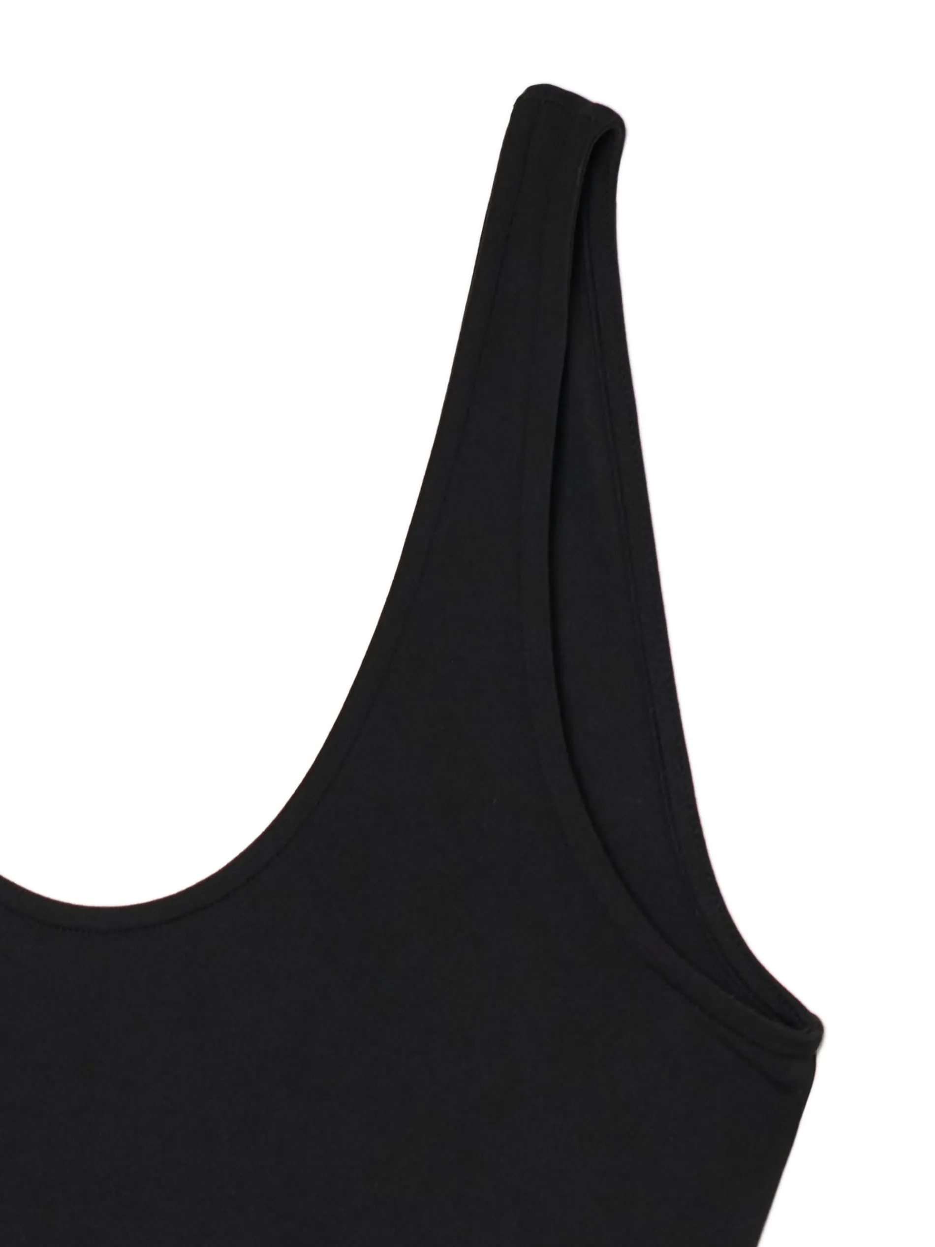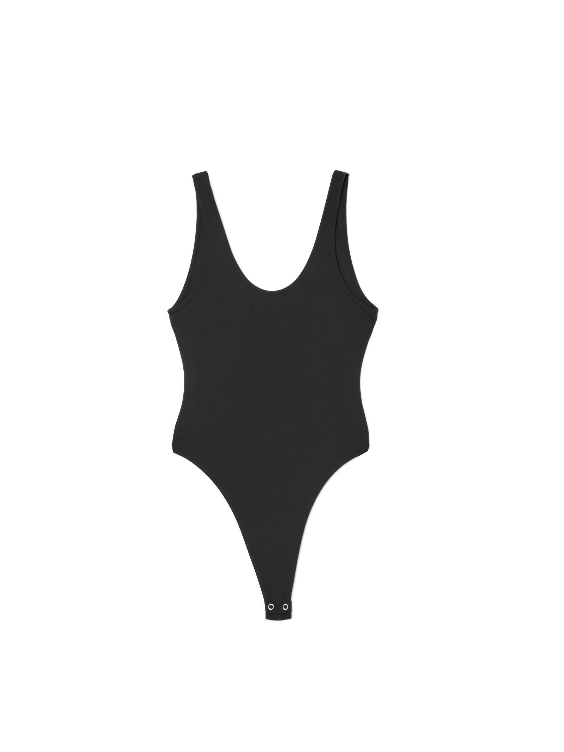 Damskie body w kolorze czarnym, uszyte z dzianiny z dodatkiem elastycznych włókien. Item do noszenia w formie soft lub jako dodatek do różnych stylizacji. dzianina z domieszką elastycznych włókien dopasowany krój podkreślający sylwetkę zapięcie na zatrzaski w kroku głęboki dekolt z przodu i na plecach na ramiączkach