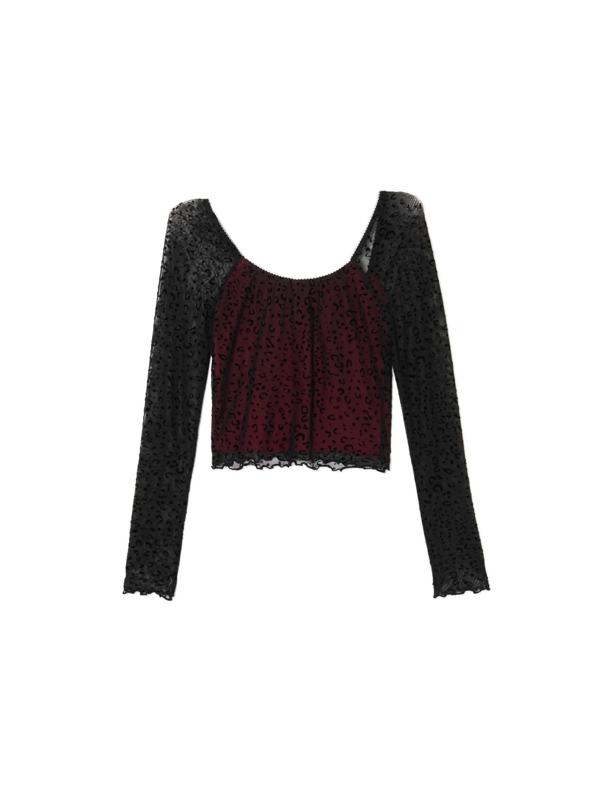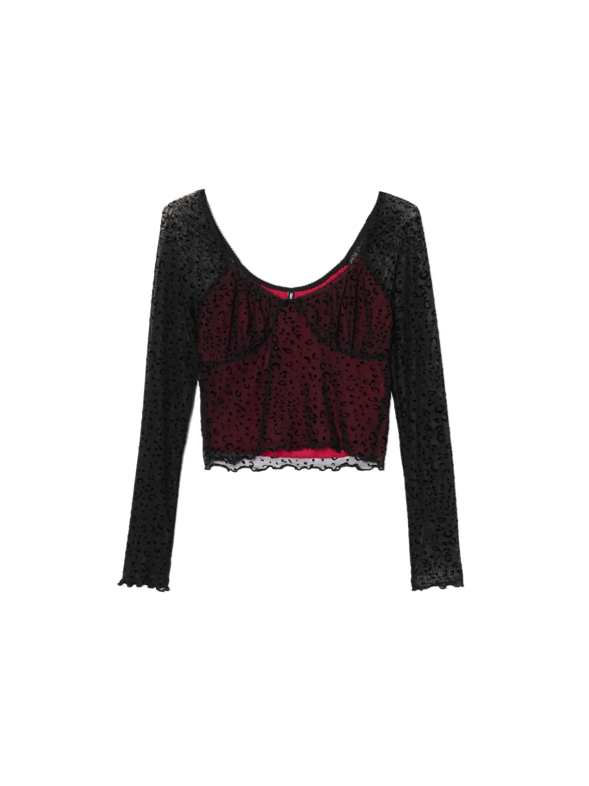Damska bluzka uszyta z półprzezroczystej dzianiny z dodatkiem elastycznych włókien. Dzięki temu item idealnie dopasowuje się do sylwetki. Ozdobą są dekoracyjne wypustki, nadruk all over i kontrastowa podszewka w czerwonym kolorze. dzianina z dodatkiem elastycznych włókien regularny krój kontrastowa, czerwona podszewka głęboki, okrągły dekolt długie, dopasowane rękawy wykończenie drobną falbanką i dekoracyjnymi wypustkami nadruk all over