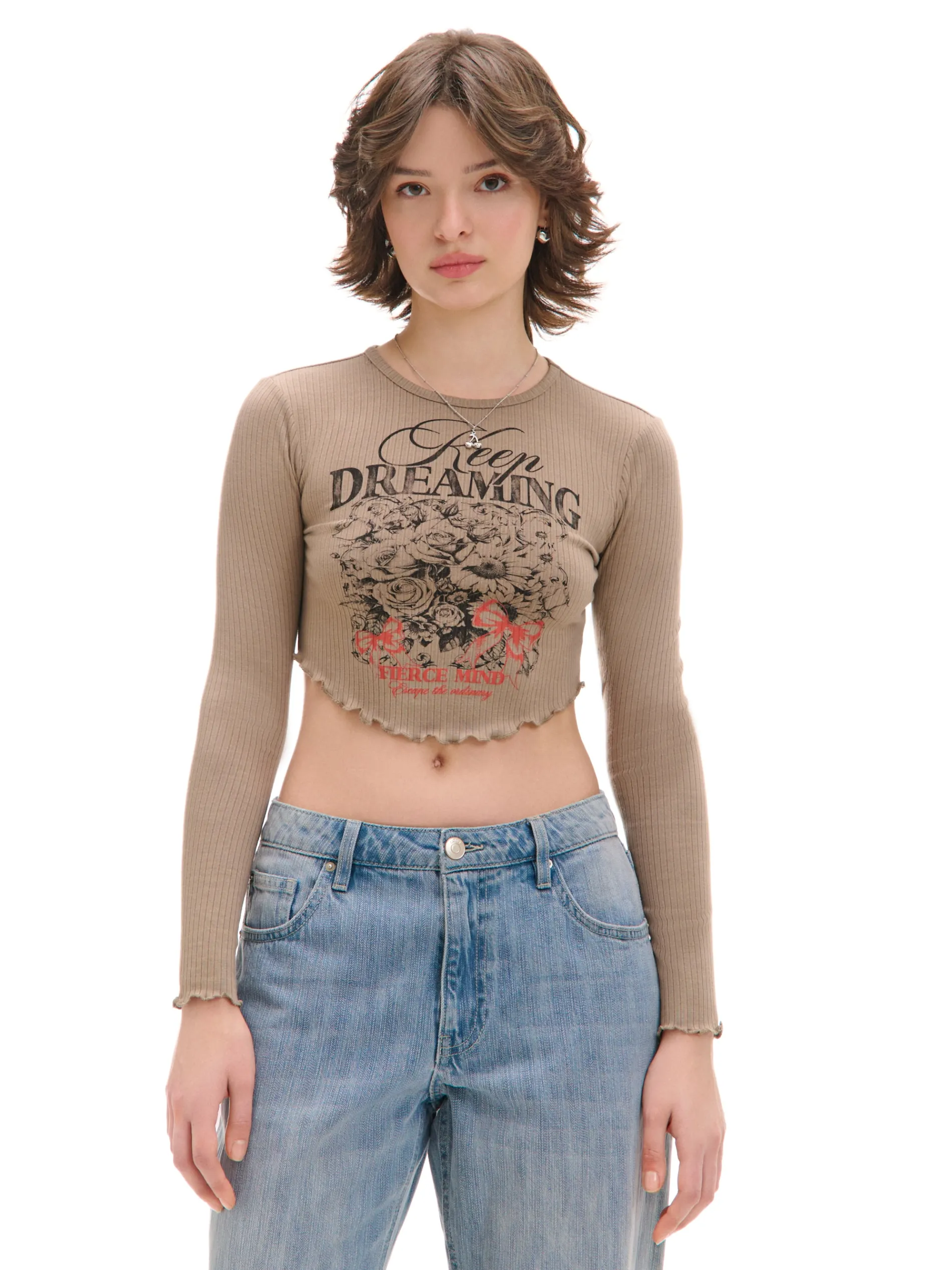 Damski T-shirt z długimi rękawami uszyty z prążkowanej dzianiny. Ozdobę stanowią marszczenia na dole i przy rękawach oraz wyjątkowy print na przodzie. Idealnie fituje z jeansami typu baggy czy skater. uszyta z prążkowanej dzianiny zawierającej wiskozę dopasowany krój podkreślający sylwetkę okrągły dekolt z lamówką długie, dopasowane rękawy dekoracyjne zakończenie brzegów ozdobne marszczenia kwiatowy wzór tekstowy nadruk z przodu