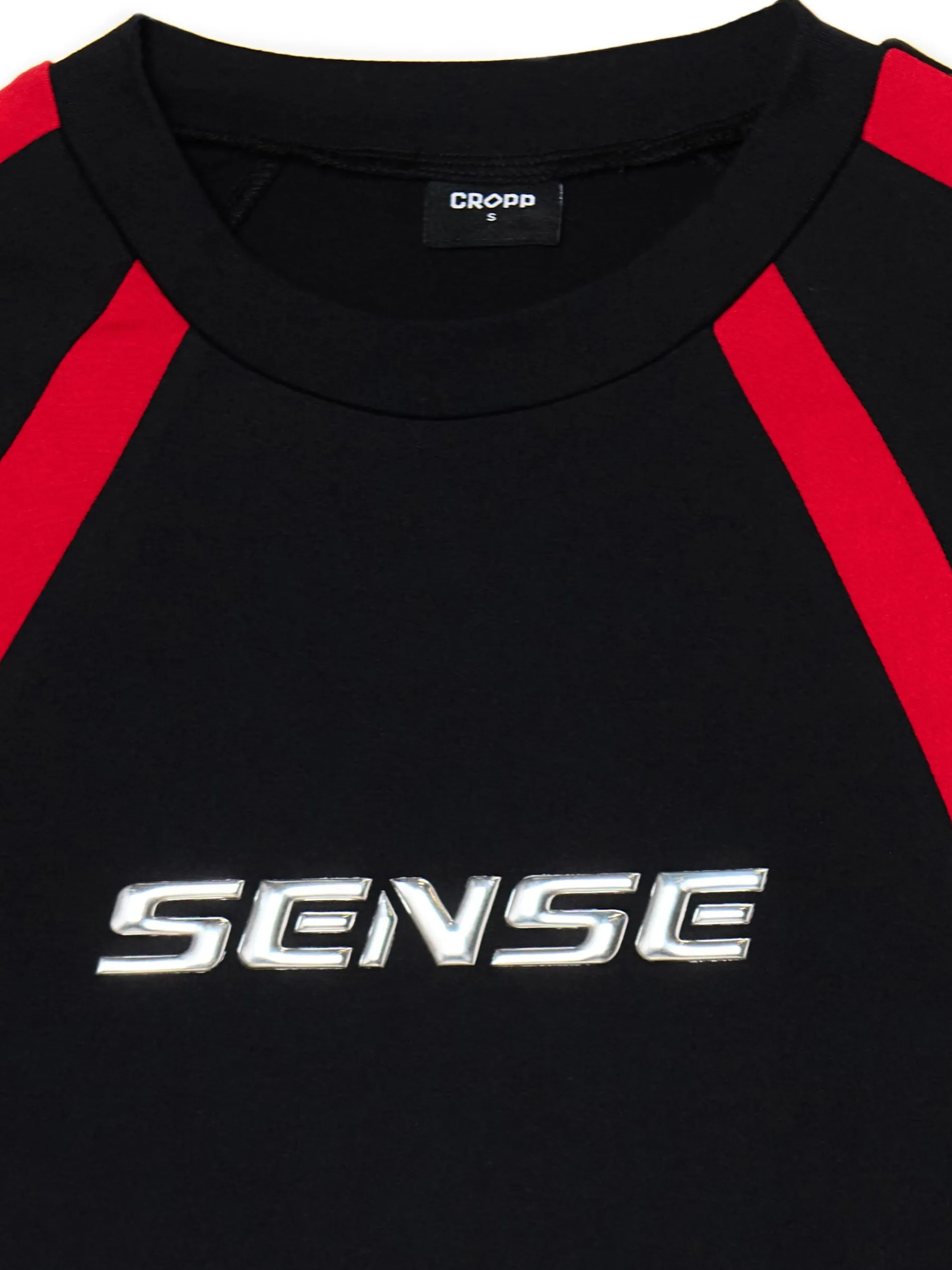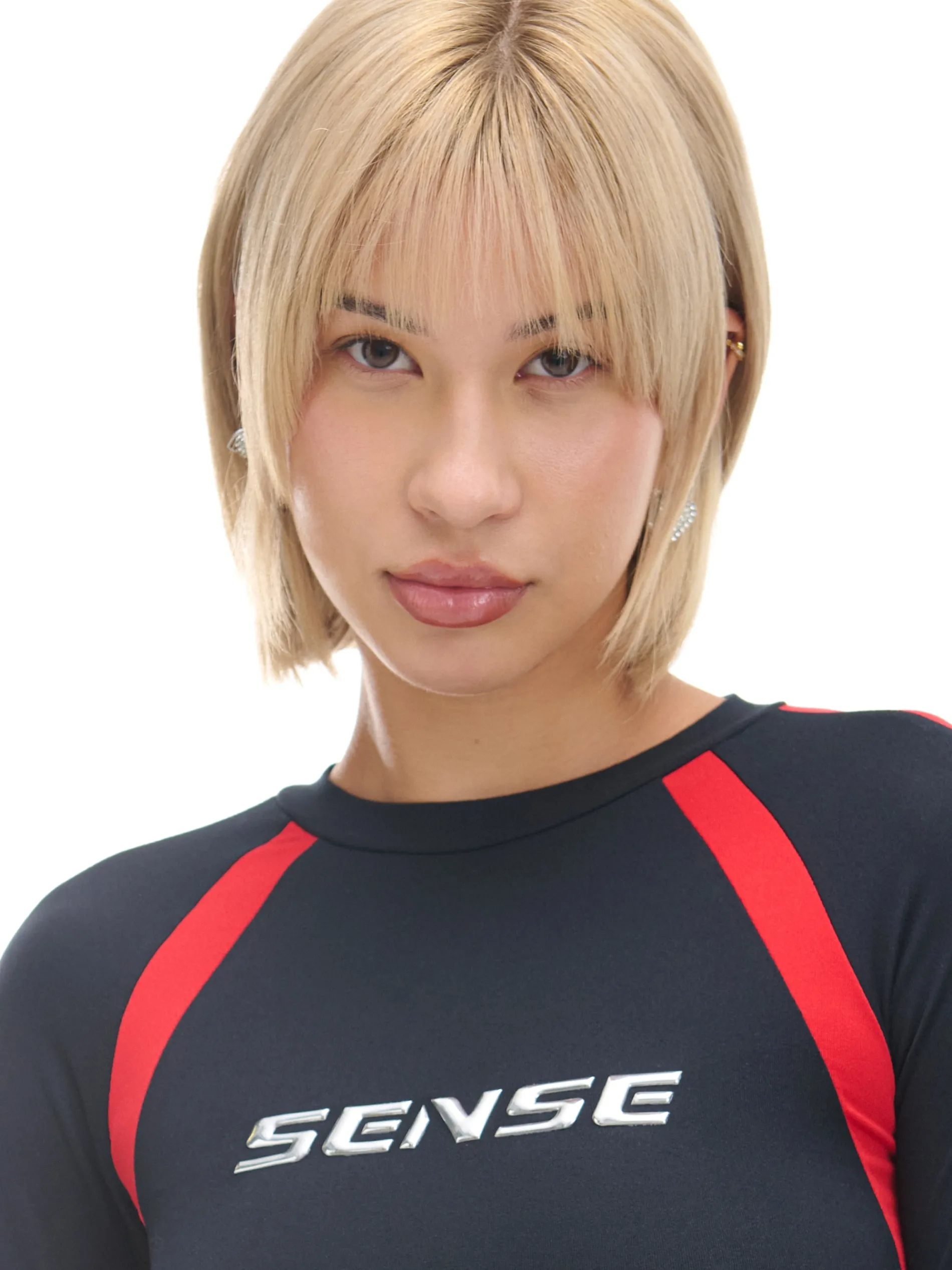 Czarno-czerwona koszulka z długim rękawem o krótszym, dopasowanym kroju. Delikatnie profilowanie na dole i charakterystyczne nadruki podkreślają jej racingowy styl. dzianina z domieszką elastycznych włókien krótki krój zabudowany, okrągły dekolt z lamówką długie, dopasowane rękawy kontrastowy nadruk tekstowy Wzrost modelki: 177 cm