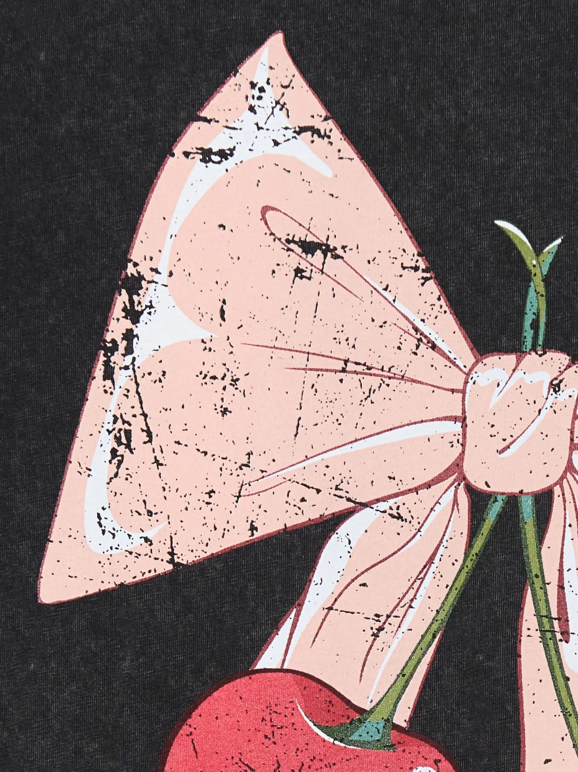 Damski T-shirt uszyty z bawełnianego materiału w kolorze czarnym z efektem sprania i dużym nadrukiem z przodu. Wrzuć wisienkę do koszyka! 100% bawełny krój oversize krótkie, swobodne rękawy oryginalny print