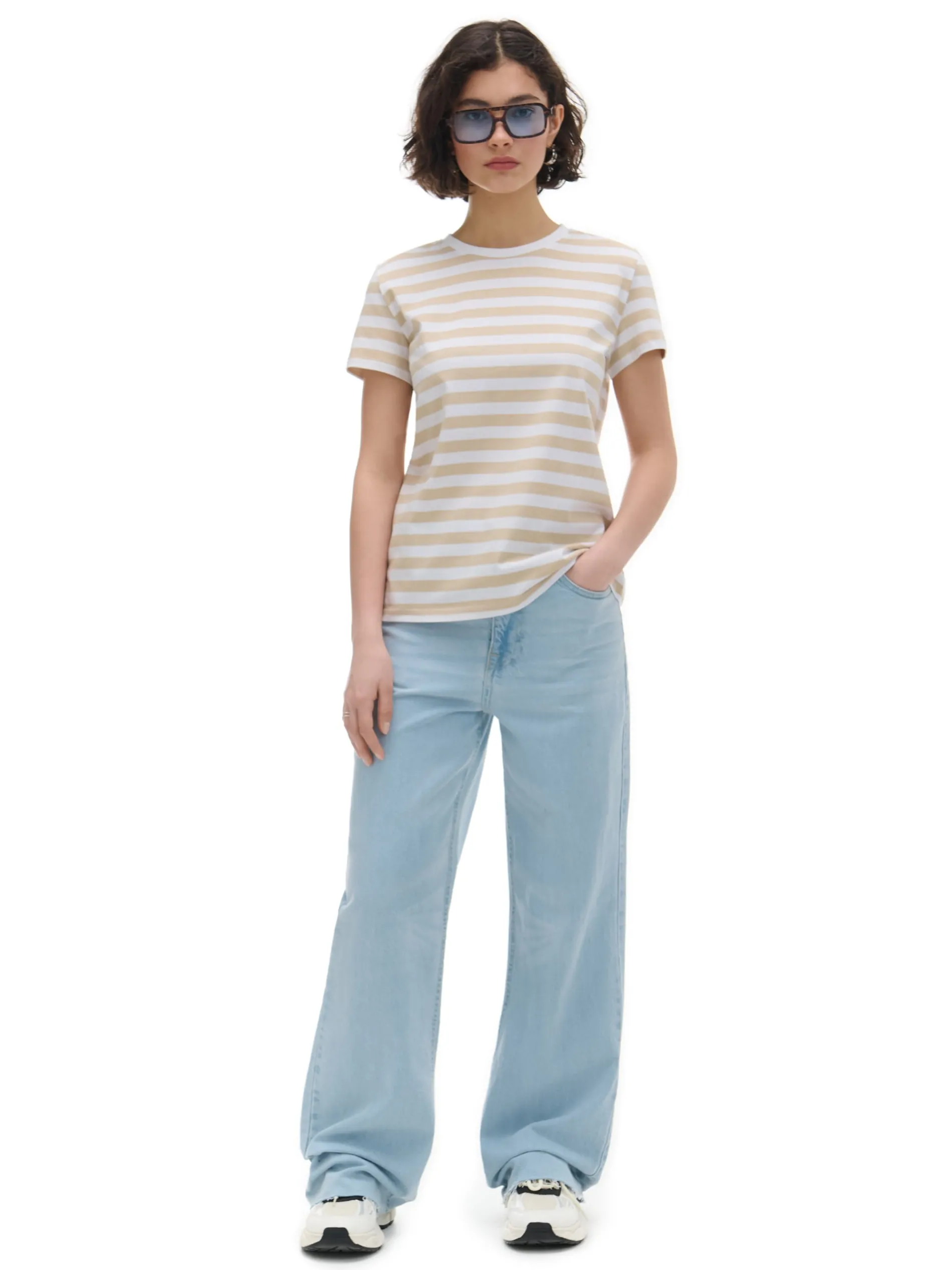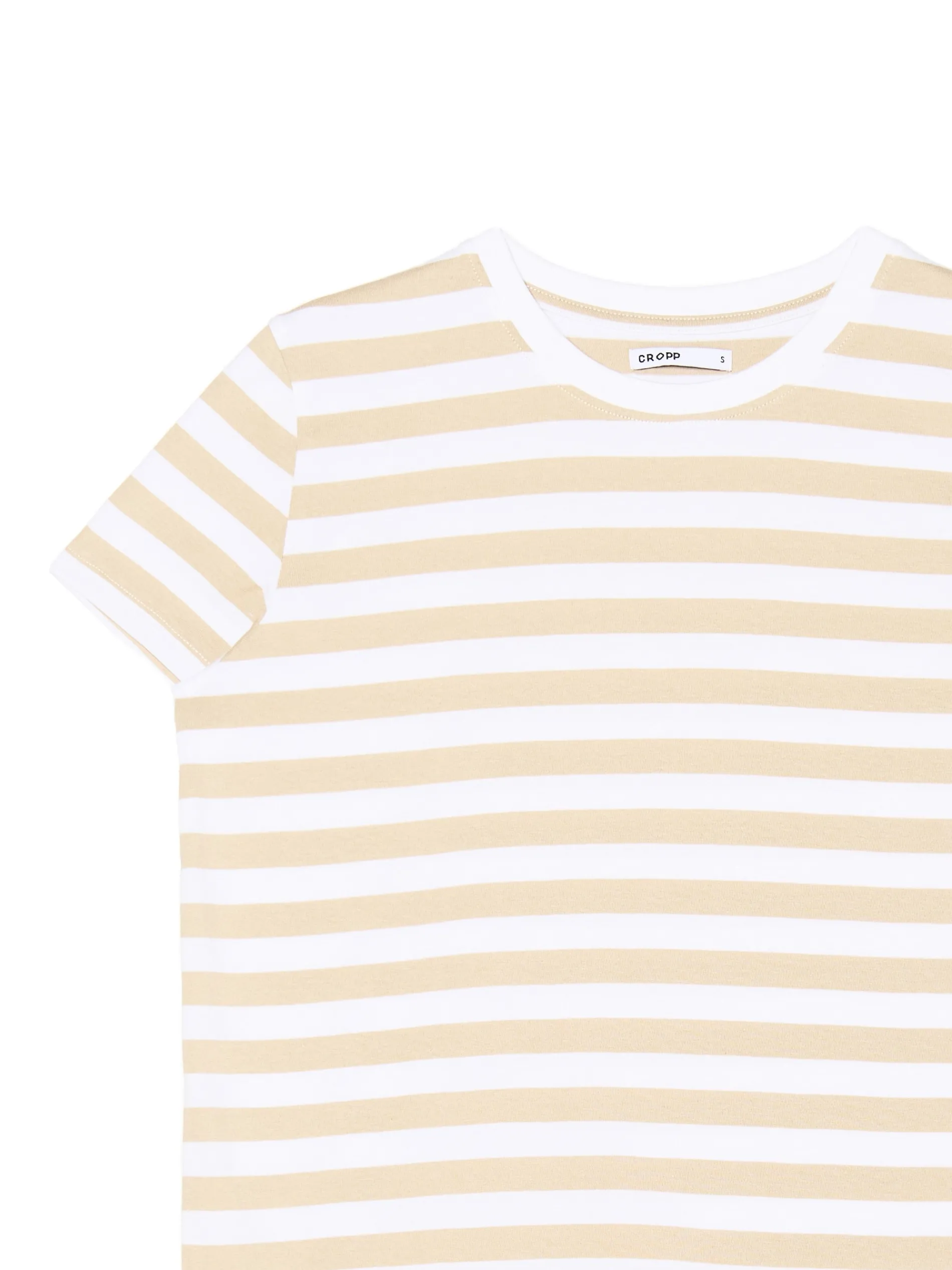 Damska koszulka o regularnym kroju, uszyta w 100% z bawełny. Na całości poziome, beżowo-białe paski. Wzrost modelki: 172 cm