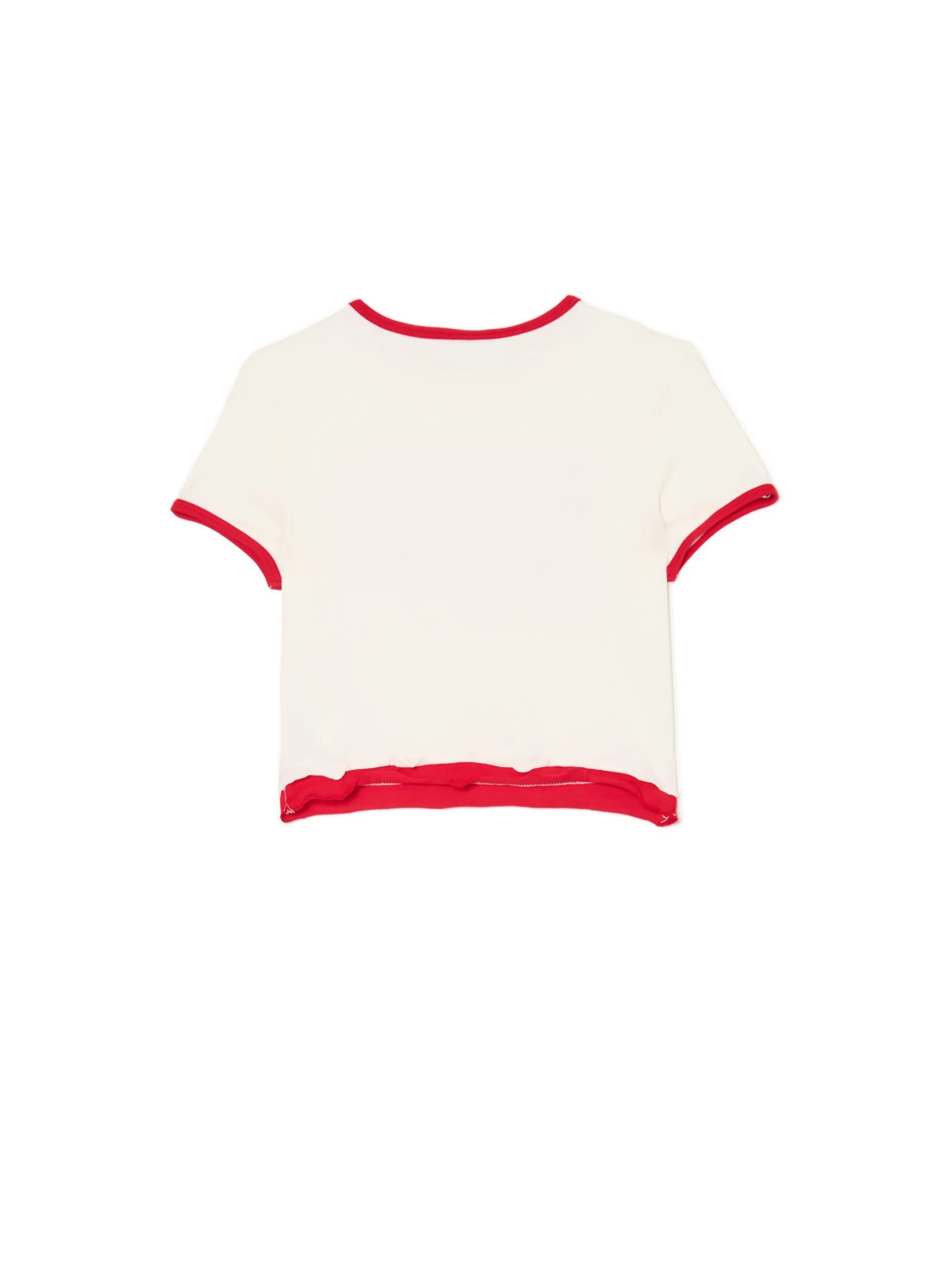 Koszulka damska o dopasowanym kroju, uszyta z elastycznej mieszanki dzianin. Ten model z surowym wykończeniem brzegów i kontrastowym nadrukiem wyróżni Cię w tłumie. bawełna z dodatkiem elastycznych włókien dopasowany krój podkreślający sylwetkę okrągły dekolt krótkie, swobodne rękawy kontrastowe wykończenie lamówką surowe wykończenie brzegów duży nadruk z przodu